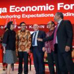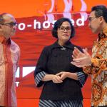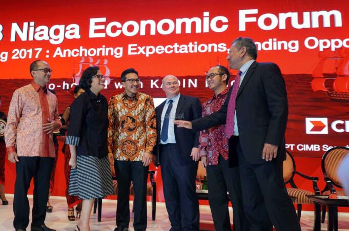 (dari kiri ke kanan) Ketua Umum Kadin Indonesia, Rosan P Roslani, Menteri Keuangan, Sri Mulyani Indrawati, Presiden Direktur CIMB Niaga, Tigor M Siahaan, serta Head of Asia Pacific Fixed Income Product Startegy, BlackRock's Active Investment Group, Gregor Carle, Pengamat Politik, Yunarto Wijaya, serta Chief Economist CIMB Niaga Group, Arup Raha bebincang seusai menjadi pembicara dalam CIMB Niaga Economic Forum 2017 di Jakarta, Kamis (26/1). CIMB Niaga bekerjasama dengan Kamar Dagang dan Industri (Kadin) Indonesia menyelenggarakan CIMB Niaga Economic Forum 2017 dengan tema "Navigating 2017 : Anchoring Expectations, Finding Opportunities. Forum yang dipersembahkan untuk para nasabah CIMB Niaga ini diharapkan dapat memberikan wawasan terbaru mengenai kondisi perekonomian terkini dan ekspektasi serta tantangan selama setahun ke depan. Diharapkan dengan demikian nasabah bisa memetakan peluang yang ada untuk menumbuh kembangkan binisnya secara berkelanjutan.Tampil sebagai penutup sambutan adalah Menteri Keuangan, Sri Mulyani Indrawati.