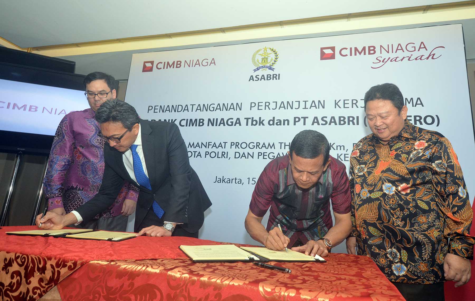 Presiden Direktur PT Bank CIMB Niaga Tbk (CIMB Niaga), Tigor M Siahaan (kedua dari kiri) dan Direktur Utama PT ASABRI (persero), Sonny Widjaja (kedua dari kanan) disaksikan Direktur Strategy and Finance CIMB Niaga, Wan Razly (kiri) dan Direktur Investasi dan Keuangan PT ASABRI, Hari Setianto saat melakukan penandatangan perjanjian kerjasama di Jakarta, Senin (15/8). CIMB Niaga menandatangai perjanjian kerja sama dengan ASABRI (Persero) dalam hal pembayaran pensiun prajurit TNI, Anggota Polri dan Aparatur sipil negara (ASN) Kemenham/Polri yang berada di bawah kelolaan ASABRI. Kerja sama ini merupakan kelanjutan dari kemitraan serupa yang sudah dilakukan sejak tahun 2012 dan tahun ini diperluas dalam hal pembayaran manfaat asuransi prajurit TNI, Polri,ASN Kemenham/Polri melalui layanan perbankan CIMB Niaga
