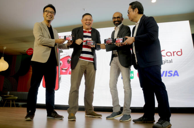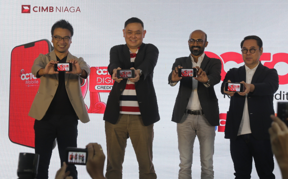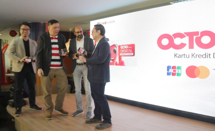 Direktur Consumer Banking CIMB Niaga Noviady Wahyudi (kedua kiri) bersama Presiden Direktur PT JCB International Indonesia Takumi Takahashi (kiri), Country Manager Indonesia Mastercard Navin Jain (kedua kanan), dan Presiden Direktur PT Visa Worldwide Indonesia Riko Abdurrahman (kanan) meluncurkan Kartu Kredit Digital OCTO Card di Jakarta, Rabu (22/6/2022).