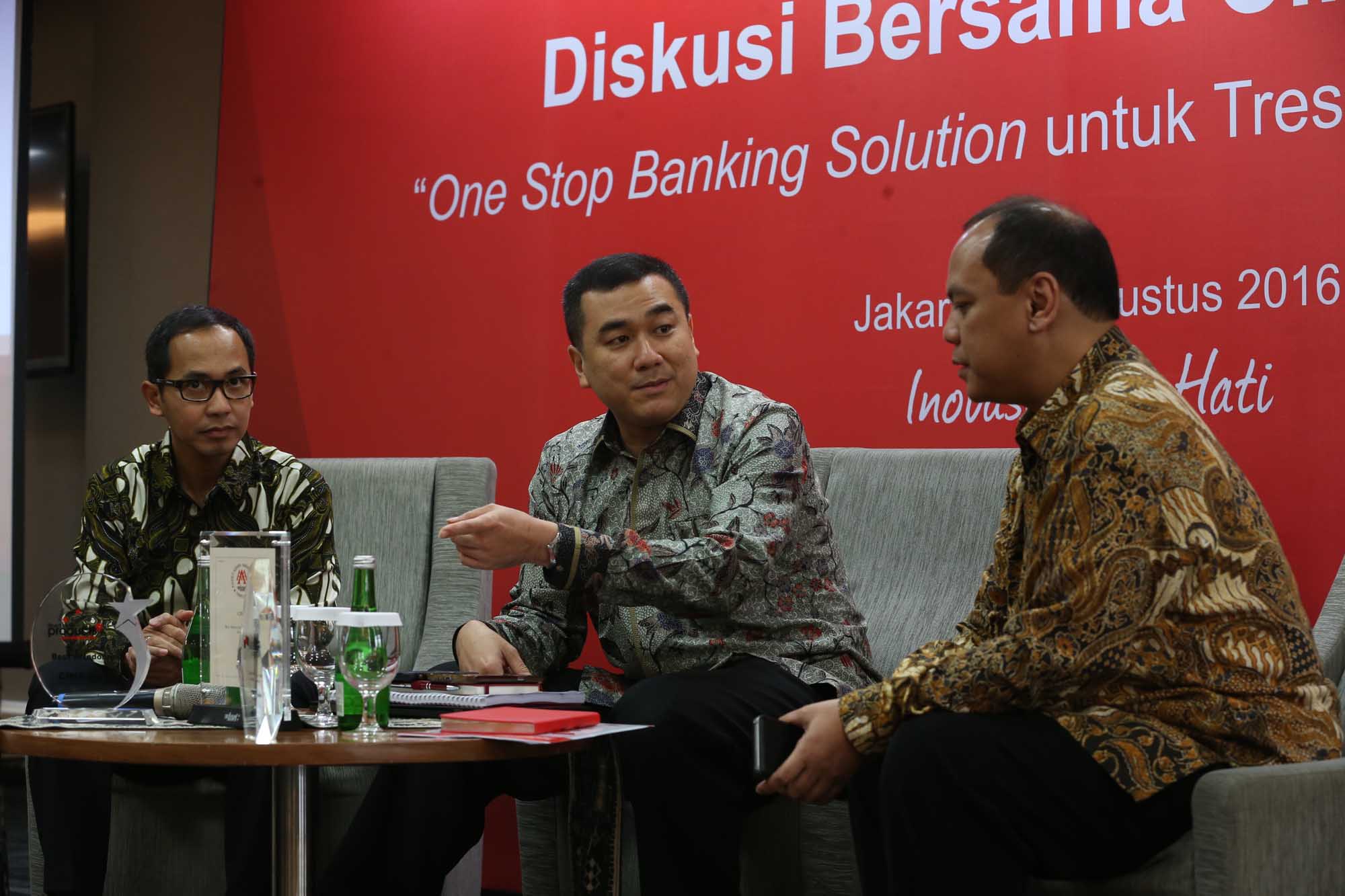 Direktur Treasury & Capital Market PT Bank CIMB Niaga John Simon (tengah), bersama Head of Brand Marketing & Communication Slamet Sudjono (kiri) serta Structured & Banking Product Head Hendriono (kanan) menjadi pembicara dalam diskusi Penguatan Bisnis Tresuri dan Pasar Modal, Jakarta, Rabu (31/8). Pembicara memaparkan tren perbankan menuju “one-stop banking solution” dalam bidang Tresuri dan Pasar Modal, dengan memenuhi kebutuhan nasabah baik korporasi maupun ritel melalui inovasi produk dan pengembangan layanan digital banking untuk kemudahan dalam transaksi.
