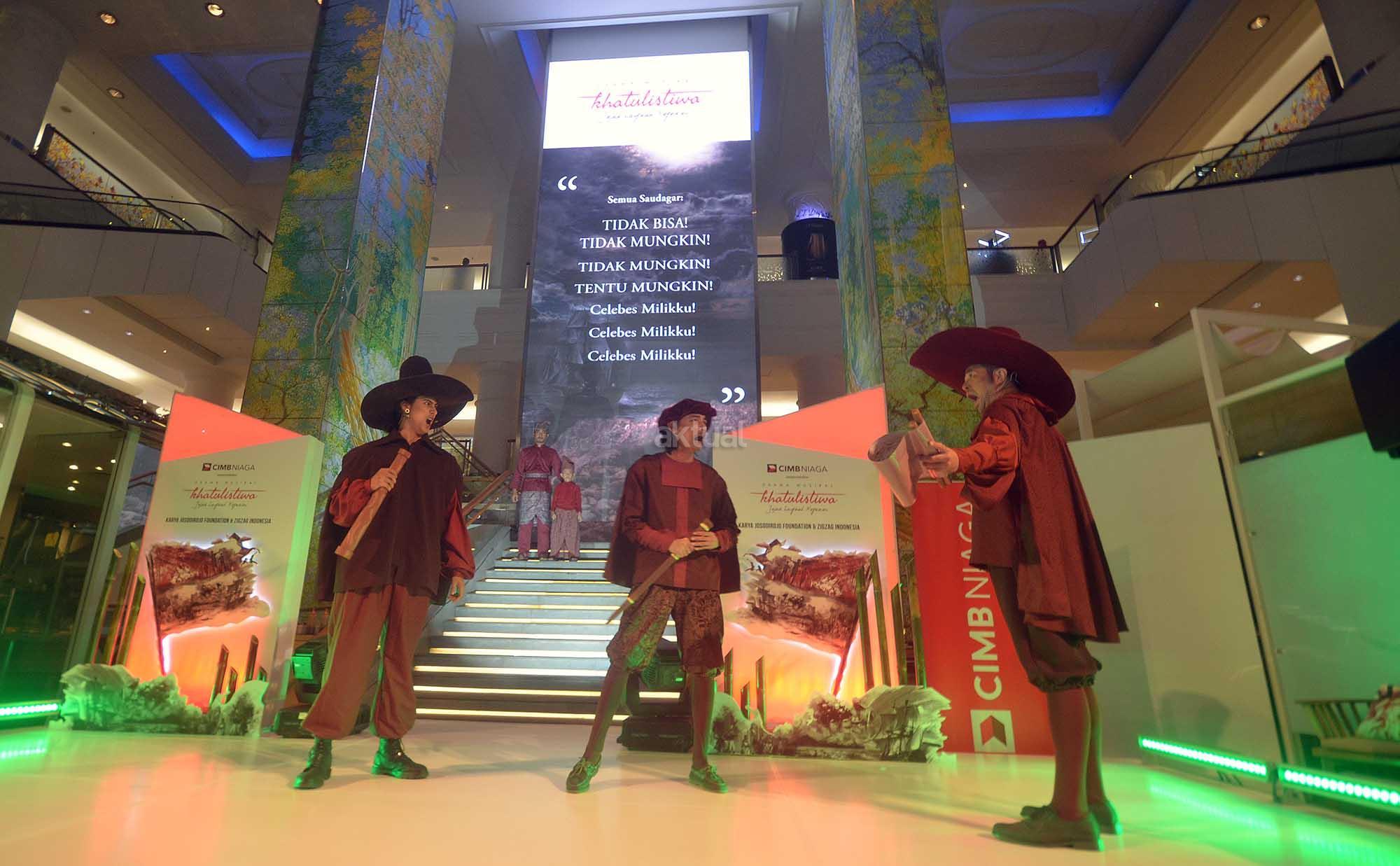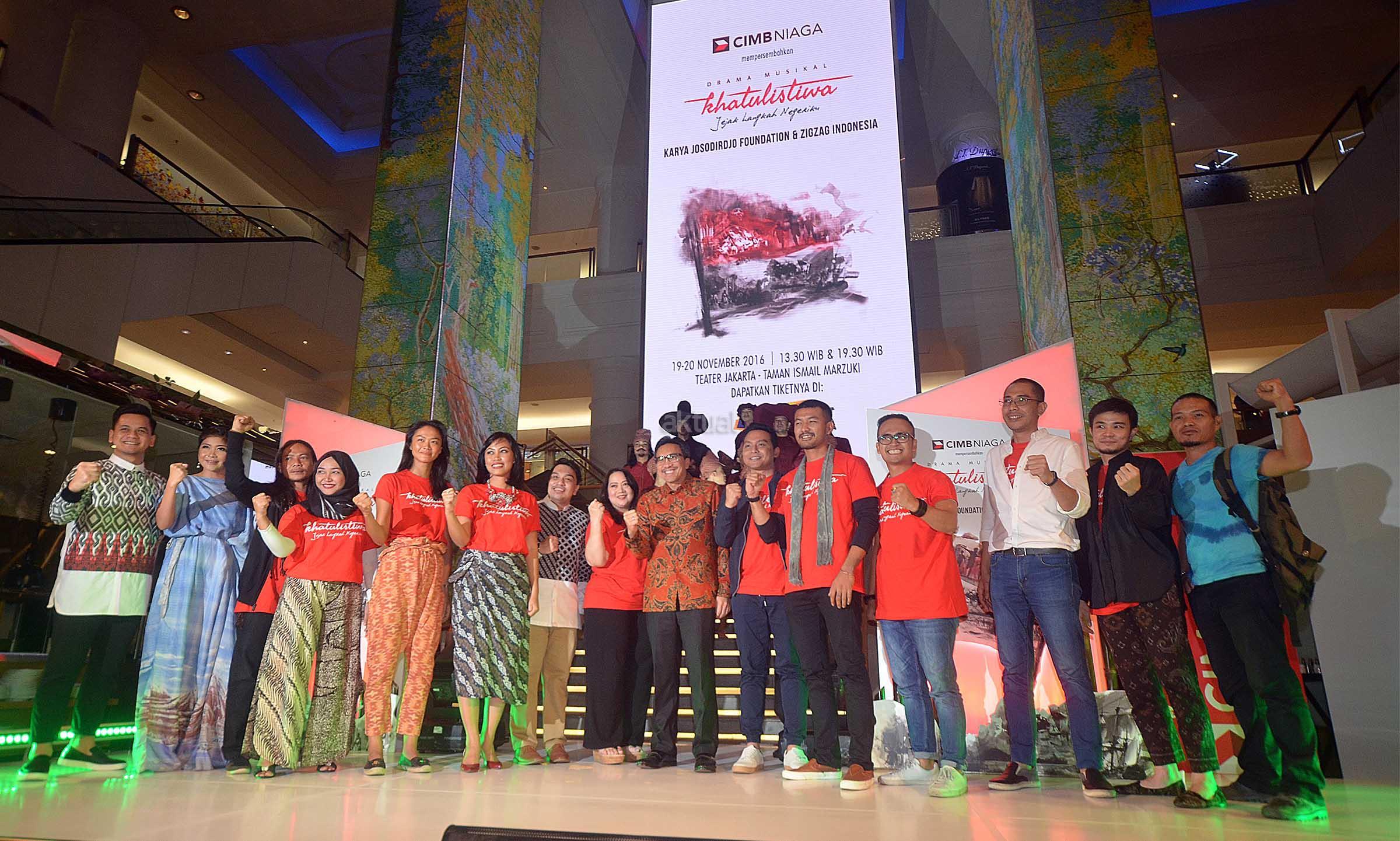 Pendukung acara melakukan cuplikan performance drama musikal disela jumpa media massa dan blogger di Jakarta, Selasa (4/10).Dalam rangka memaknai Hari Pahlawan Nasional yang jatuh pada bulan November mendatang PT Bank CIMB Niaga Tbk bersama Josodirdjo Foundation dan ZigZag Indonesia tergerak mengajak masyarakat Indonesia,khususnya generasi muda,untuk lebih mengenal jejak langkah negerinya dengan mempersembahkan sebuah inisiatif sosial berupa drama musikal bertajuk Khatulistiwa yang akan dipentaskan pada 18-20 November 2016 di Teater Jakarta Taman Ismail Marzuki,Jakarta.
