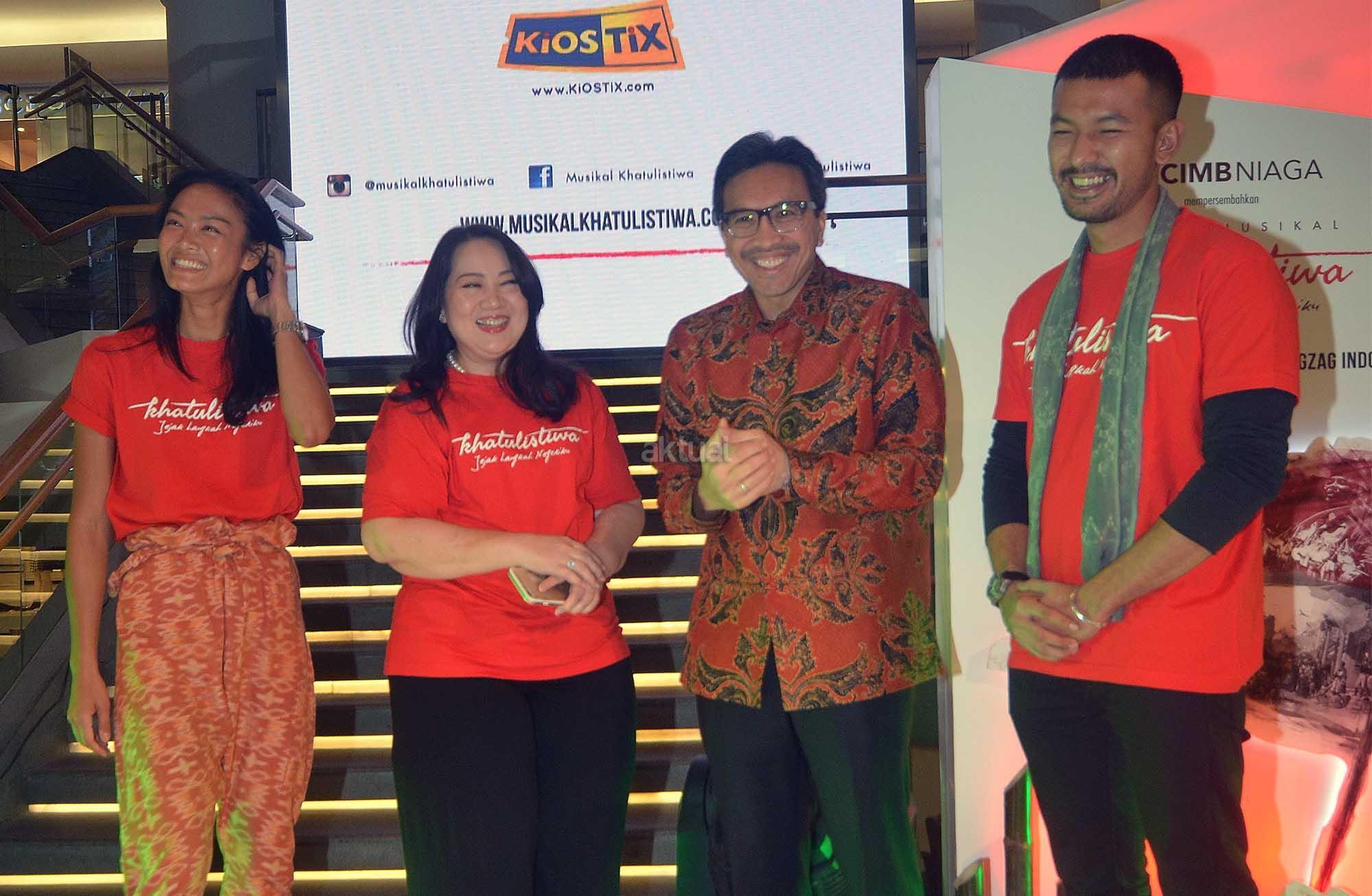 Presiden Direktur PT Bank CIMB Niaga Tbk, Tigor M Siahaan (kedua dari kanan) berbincang dengan (dari kiri ke kanan) Aktris Pendukung Drama Musikal Khatulistiwa, Kelly Tandiono, Pendiri Josodirdjo Foundation & ZigZag Indonesia, Tiara Josodirdjo, serta Aktor pendukung Drama musikal Khatulistiwa,Rio Dewanto disela jumpa media massa dan blogger di Jakarta, Selasa (4/10).Dalam rangka memaknai Hari Pahlawan Nasional yang jatuh pada bulan November mendatang PT Bank CIMB Niaga Tbk bersama Josodirdjo Foundation dan ZigZag Indonesia tergerak mengajak masyarakat Indonesia,khususnya generasi muda,untuk lebih mengenal jejak langkah negerinya dengan mempersembahkan sebuah inisiatif sosial berupa drama musikal bertajuk Khatulistiwa yang akan dipentaskan pada 18-20 November 2016 di Teater Jakarta Taman Ismail Marzuki,Jakarta.