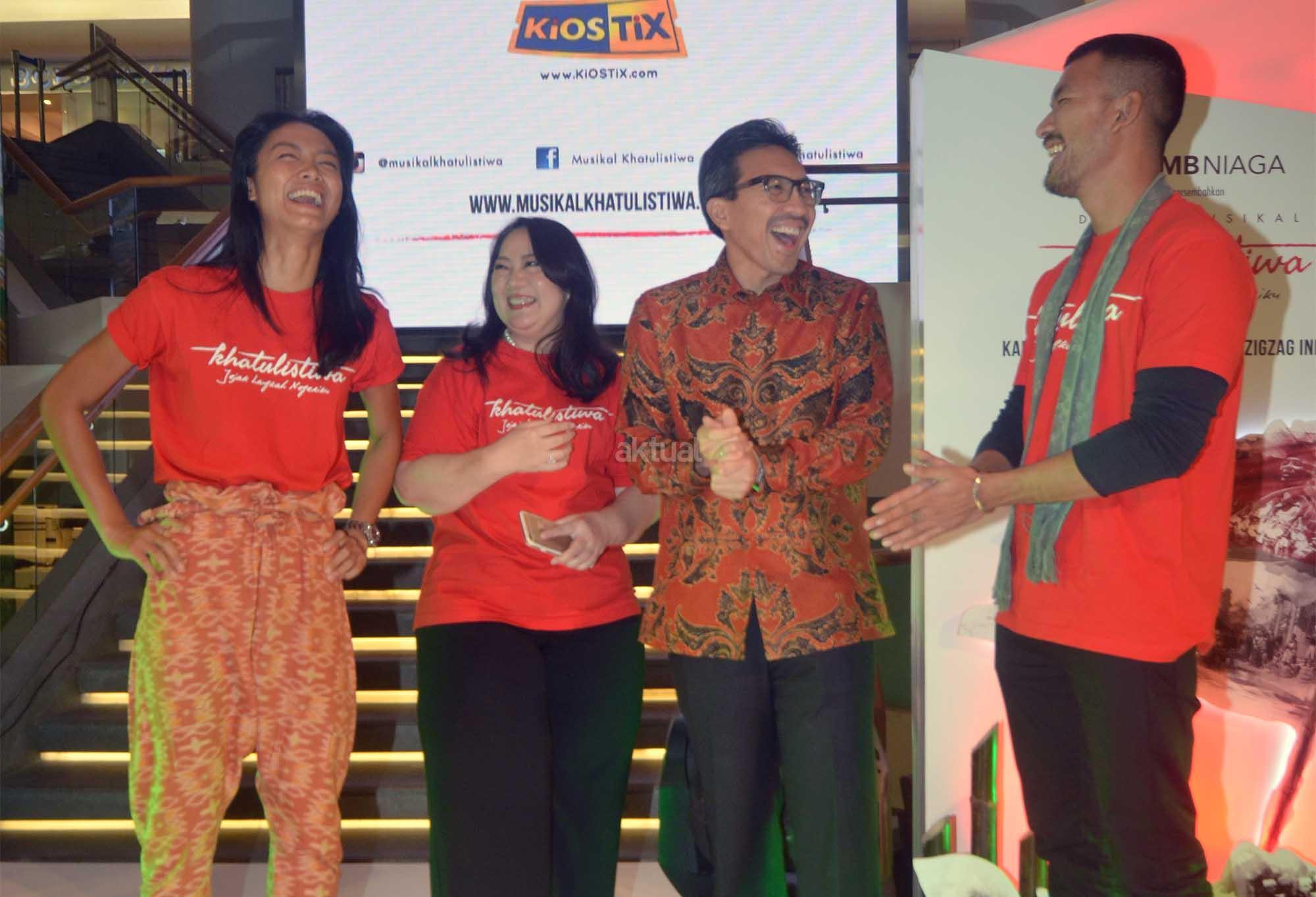 Presiden Direktur PT Bank CIMB Niaga Tbk, Tigor M Siahaan (kedua dari kanan) berbincang dengan (dari kiri ke kanan) Aktris Pendukung Drama Musikal Khatulistiwa, Kelly Tandiono, Pendiri Josodirdjo Foundation & ZigZag Indonesia, Tiara Josodirdjo, serta Aktor pendukung Drama musikal Khatulistiwa,Rio Dewanto disela jumpa media massa dan blogger di Jakarta, Selasa (4/10).Dalam rangka memaknai Hari Pahlawan Nasional yang jatuh pada bulan November mendatang PT Bank CIMB Niaga Tbk bersama Josodirdjo Foundation dan ZigZag Indonesia tergerak mengajak masyarakat Indonesia,khususnya generasi muda,untuk lebih mengenal jejak langkah negerinya dengan mempersembahkan sebuah inisiatif sosial berupa drama musikal bertajuk Khatulistiwa yang akan dipentaskan pada 18-20 November 2016 di Teater Jakarta Taman Ismail Marzuki,Jakarta. Aktual/Eko S Hilman
