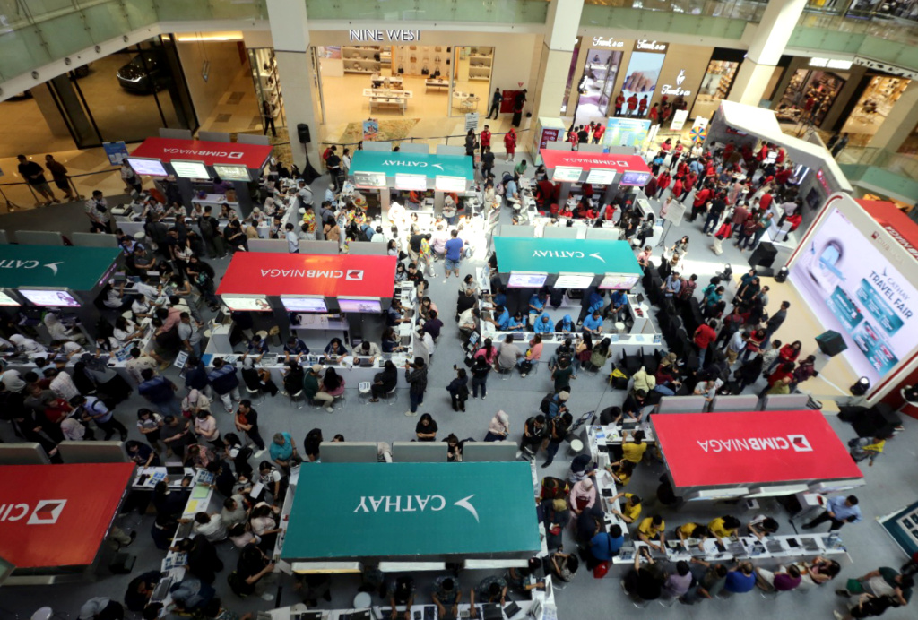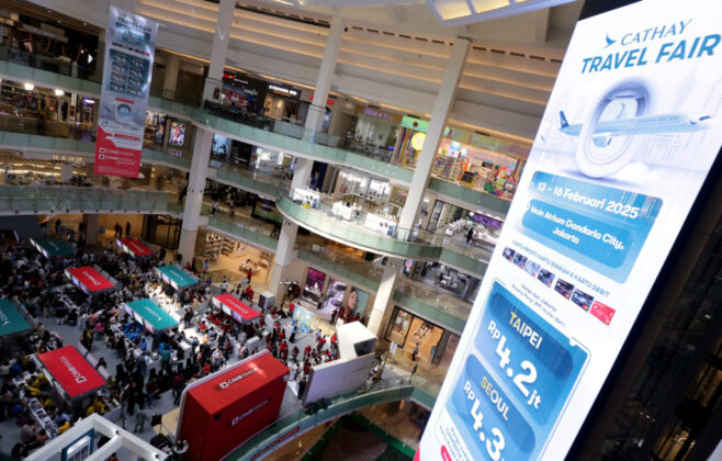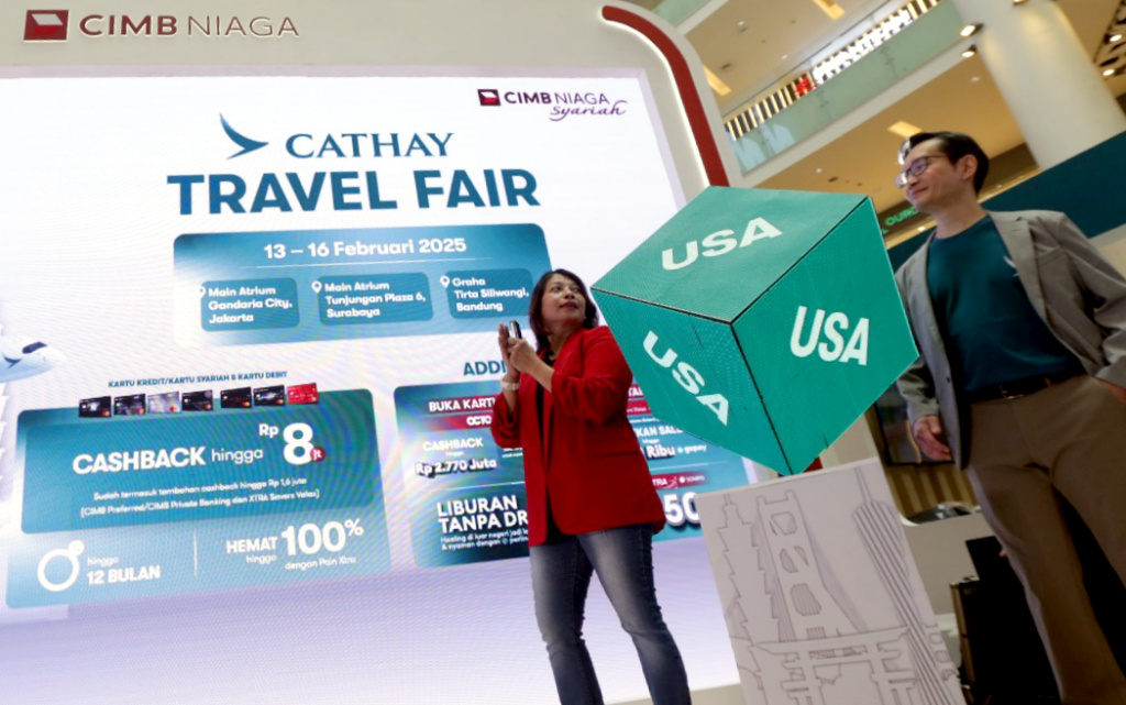 Suasana pameran travel Cathay Travel Fair 2025 CIMB Niaga di Gandaria Mal, Jakarta, Kamis (13/2/2025).