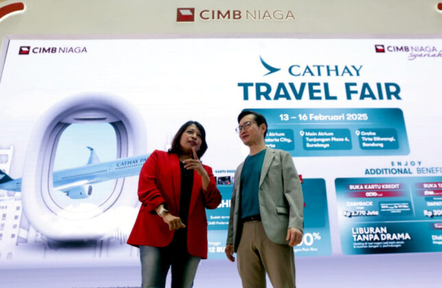 Head of Credit Card, Merchant & Personal Financing Business CIMB Niaga Trisna L.M. Siahaan bersama Cathay Country Manager Indonesia Tony Sham (kanan), saat pembukaan Cathay Travel Fair 2025 di Jakarta, Kamis (13/2/2025).