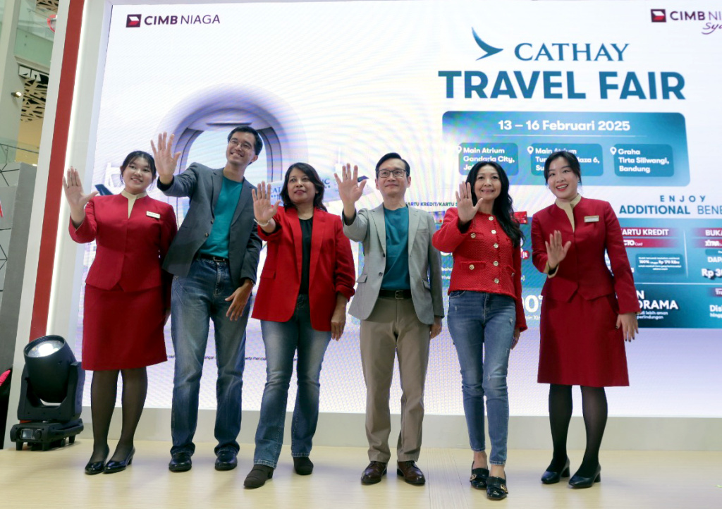 Head of Credit Card, Merchant & Personal Financing Business CIMB Niaga Trisna L.M. Siahaan (ketiga kiri) bersama Cathay Country Manager Indonesia Tony Sham (ketiga kanan), Card Usage, Acquisition & Partnership Head CIMB Niaga Dina Merlina Chrisnady (kedua kanan), dan Cathay Regional Head of Customer Travel and Lifestyle Southeast Asia Jonathan Ng (kedua kiri) dalam pembukaan Cathay Travel Fair 2025 di Jakarta, Kamis (13/2/2025).
