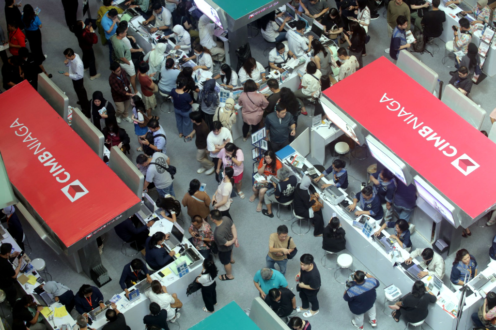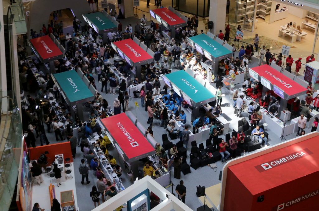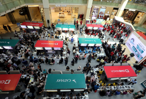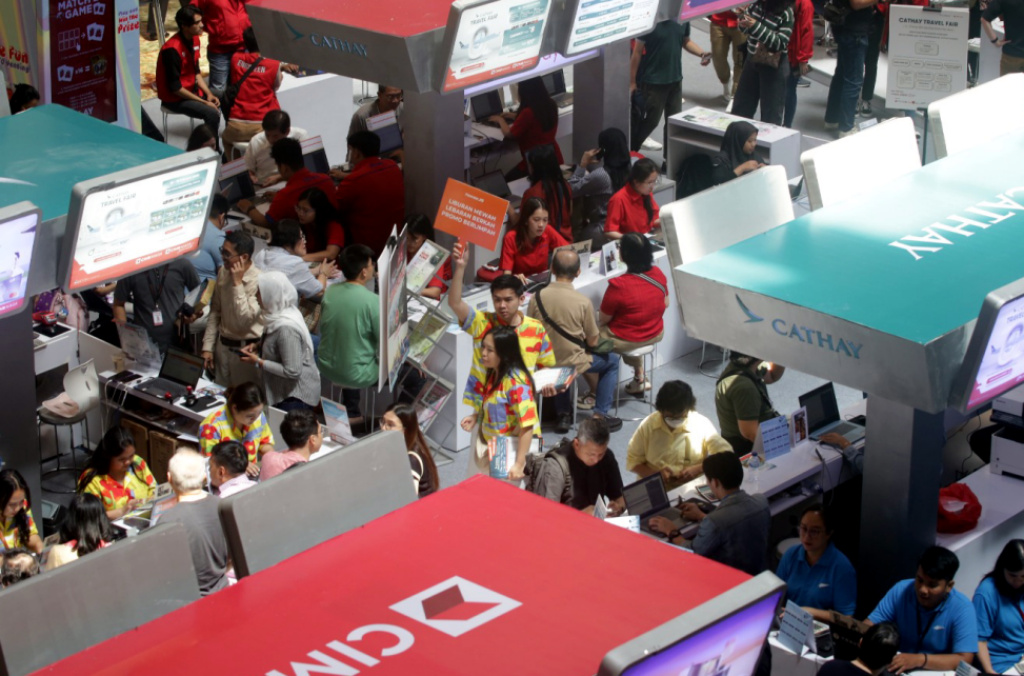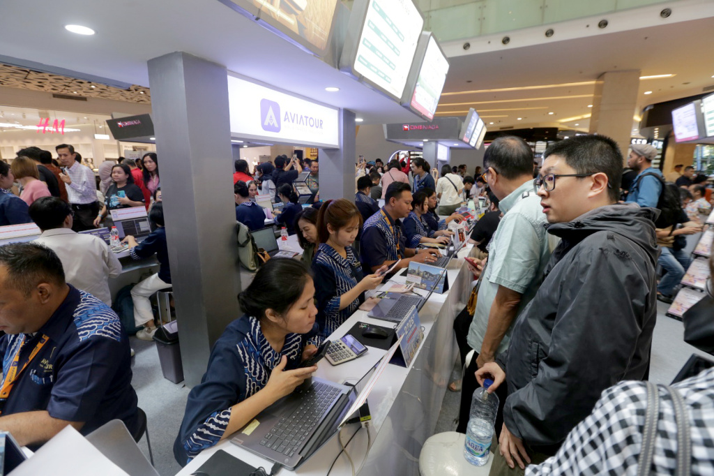 Penngunjung saat bertransaksi pembelian tiket di Cathay Travel Fair 2025 CIMB Niaga yang berlangsung di Gandaria Mal, Jakarta, Kamis (13/2/2025).