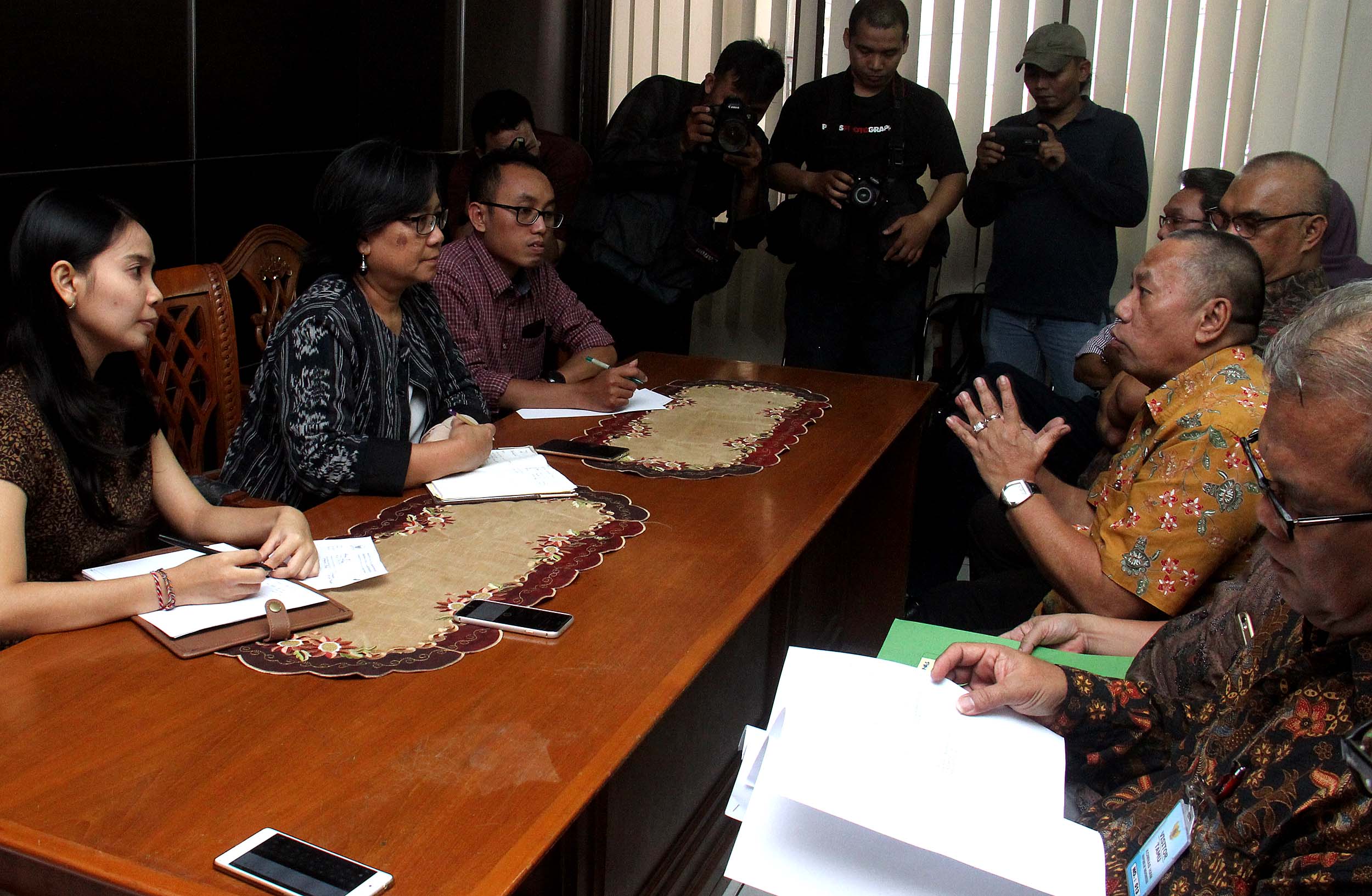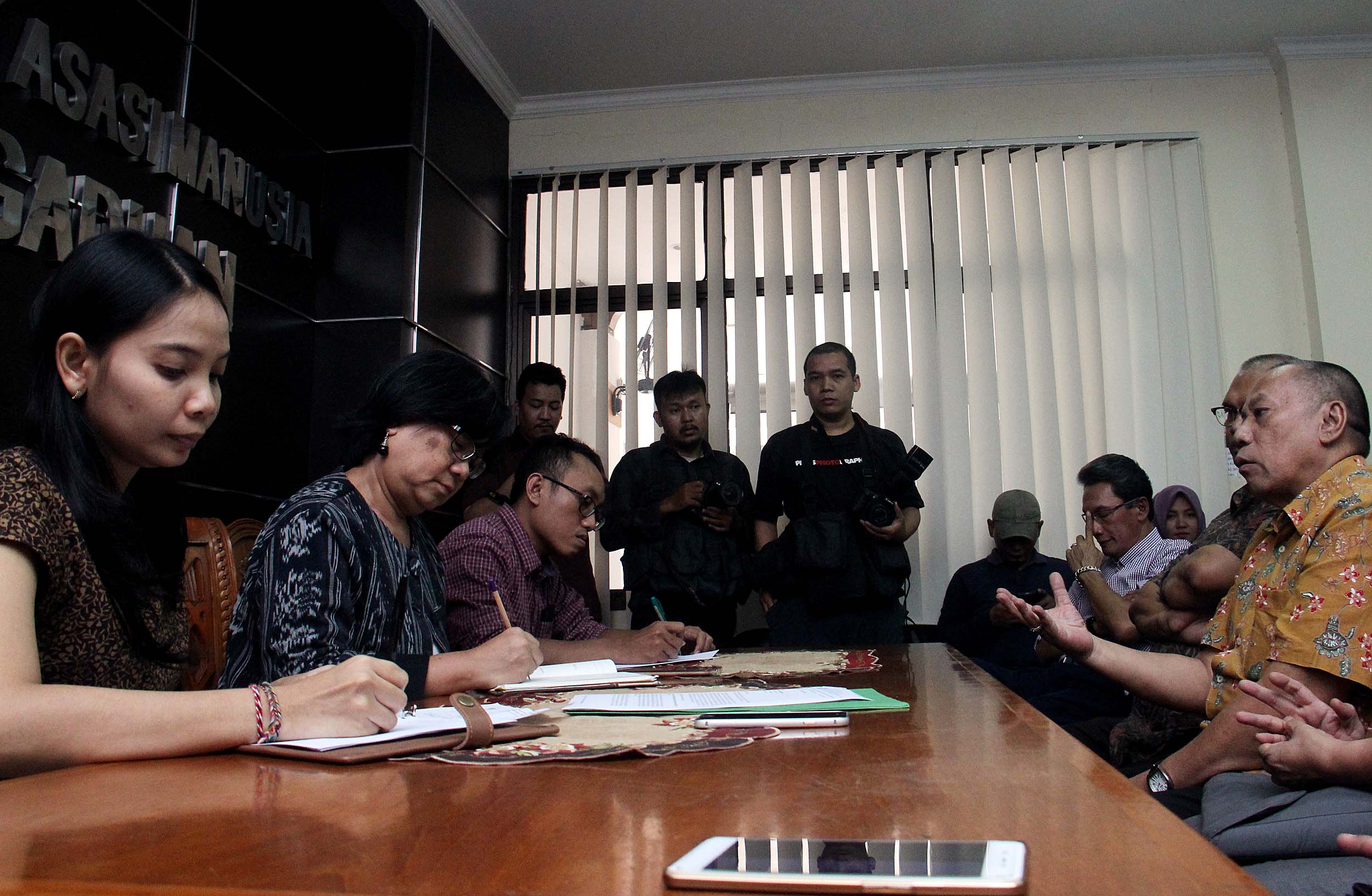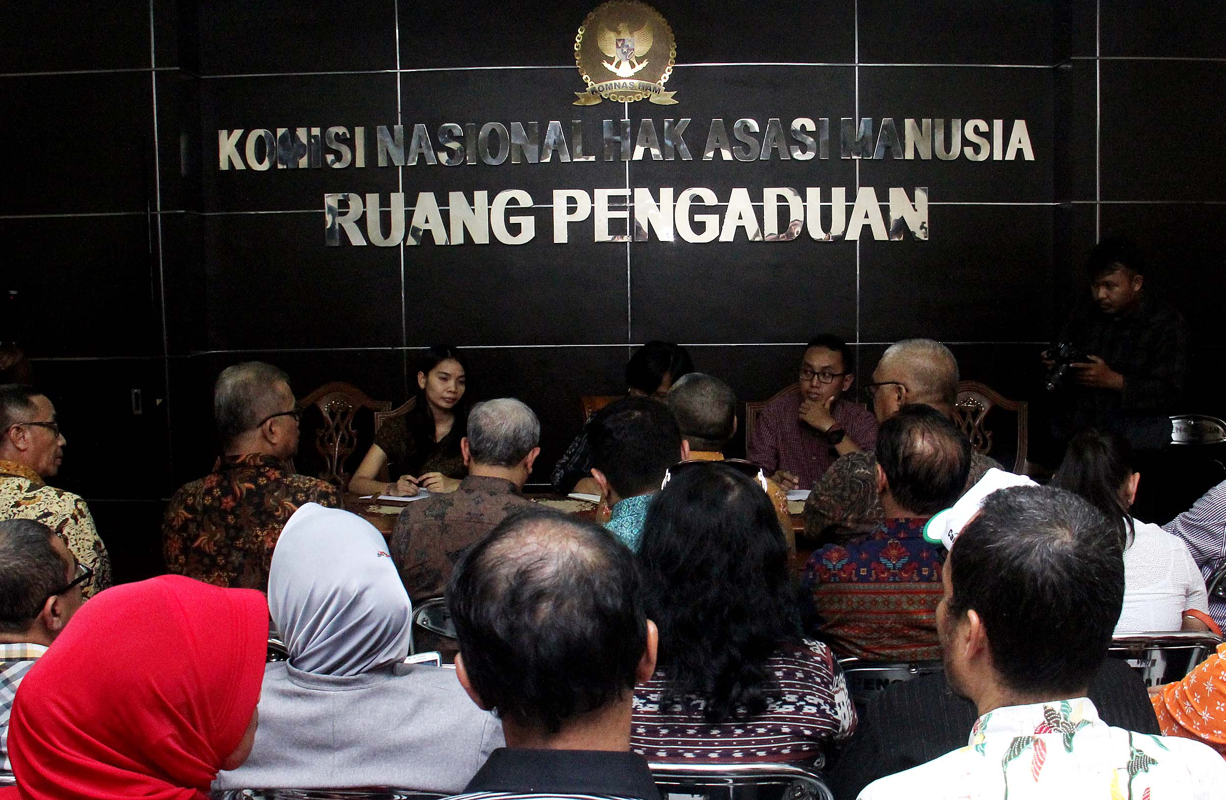 Komisioner Komnas HAM, Sandra Moniaga (tengah) menerima pengaduan dari akademisi Universitas Trisakti yang terdiri dari pimpinan universitas, dosen dan karyawan di kantor Komnas HAM, Jakarta, Rabu (10/8/2016). Civitas akademika Universitas Trisakti mengadukan perihal pangkalan data Usakti yang diblokir oleh Menristek M Nasir Dikti, sehingga menghambat proses belajar mengajar di Usakti