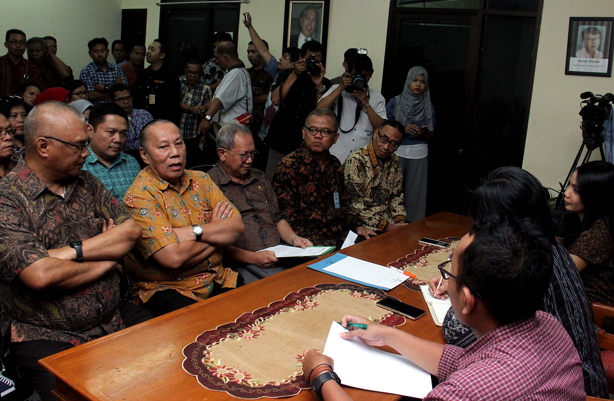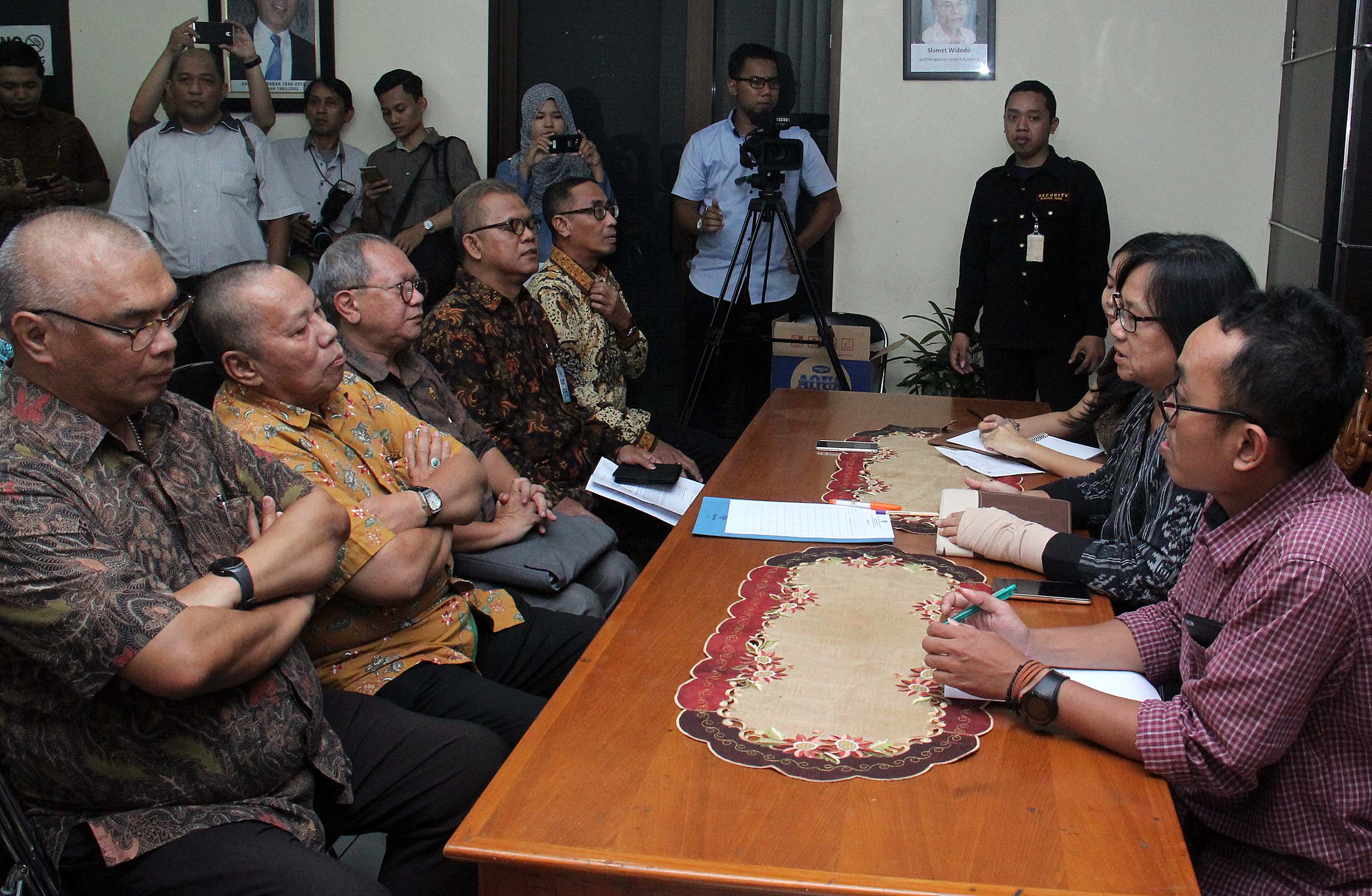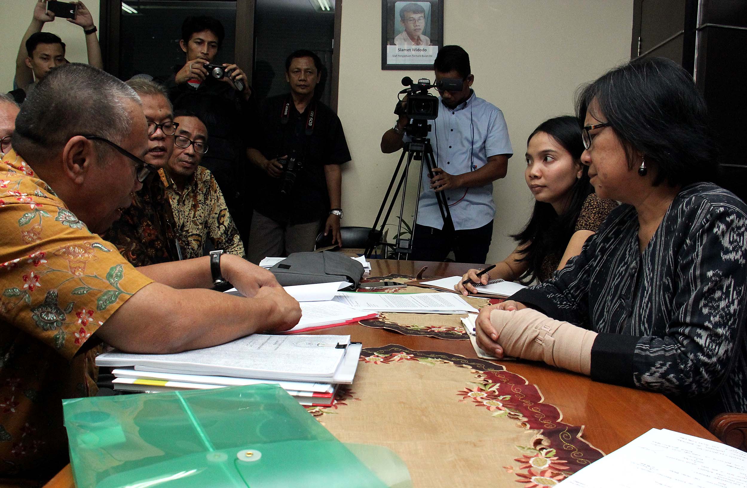 Komisioner Komnas HAM, Sandra Moniaga (tengah) menerima pengaduan dari akademisi Universitas Trisakti yang terdiri dari pimpinan universitas, dosen dan karyawan di kantor Komnas HAM, Jakarta, Rabu (10/8/2016). Civitas akademika Universitas Trisakti mengadukan perihal pangkalan data Usakti yang diblokir oleh Menristek M Nasir Dikti, sehingga menghambat proses belajar mengajar di Usakti
