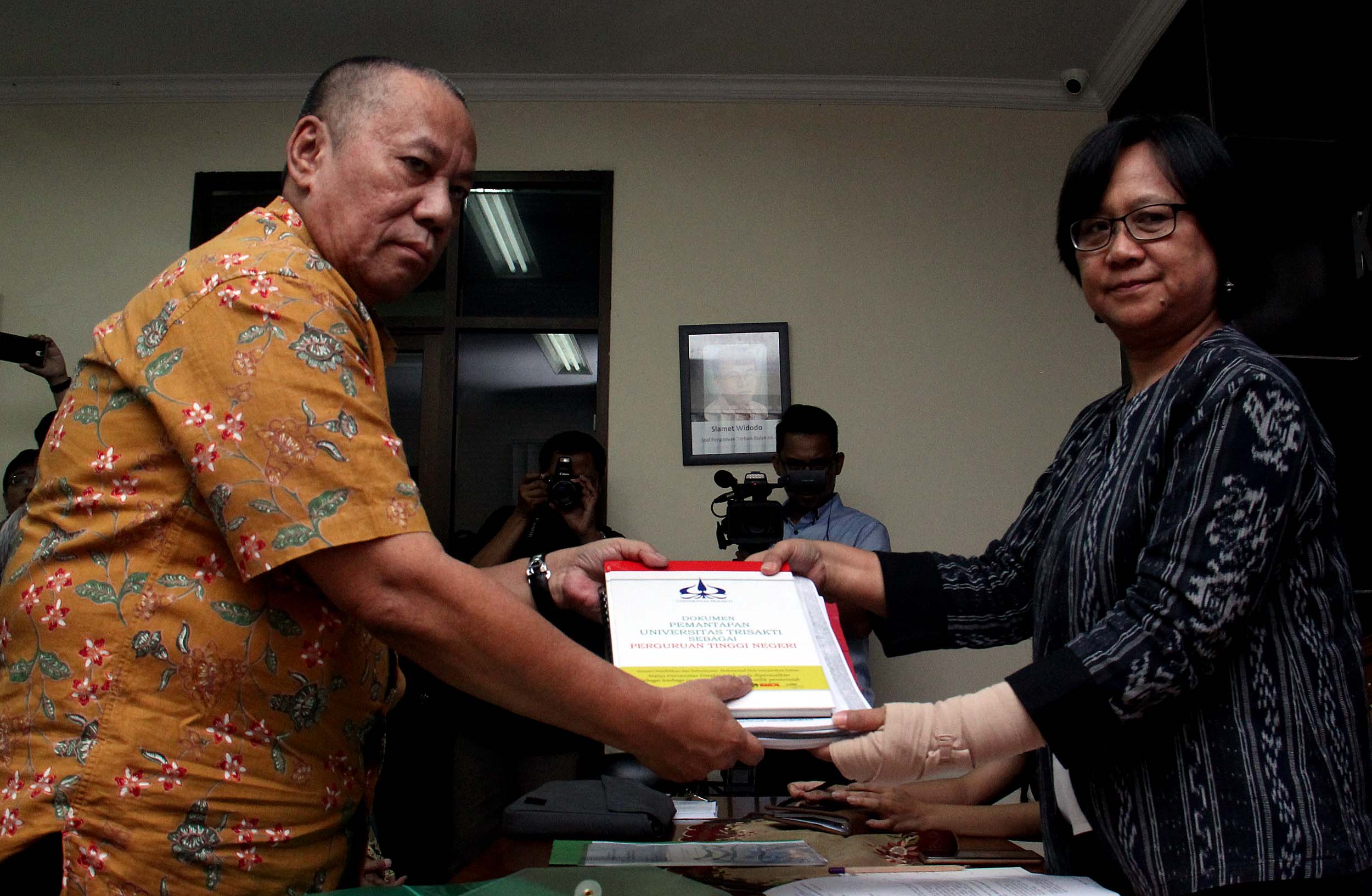 Komisioner Komnas HAM, Sandra Moniaga (kanan) menerima data berkas dari perwakilan akademisi Universitas Trisakti yang terdiri dari pimpinan universitas, dosen dan karyawan di kantor Komnas HAM, Jakarta, Rabu (10/8/2016).Civitas akademika Universitas Trisakti mengadukan perihal pangkalan data Usakti yang diblokir oleh Menristek/Dikti M Nasir , sehingga menghambat proses belajar mengajar di Usakti