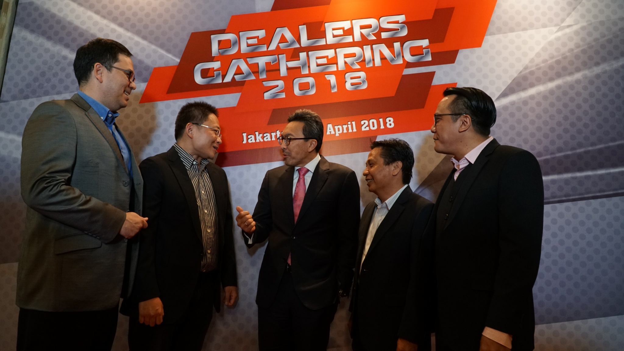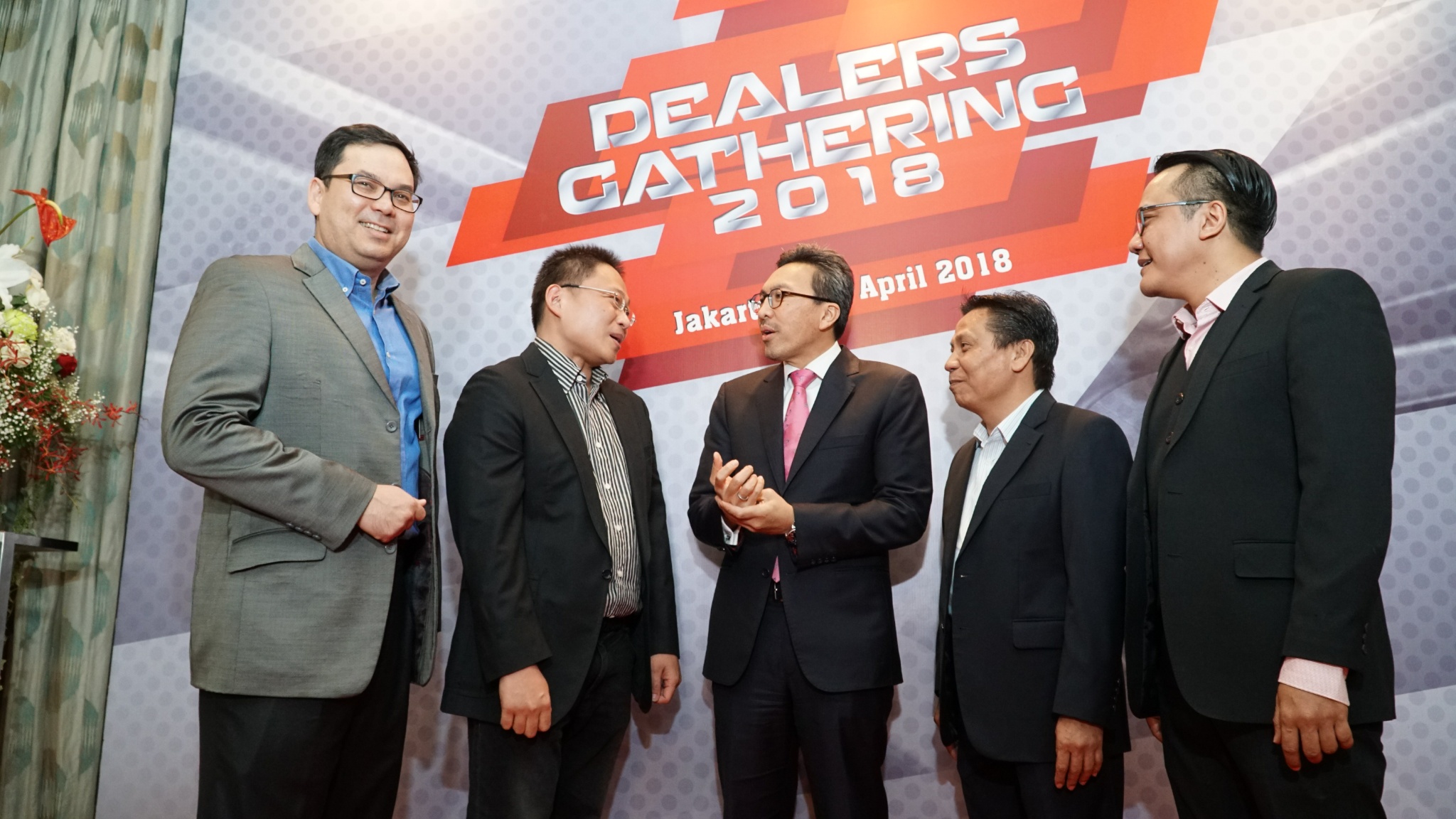 Presiden Komisaris CIMB Niaga Auto Finance (CNAF), Wan Razly (kedua kiri), Presiden Direktur CIMB Niaga, Tigor M Siahaan (tengah) serta Presiden Direktur CNAF, Ristiawan Suherman (kedua kanan) berbincang disela penyelenggaraan Dealer Gathering 2018 di Jakarta, Jumat (20/4) malam. Acara bertujuan memperkuat hubungan dan kerja sama dengan rekanan dealer yang telah berkontribusi meningkatkan pembiayaan kendaraan bermotor CNAF.Hingga akhir 2017, CNAF membukukan laba sebelum pajak (profit before tax/PBT) sebesar Rp 193 Miliar atau meningkat 58 % dari perolehan tahun 2016 sebesar Rp 123 Miliar. AKTUAL/Eko S Hilman