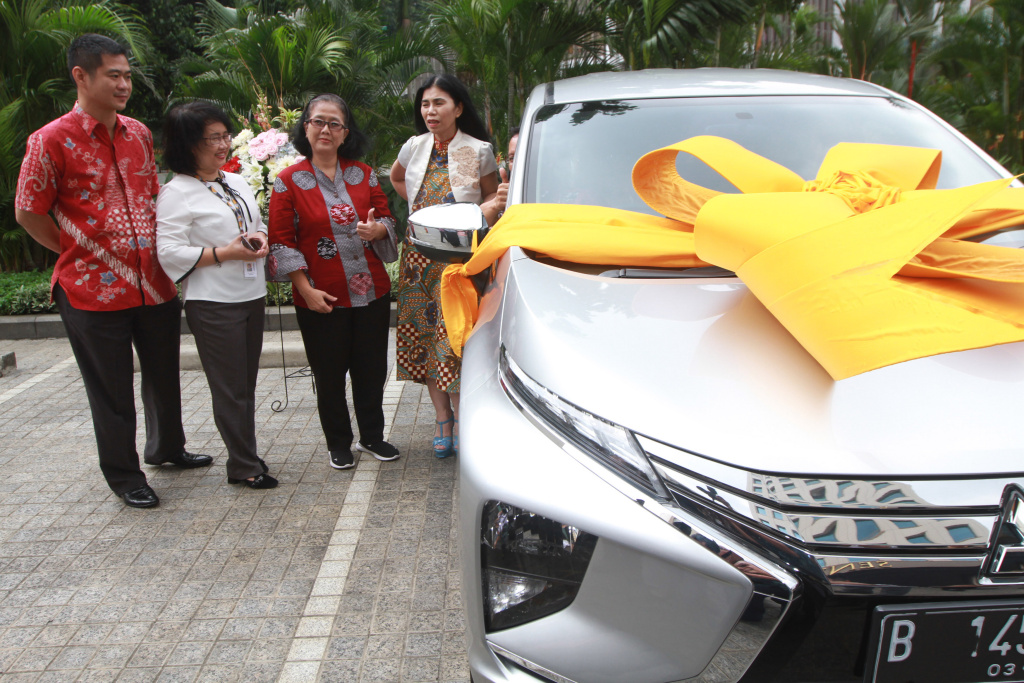 Direktur Community Financial Services Maybank Indonesia Jenny Wiriyanto (kedua kanan) didampingi Presiden Direktur Maybank Finance Alexander (kiri) foto bersama usai menyerahkan hadiah grand prize periode pertama program “Co-Branding Maybank Finance 2019” di Jakarta, Kamis (14/2). AKTUAL/STR-Eko S Hilman