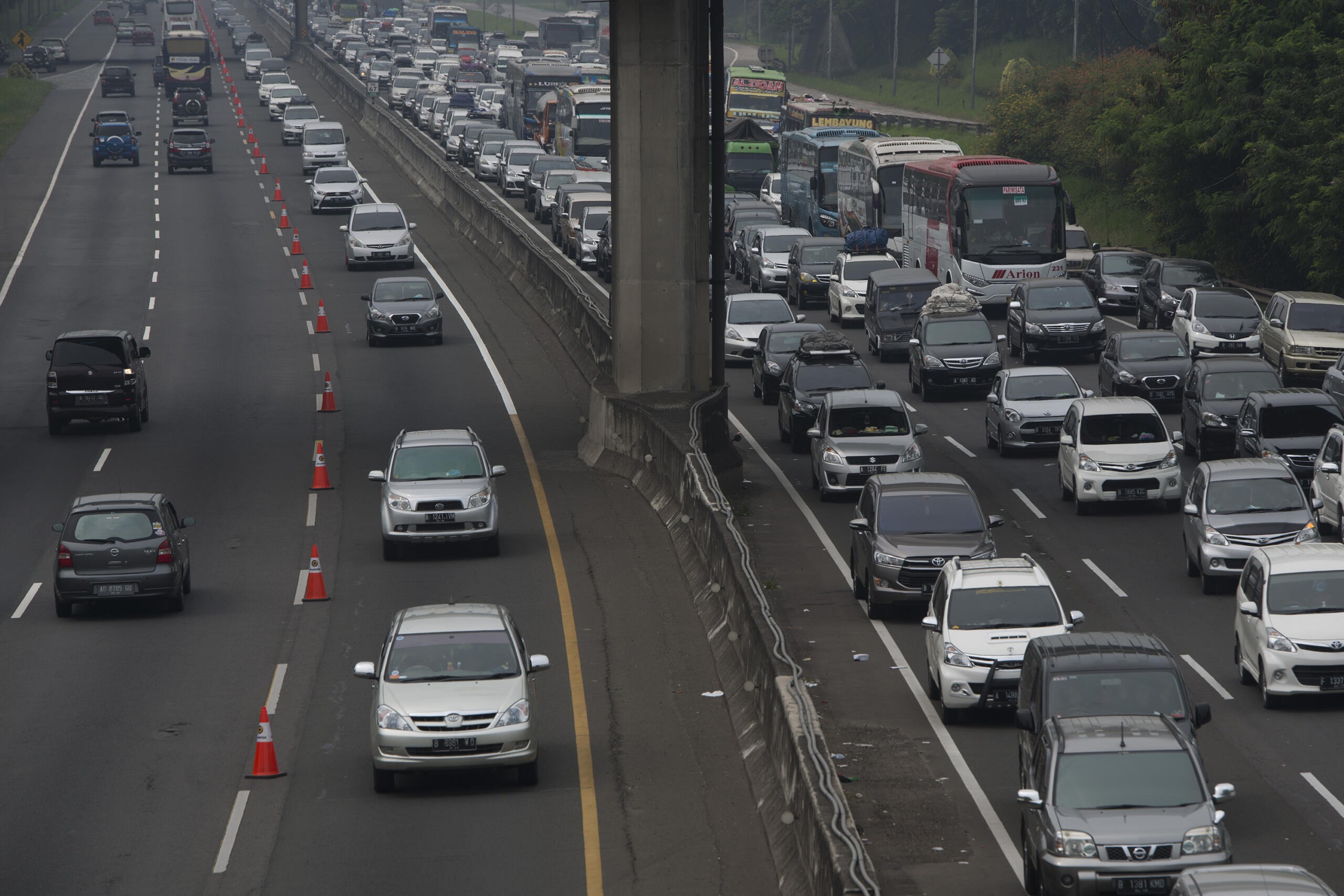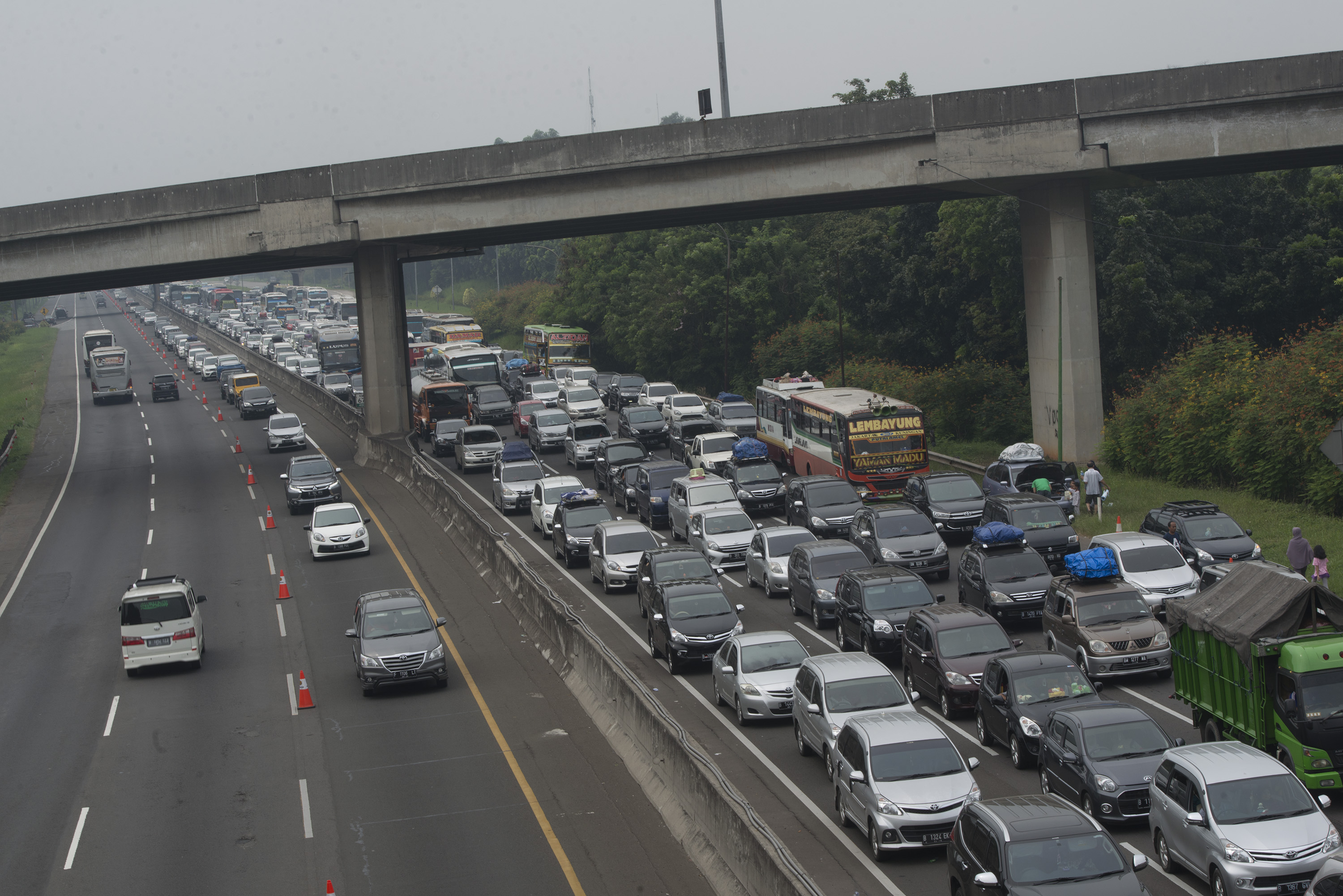 Sistem "contra flow" diberlakukan sepanjang KM 65-41 di Tol Cikampek, Jawa Barat, Minggu (10/7). Langkah tersebut dianggap dapat membantu mengurai kemacetan yang terjadi di titik pertemuan antara kendaraan dari arah Cipularang dan Cipali menuju Jakarta saat arus balik berlangsung. ANTARA FOTO/Rosa Panggabean/kye/16.