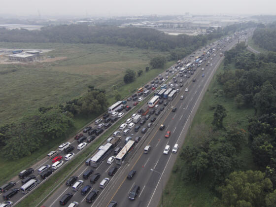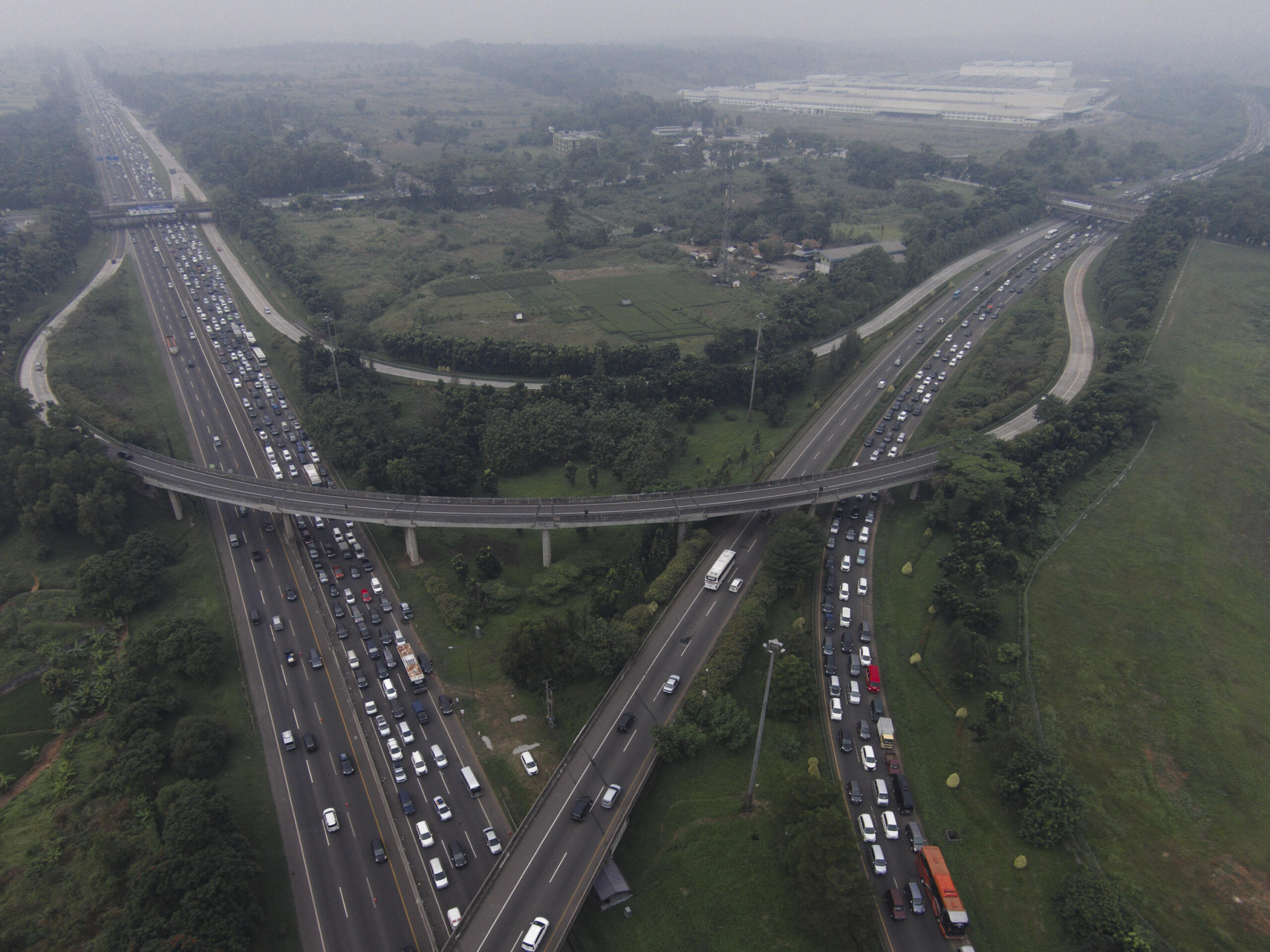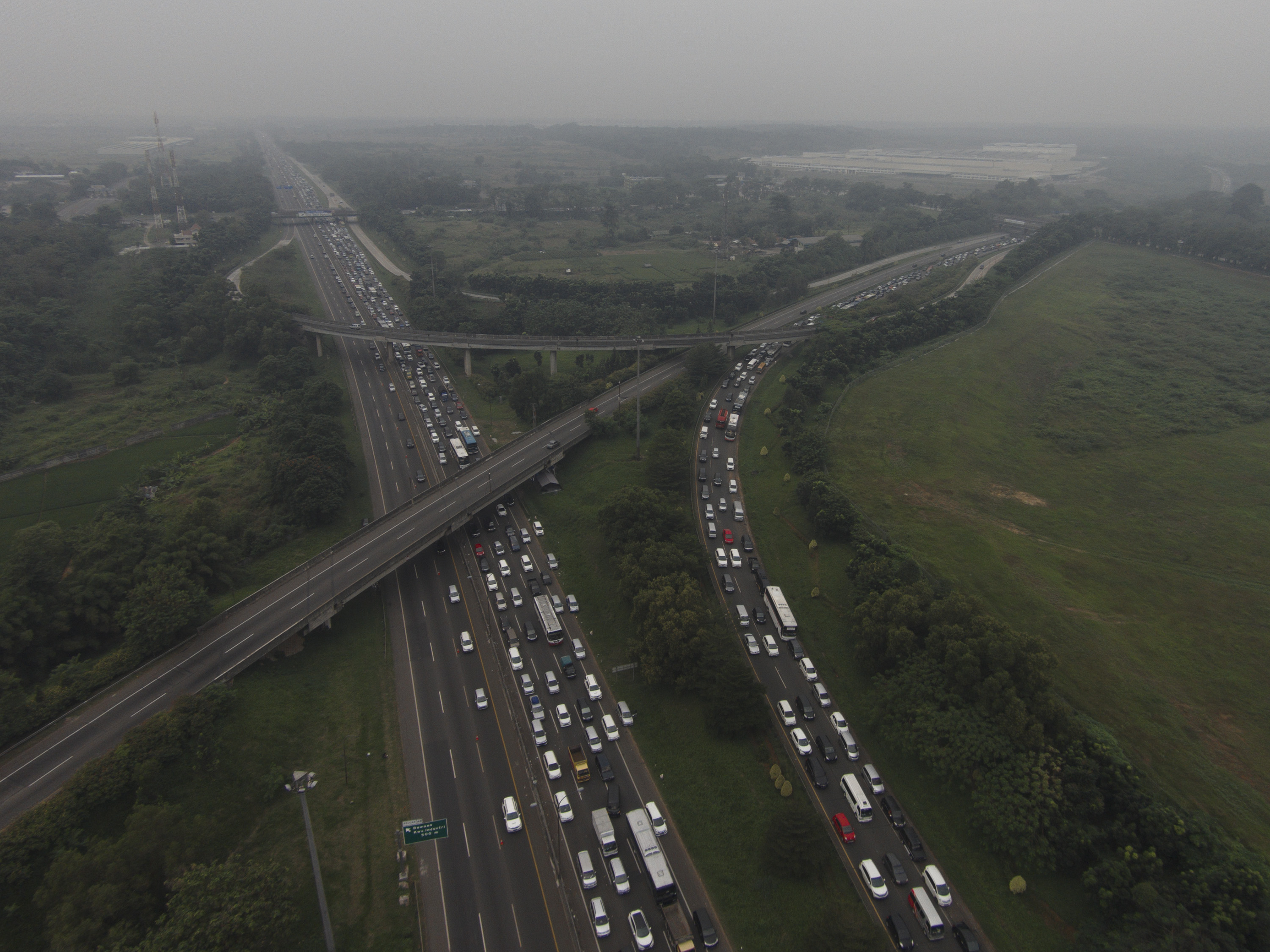 Foto udara antrean kendaraan menuju Jakarta di KM 66 Tol Cikampek-Jakarta yang menjadi titik pertemuan arus balik dari arah Cipularang dan Cipali, Jawa Barat, Minggu (10/7). Puncak arus balik diprediksi terjadi pada Minggu (10/7) malam. ANTARA FOTO/Rosa Panggabean/kye/16.