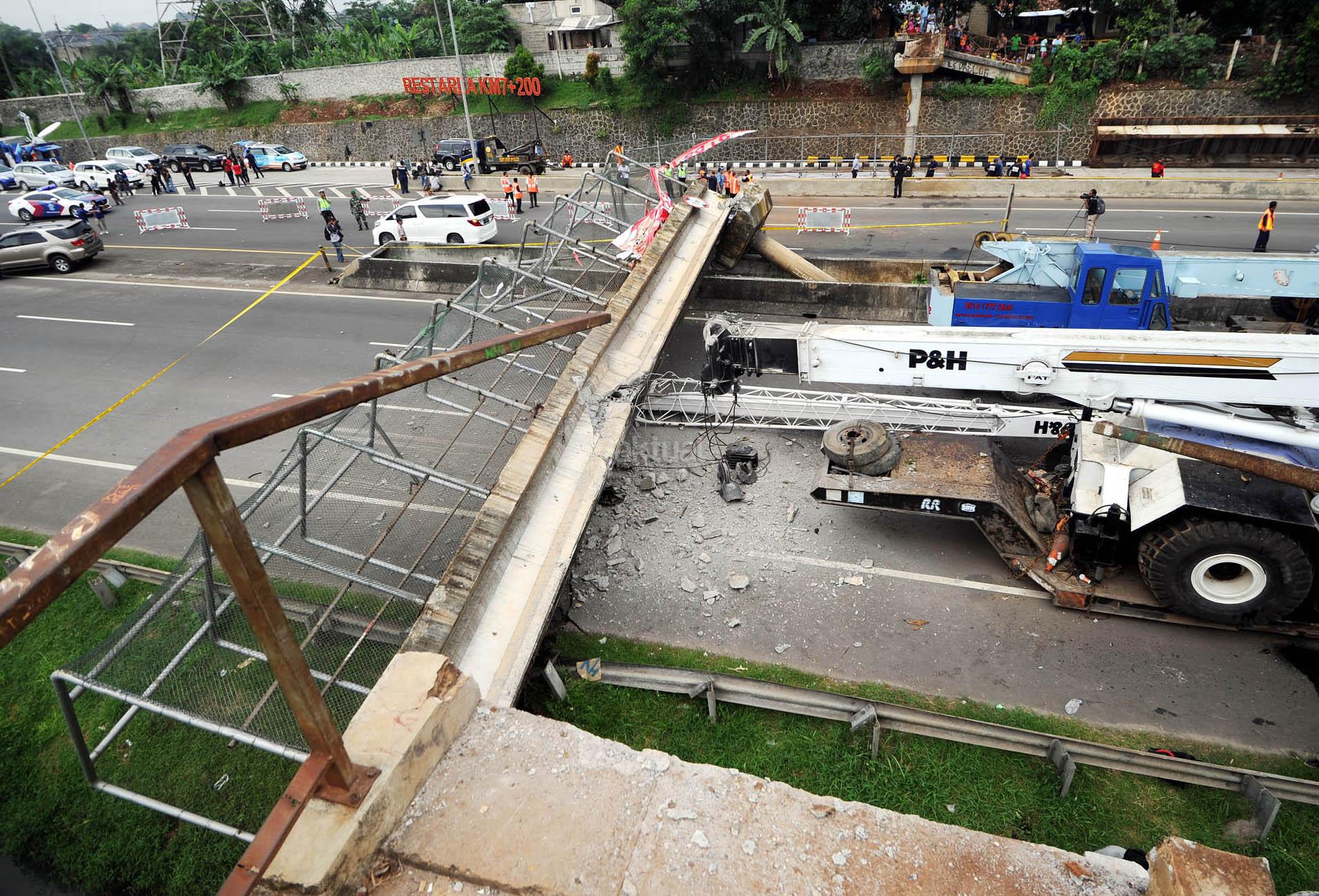 Petugas Jasamarga mengevakuasi Jembatan Penyeberangan Orang (JPO) yang roboh usai ditabrak truk trailer bermuatan crane di KM 7.600 Tol BSD, Tangsel, Senin (16/5). Evakuasi JPO dilakukan dengan menggunakan dua unit mobil crane. AKTUAL/TINO OKTAVIANO
