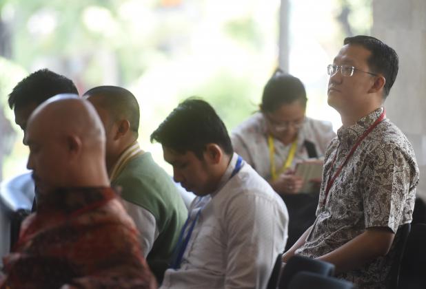 Staf Khusus Gubernur DKI Jakarta Sunny Tanuwidjaja (kanan) menunggu untuk menjalani pemeriksaan di Gedung KPK, Jakarta, Kamis (16/6). Sunny diperiksa sebagai saksi terkait kasus pembahasan raperda tentang rencana zonasi wilayah pesisir dan pulau-pulau kecil provinsi DKI Jakarta tahun 2015-2035 dan raperda tentang rencana tata ruang kawasan strategis Pantai Utara Jakarta. ANTARA FOTO/Akbar Nugroho Gumay/aww/16.