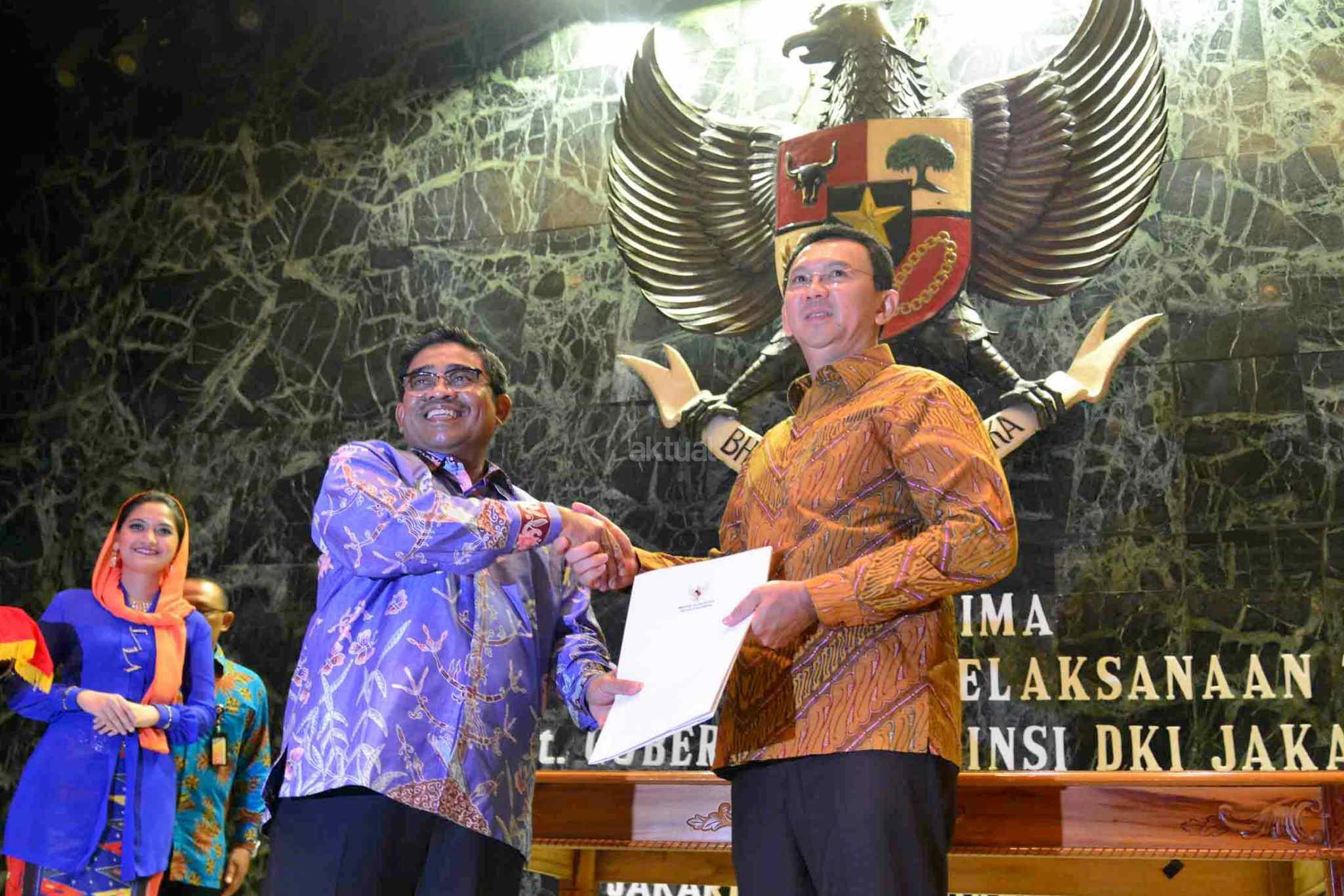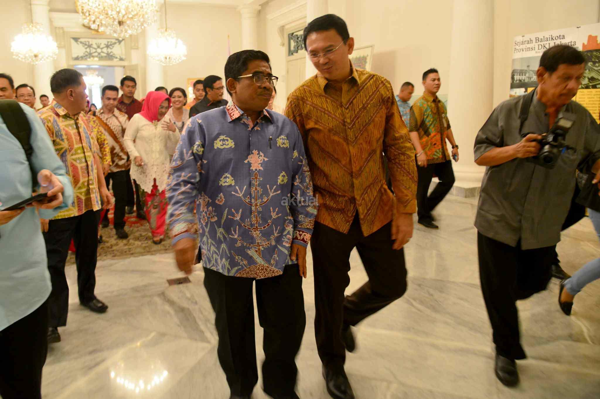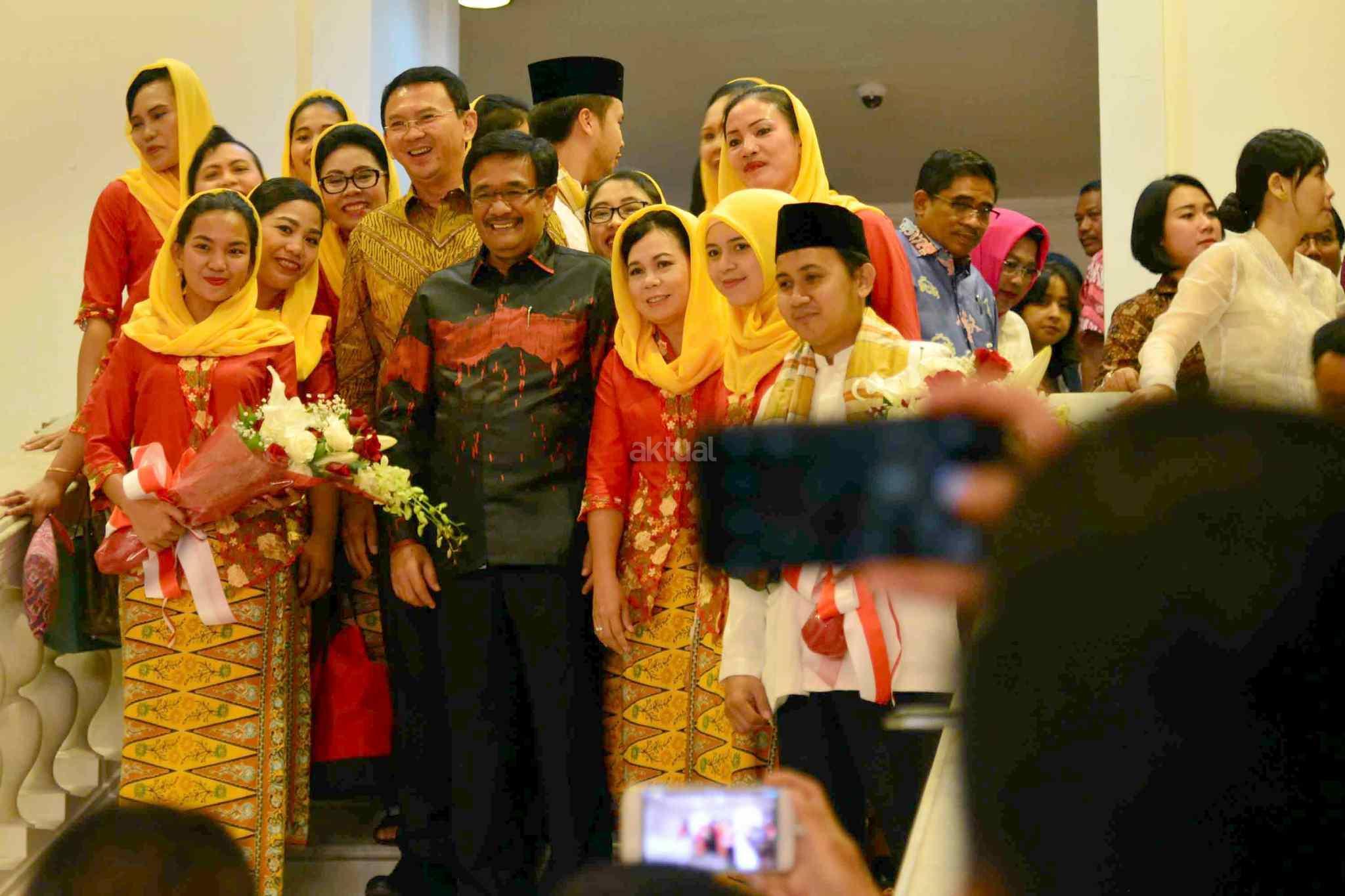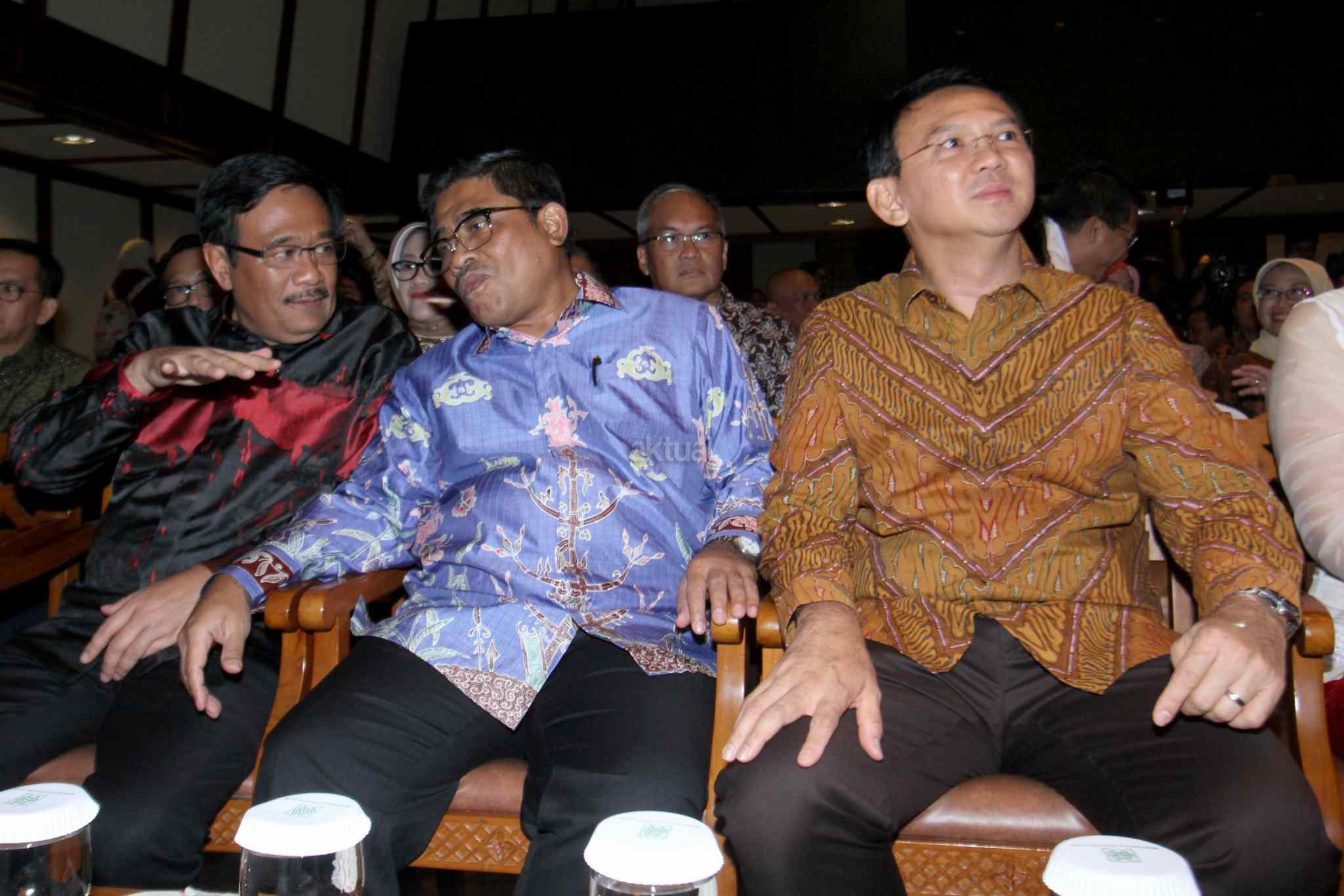 Plt Gubernur DKI Jakarta Sumarsono, Wagub DKI Jakarta Djarot Saiful Hidayat dan Gubernur DKI Jakarta Basuki Tjahaja Purnama melakukan salam komando usai acara serah terima laporan nota singkat akhir pelaksana tugas Gubernur DKI di Balaikota, Jakarta, Sabtu (11/2). Melalui laporan nota tersebut, Ahok kini resmi menjabat kembali sebagai gubernur yang aktif. AKTUAL/Tino Oktaviano