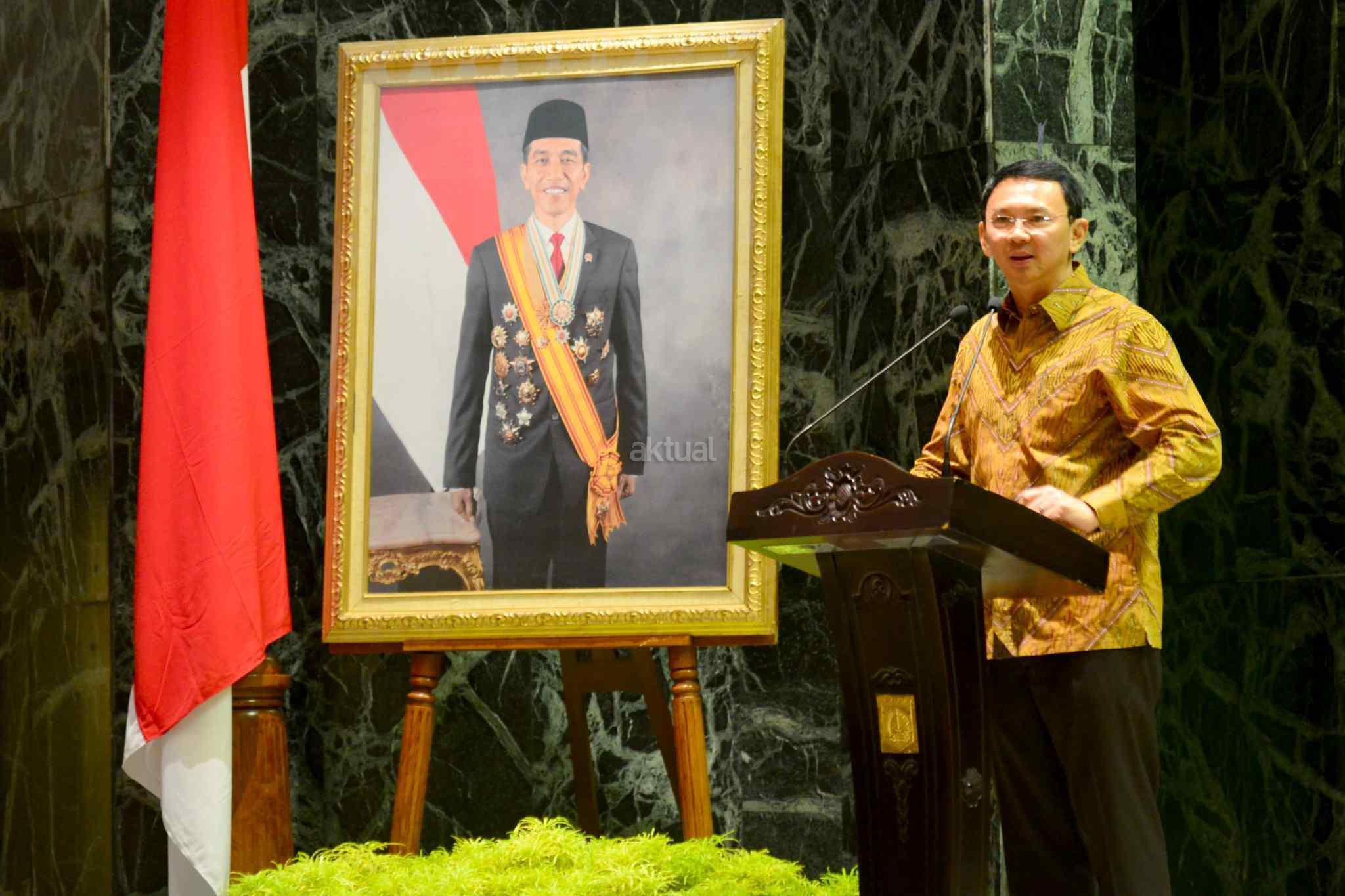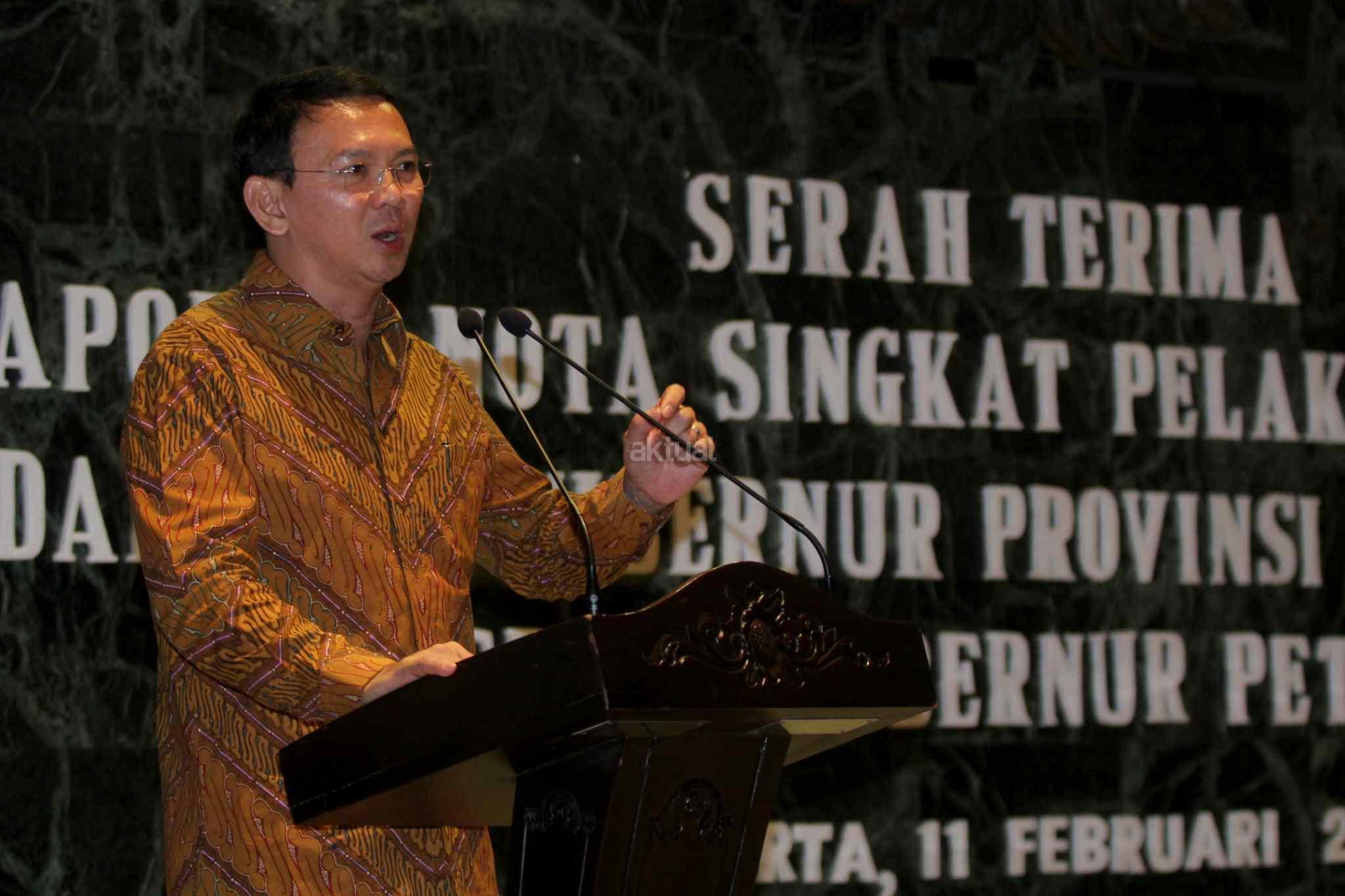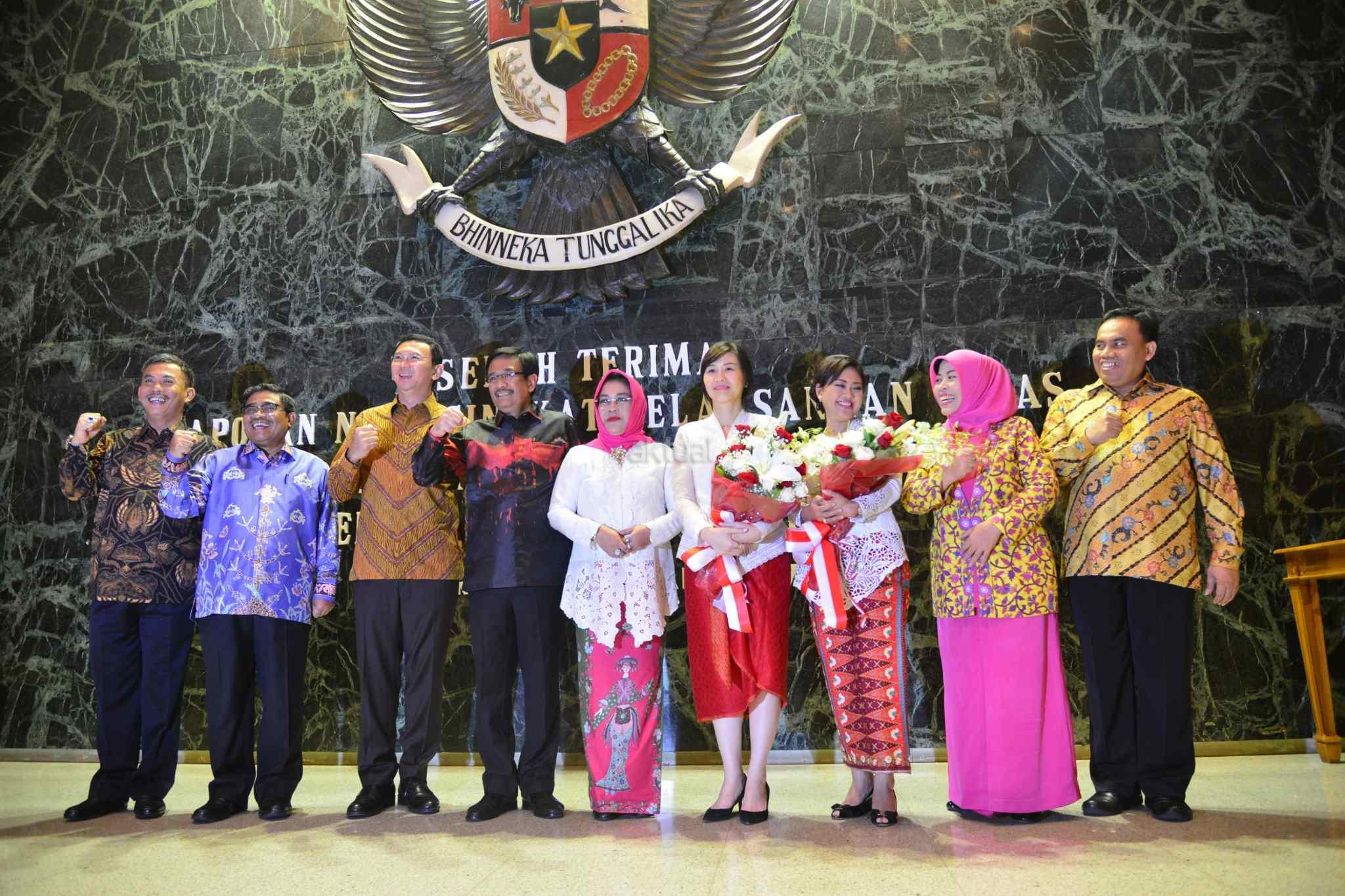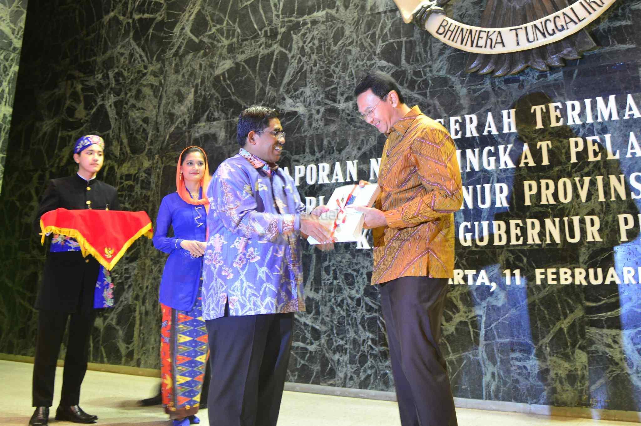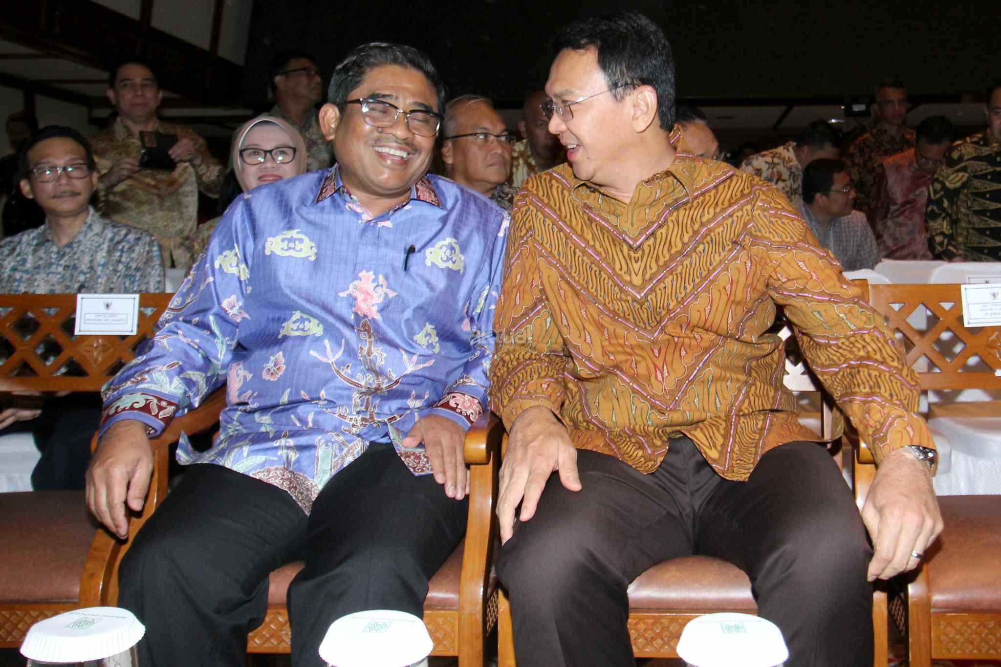 Plt Gubernur DKI Jakarta Sumarsono, Wagub DKI Jakarta Djarot Saiful Hidayat dan Gubernur DKI Jakarta Basuki Tjahaja Purnama melakukan salam komando usai acara serah terima laporan nota singkat akhir pelaksana tugas Gubernur DKI di Balaikota, Jakarta, Sabtu (11/2). Melalui laporan nota tersebut, Ahok kini resmi menjabat kembali sebagai gubernur yang aktif. AKTUAL/Tino Oktaviano