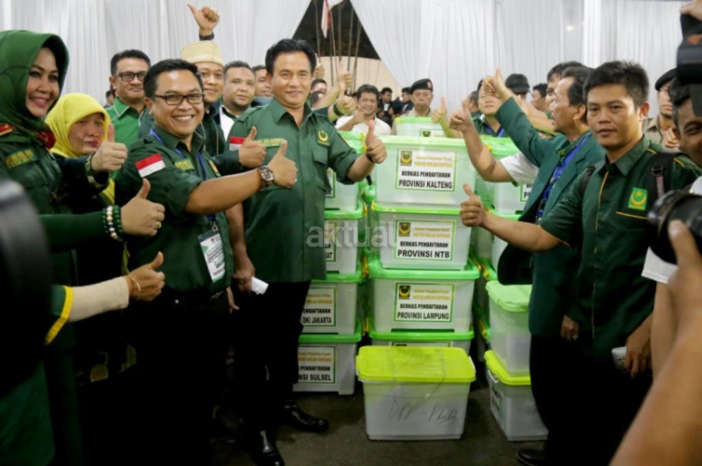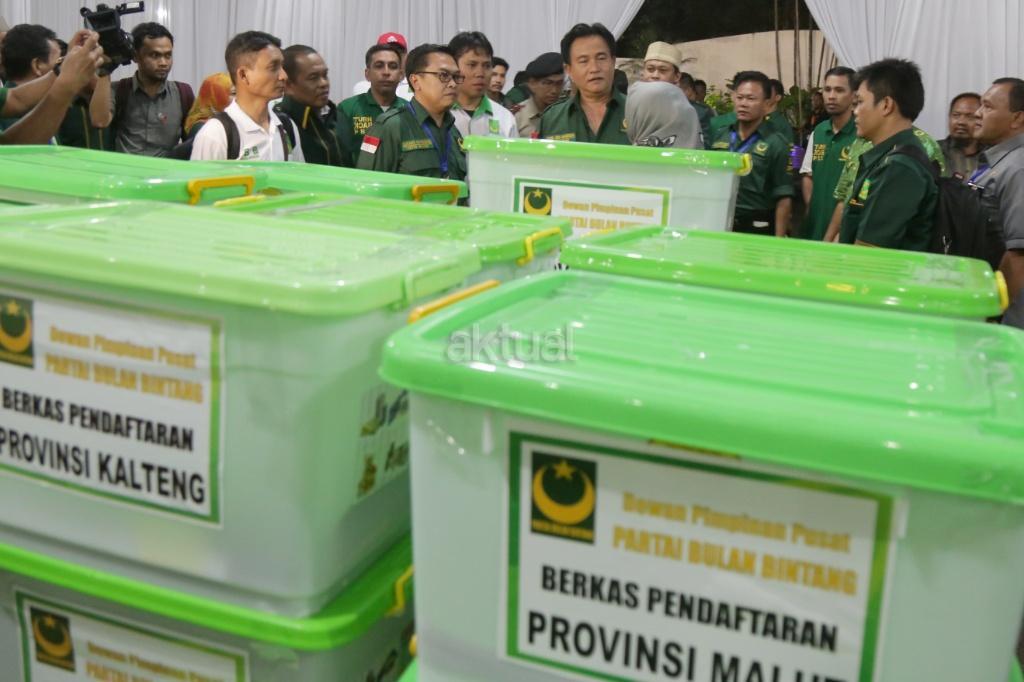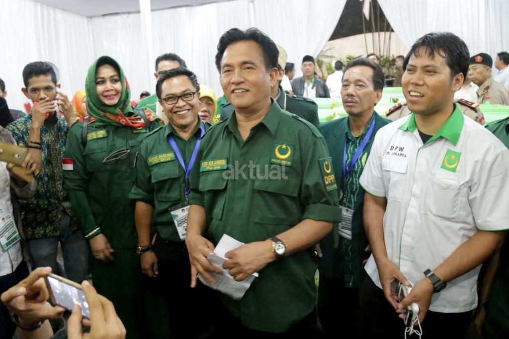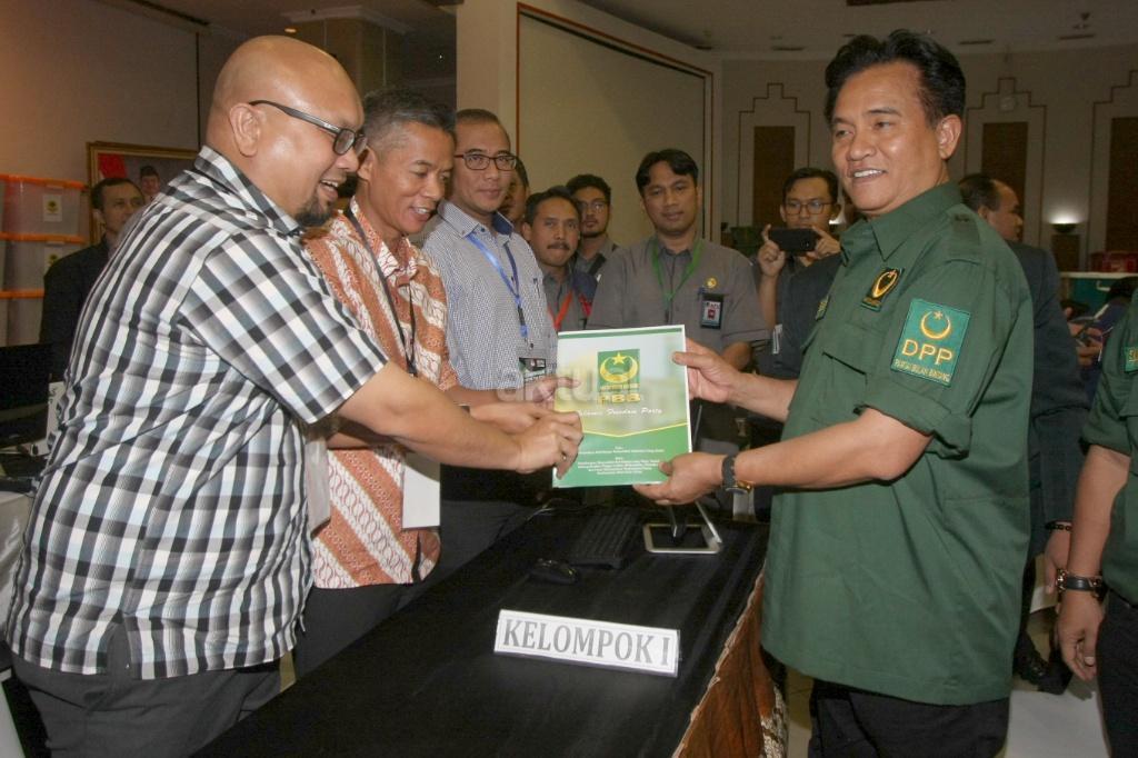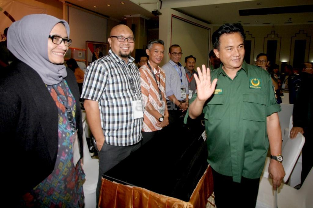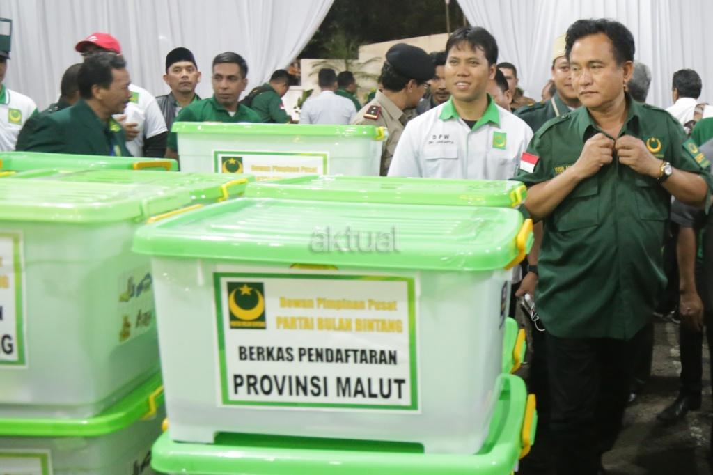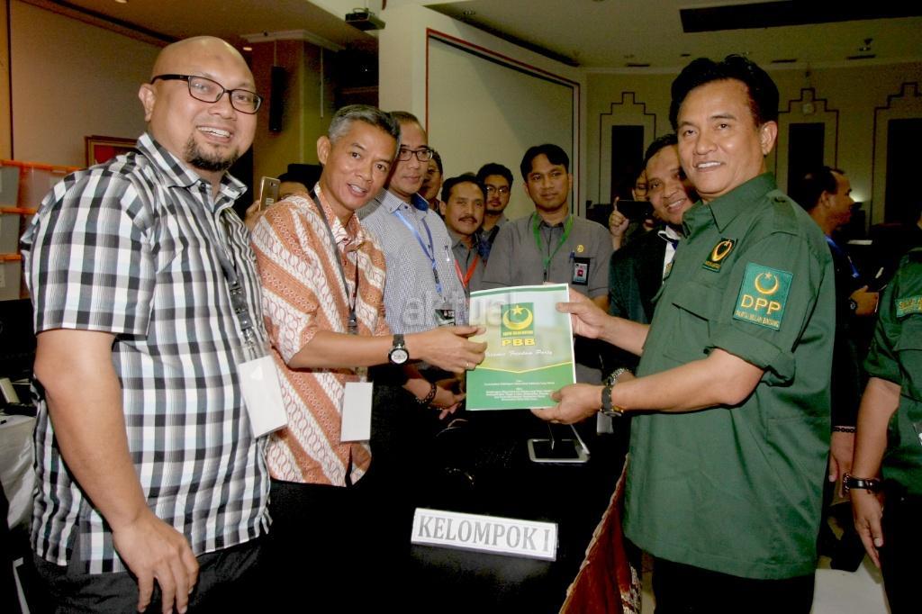 Ketua Umum Partai Bulan Bintang (PBB), Yusril Ihza Mahendra menjelang penyerahan berkas pendaftaran parpol calon peserta Pemilu 2019 di Kantor KPU, Menteng, Jakarta Pusat, Senin (16/10) malam. PBB menjadi parpol ke-22 yang mendaftar ke KPU. PBB juga optimistis lebih siap mengikuti Pemilu 2019 dan ingin jadi parpol alternatif bagi masyarakat di Pemilu 2019. AKTUAL/Tino Oktaviano
