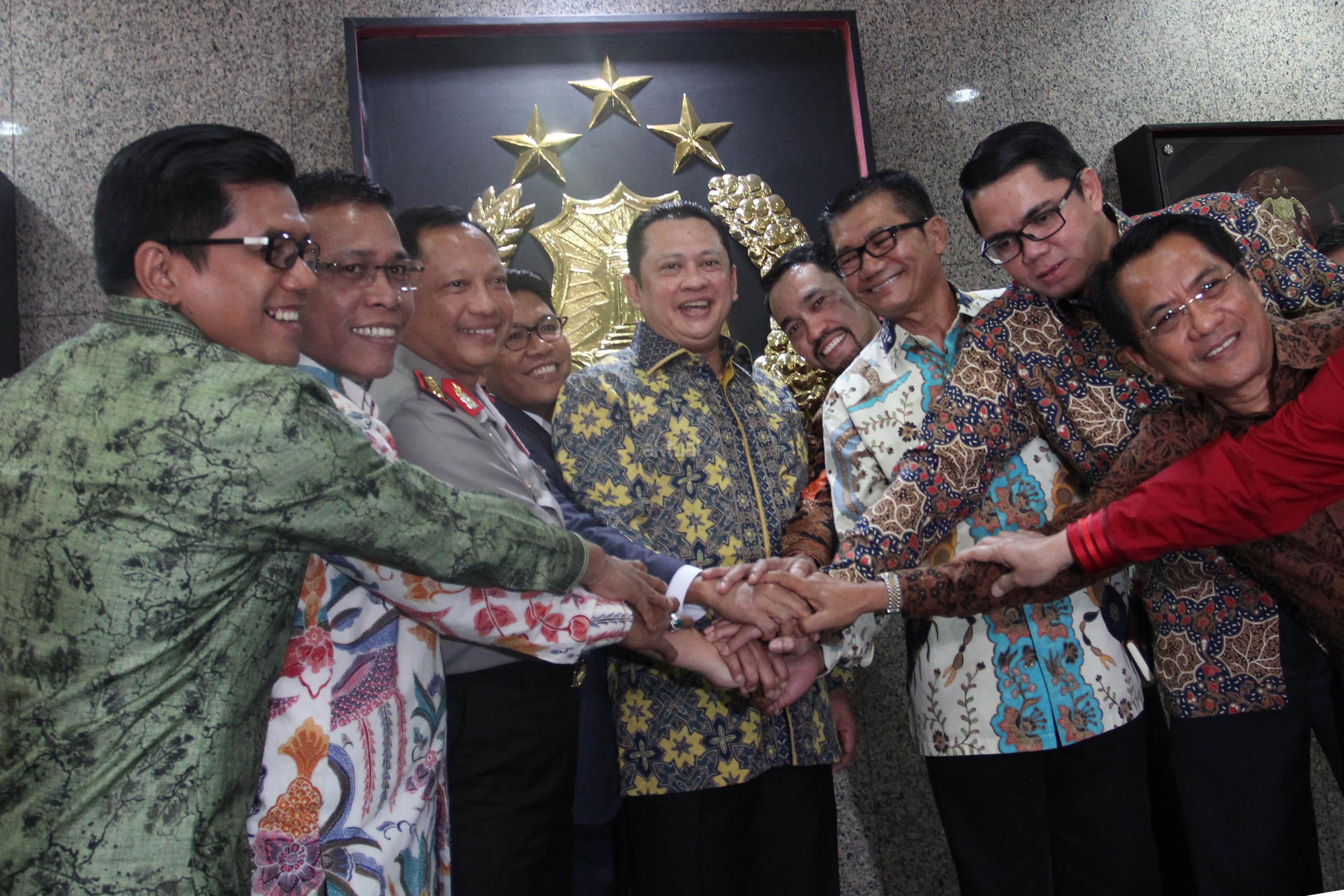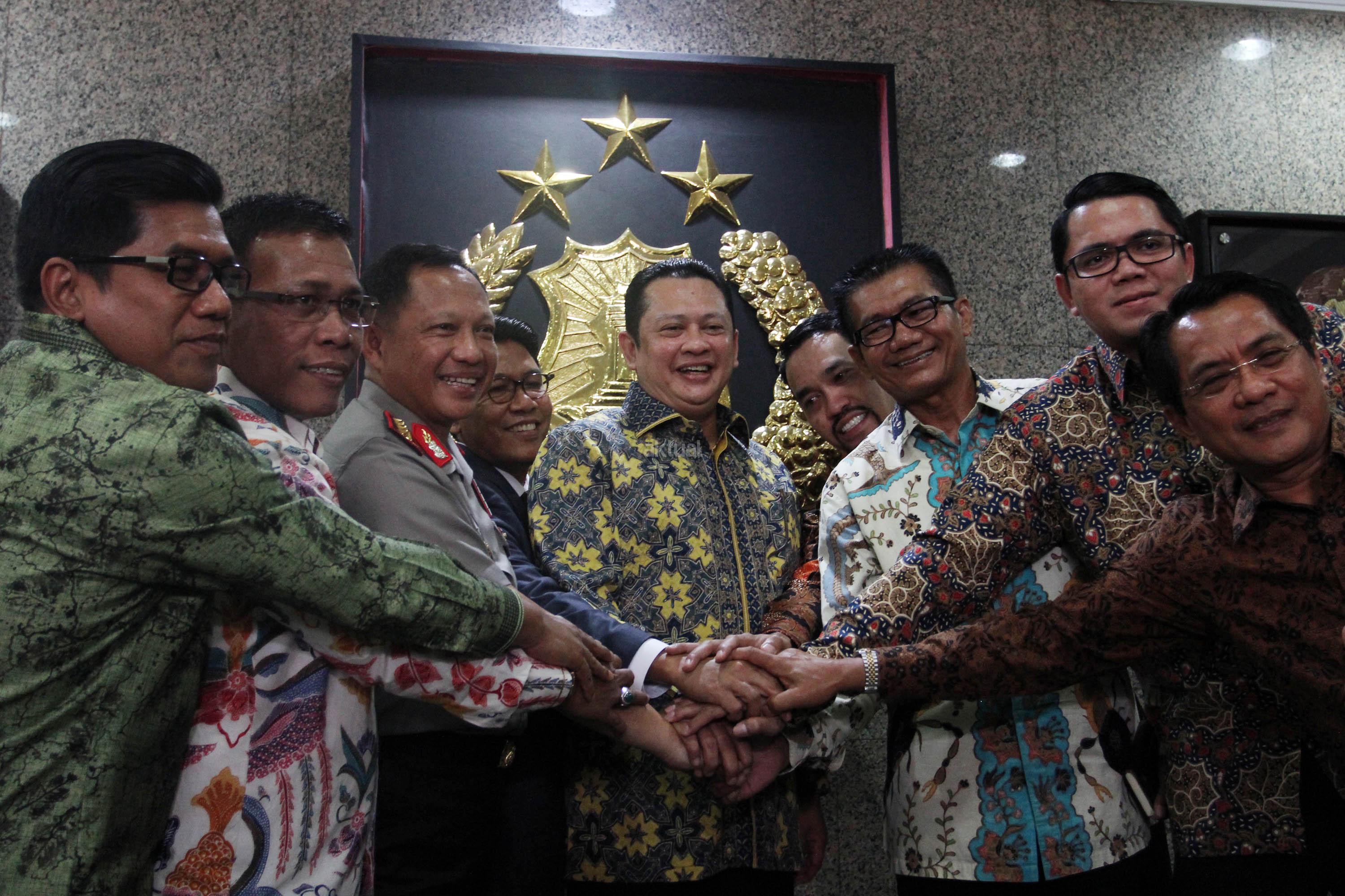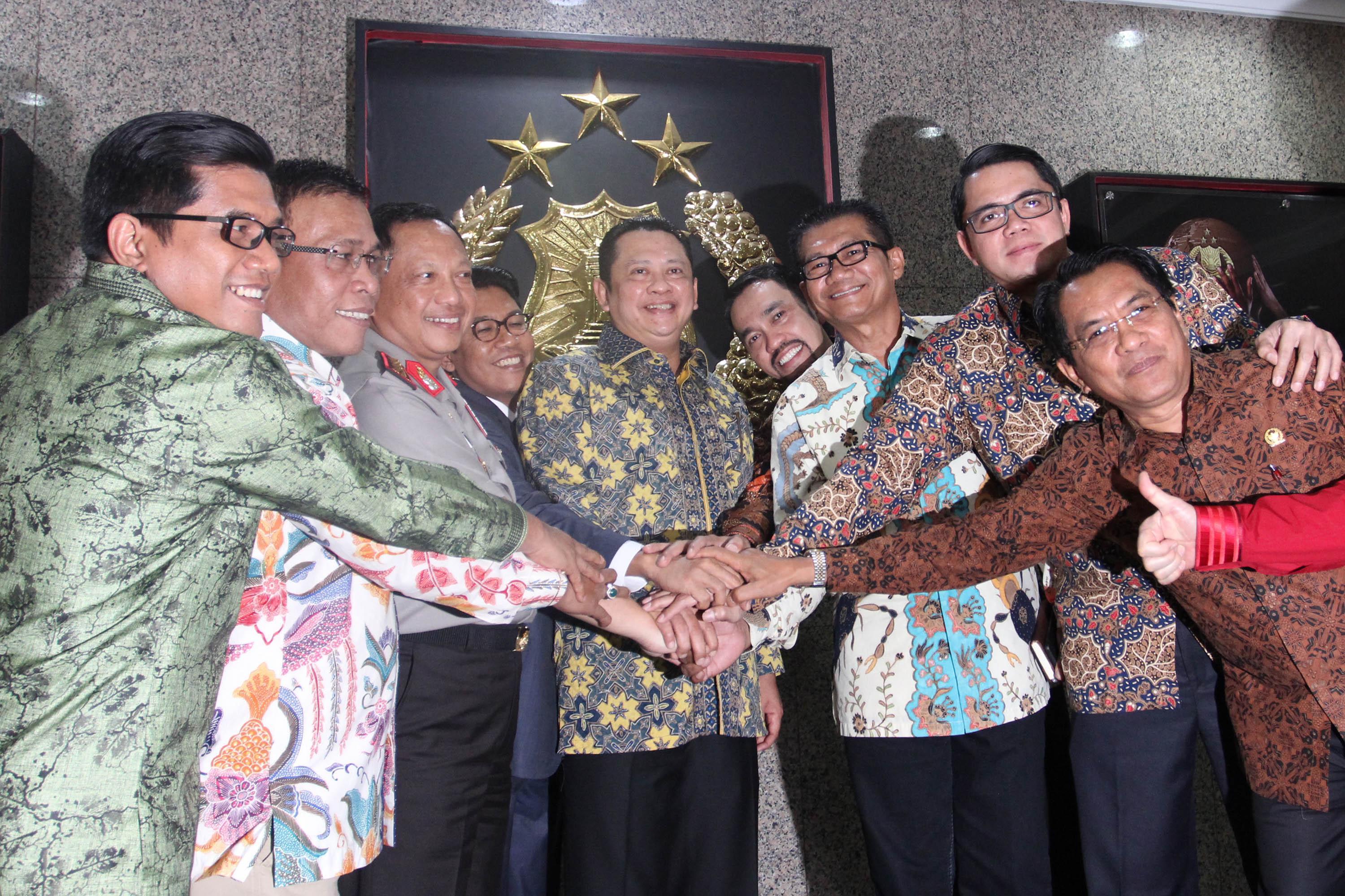 Kapolri Jenderal Polisi Tito Karnavian (ketiga dari kiri), Ketua Pansus Hak Angket DPR untuk KPK Agun Gunandjar Sudarsa (ketiga dari kanan) bersama sejumlah anggota Pansus Hak Angket DPR untuk KPK diantaranya Bambang Soesatyo (tengah), Muhammad Misbkhun (keempat dari kiri) dan Masinton Pasaribu (kedua dari kiri), menumpak tangan usai melakukan pertemuan di Mabes Polri, Jakarta, Rabu (12/7). Pansus Hak Angket DPR untuk KPK, berkoordinasi sekaligus meminta dukungan agar Kepolian turut mengawal penyelidikan yang dilakukan Pansus KPK agar berjalan efektif dan efisien sejalan dengan aturan Undang Undang sehingga tidak menimbulkan kegaduhan. AKTUAL/Tino Oktaviano