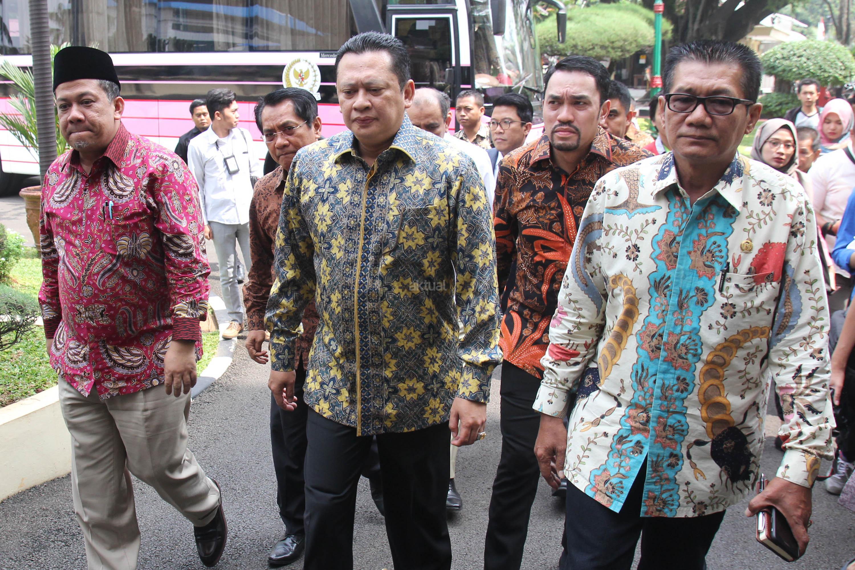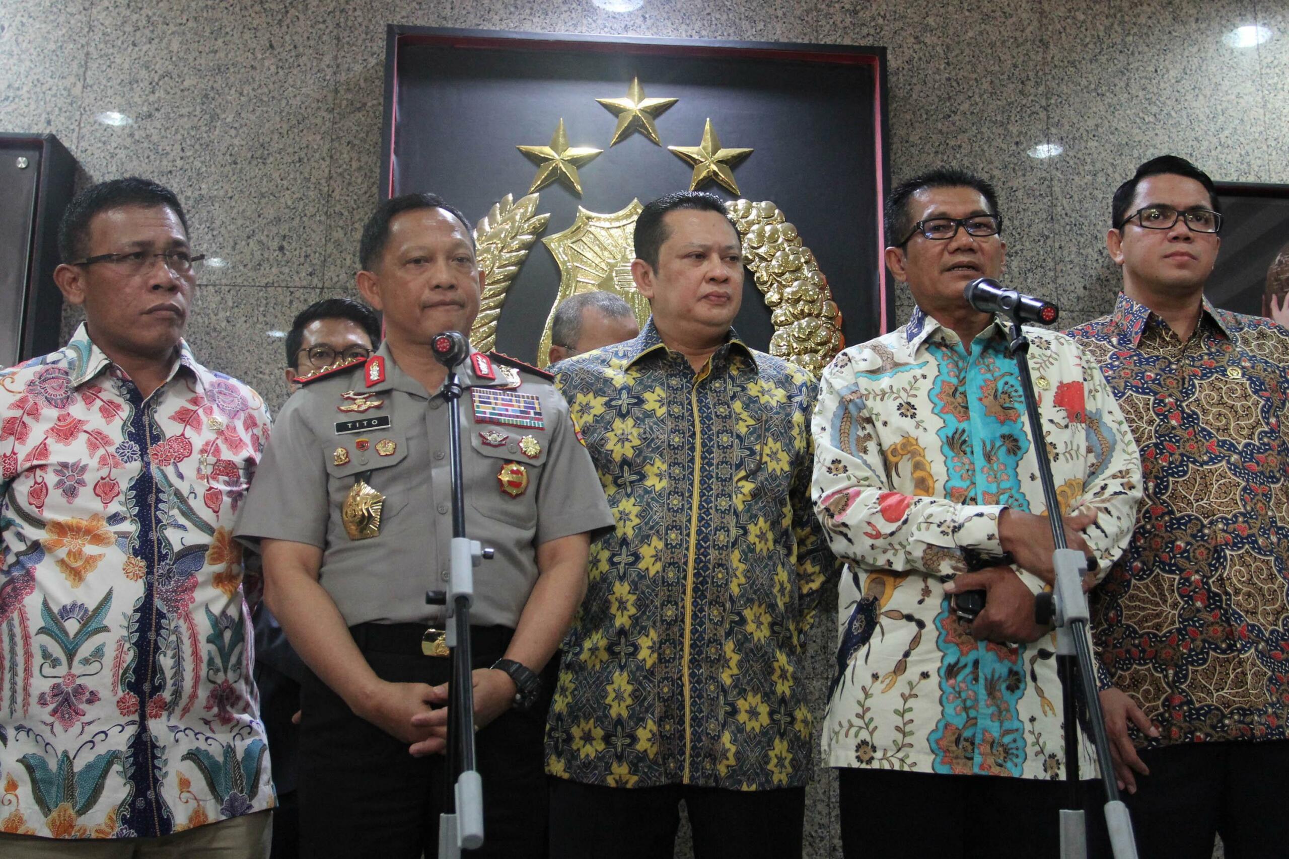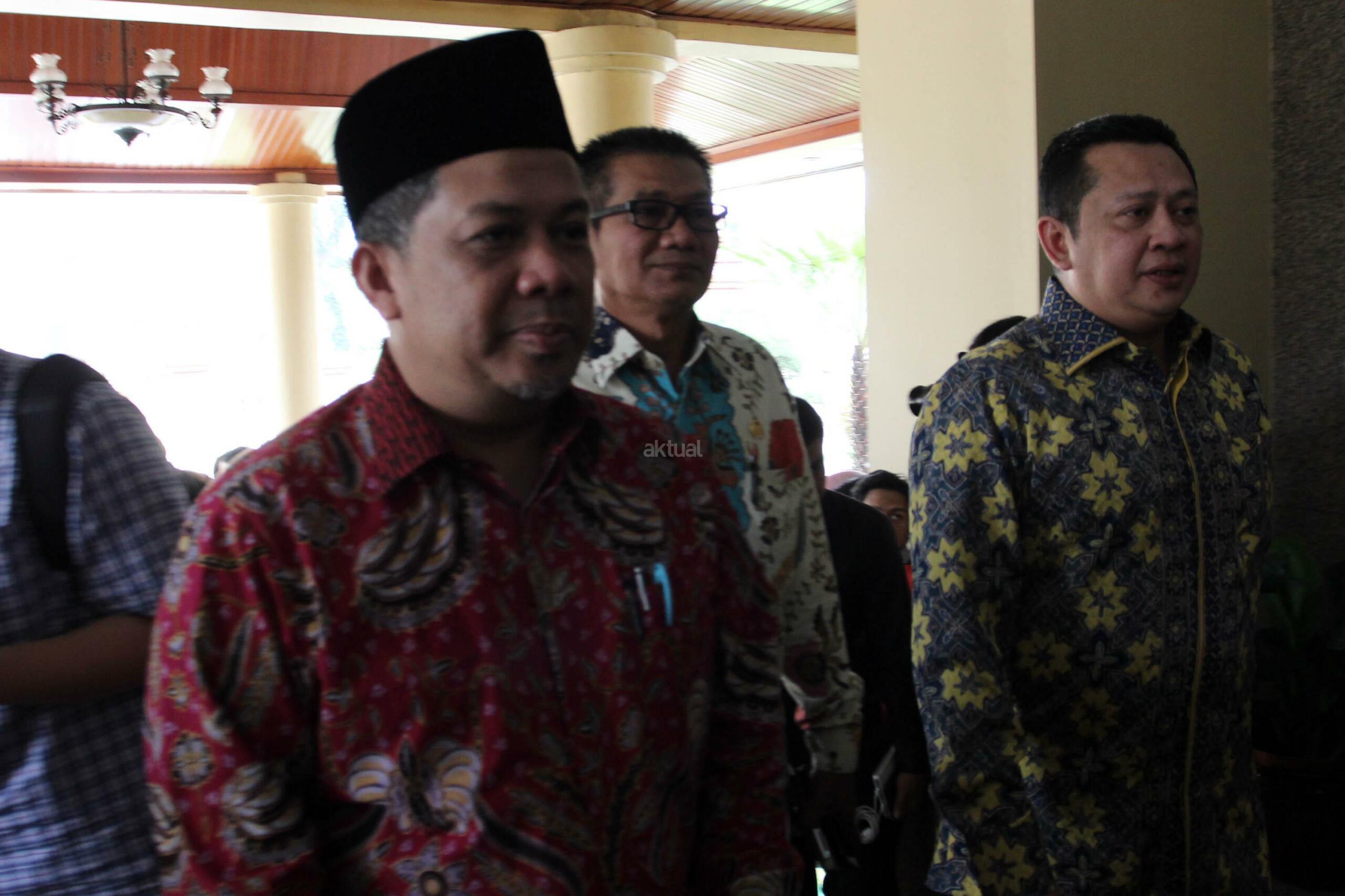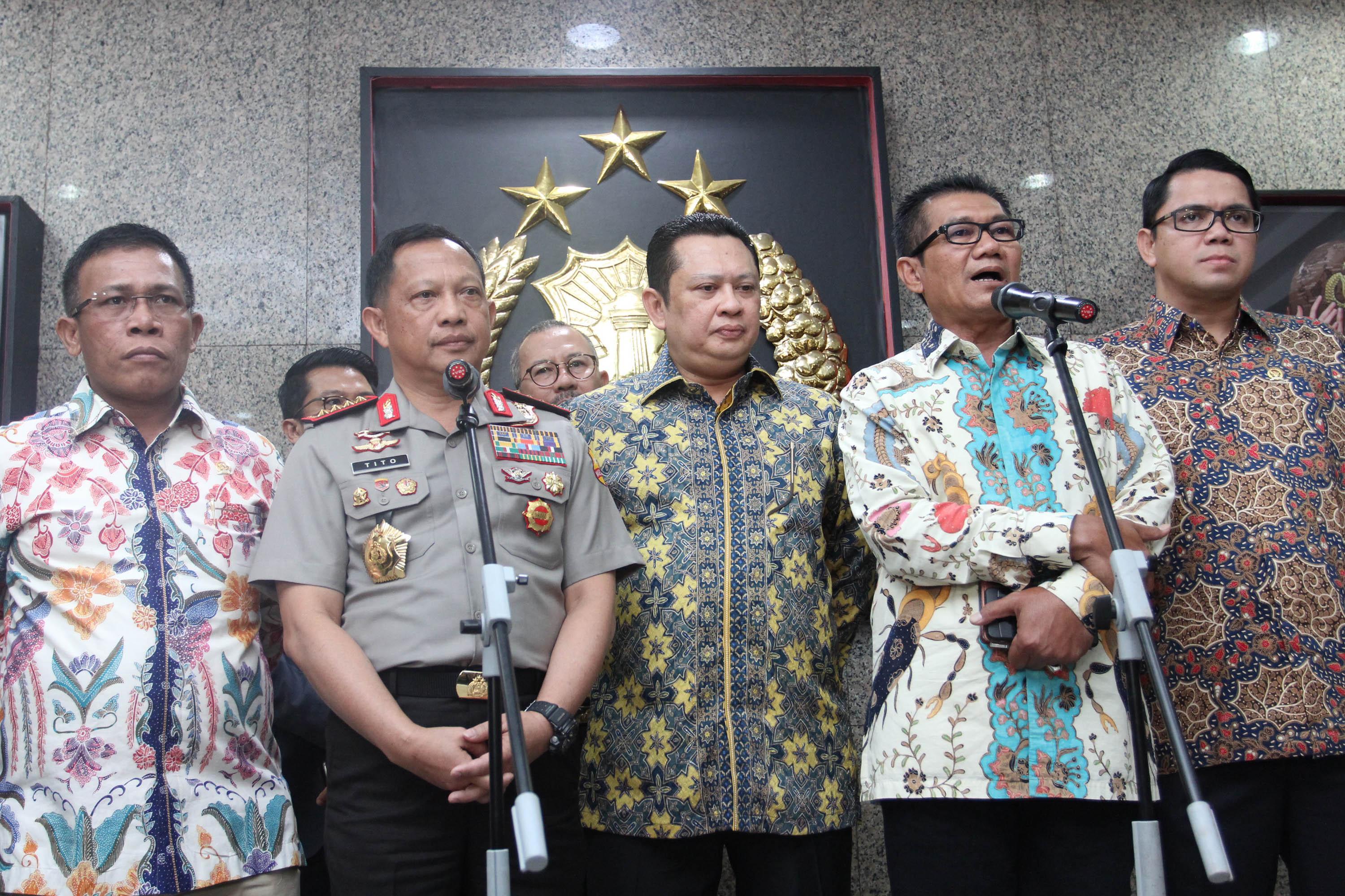 PAWakil Ketua DPR Fahri Hamzah (kiri) Ketua Pansus Hak Angket DPR untuk KPK Agun Gunandjar Sudarsa (kanan) anggota Pansus Hak Angket DPR untuk KPK Bambang Soesatyo (tengah), dan sejumlah naggota Pansus mendatangi Mabes Polri, Jakarta, Rabu (12/7). Kedatangan Pansus Hak Angket DPR untuk KPK, berkoordinasi sekaligus meminta dukungan agar Kepolian turut mengawal penyelidikan yang dilakukan Pansus KPK agar berjalan efektif dan efisien sejalan dengan aturan Undang Undang sehingga tidak menimbulkan kegaduhan. AKTUAL/Tino Oktaviano