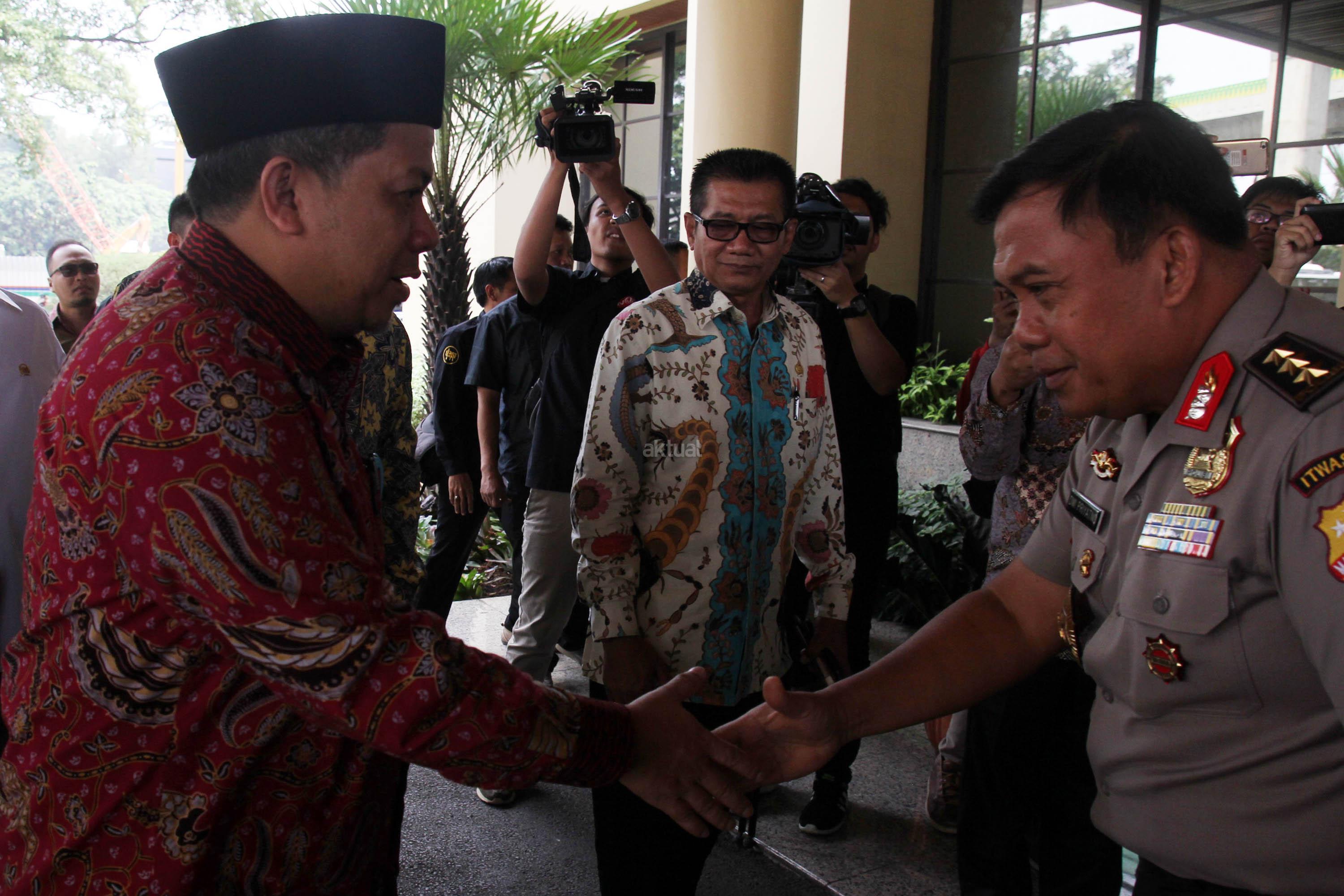 Wakil Ketua DPR Fahri Hamzah (kiri) Ketua Pansus Hak Angket DPR untuk KPK Agun Gunandjar Sudarsa (tengah) bersama sejumalh anggota Pansus Hak Angket DPR untuk KPK, mendatangi Mabes Polri, Jakarta, Rabu (12/7). Kedatangan Pansus Hak Angket DPR untuk KPK, berkoordinasi sekaligus meminta dukungan agar Kepolian turut mengawal penyelidikan yang dilakukan Pansus KPK agar berjalan efektif dan efisien sejalan dengan aturan Undang Undang sehingga tidak menimbulkan kegaduhan. AKTUAL/Tino Oktaviano