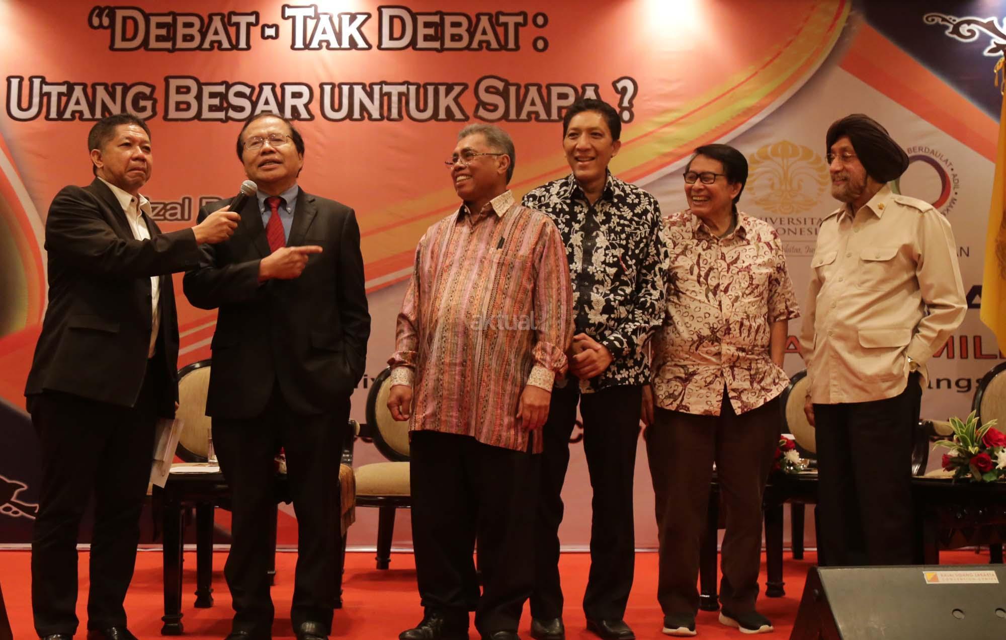 Mantan Menko Kemaritiman Rizal Ramli bersama Ketua Aliansi Kebangsaan Pontjo Sutowo, Ekonom Senior HS Dilon, Pakar Soft Skill Universitas Indonesia (UI) Taufik Bahaudin dan Wakil Rektor Bidang Akademik dan Kemahasiswaan Universitas Indonesia Bambang Wibawarta saat diskusi serial untuk edukasi pemilih dengan tema "Debat-Tak Debat: Utang Besar Buat Siapa? di Jakarta Convention Center, Senayan, Jakarta, Selasa (3/7/2018). Rizal Ramli mengungkapkan bahwa kondisi perekonomian Indonesia, khususnya masalah utang sedang dalam kondisi yang kurang sehat. Namun, pemerintah selalu mengelak dengan menyatakan bahwa utang Indonesia masih aman. Dan pemerintah selalu membandingkan rasio utang Indonesia lebih baik dengan negara lain seperti Amerika Serikat (AS) dan Jepang. Padahal, perbandingan tersebut tak sesuai untuk dilakukan. AKTUAL/Tino Oktaviano