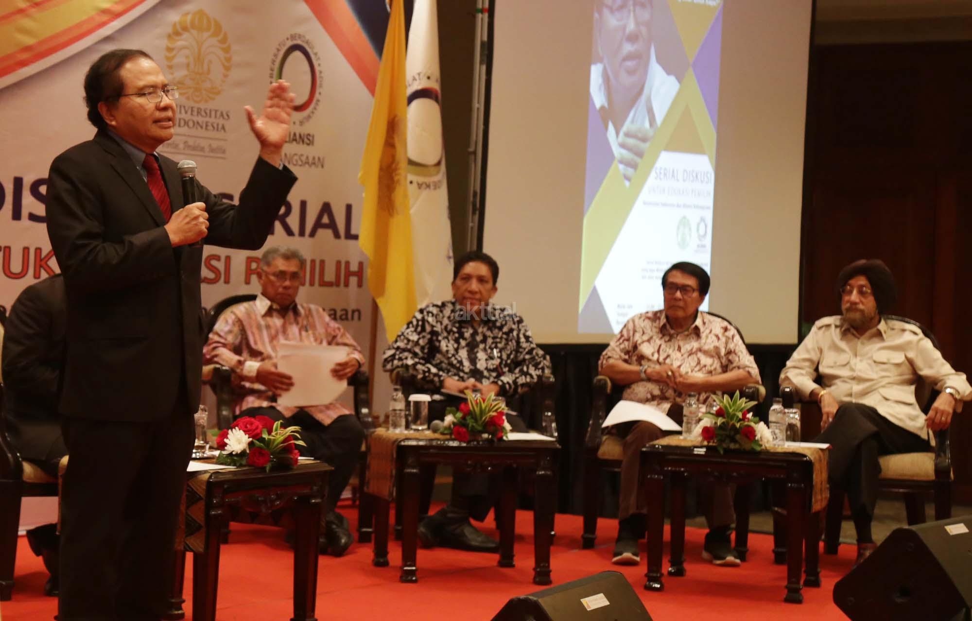 Mantan Menko Kemaritiman Rizal Ramli saat diskusi serial untuk edukasi pemilih dengan tema “Debat-Tak Debat: Utang Besar Buat Siapa? di Jakarta Convention Center, Senayan, Jakarta, Selasa (3/7/2018). Rizal Ramli mengungkapkan bahwa kondisi perekonomian Indonesia, khususnya masalah utang sedang dalam kondisi yang kurang sehat. Namun, pemerintah selalu mengelak dengan menyatakan bahwa utang Indonesia masih aman. Dan pemerintah selalu membandingkan rasio utang Indonesia lebih baik dengan negara lain seperti Amerika Serikat (AS) dan Jepang. Padahal, perbandingan tersebut tak sesuai untuk dilakukan. AKTUAL/Tino Oktaviano