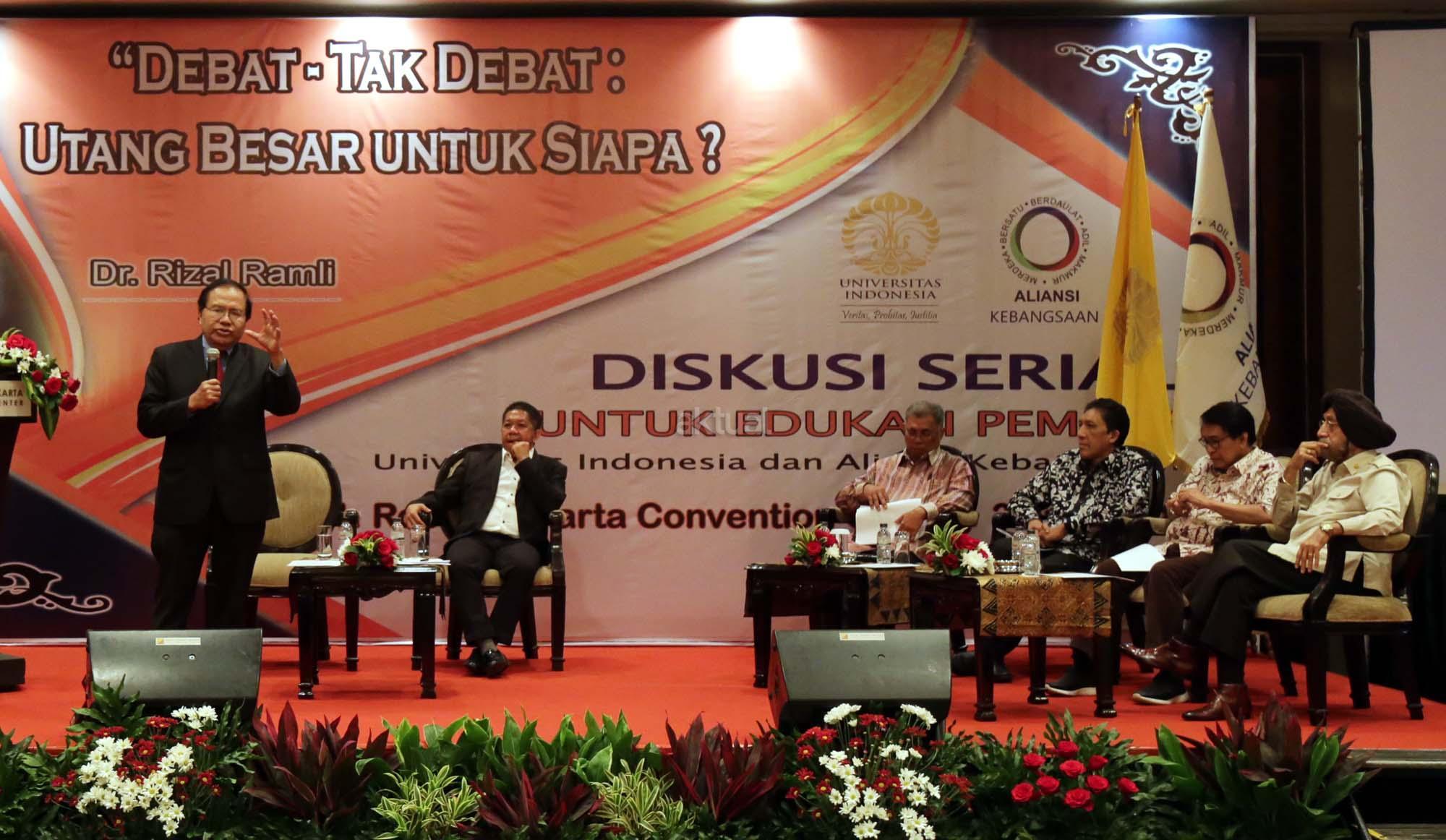 Mantan Menko Kemaritiman Rizal Ramli (tengah) saat diskusi serial untuk edukasi pemilih dengan tema “Debat-Tak Debat: Utang Besar Buat Siapa? di Jakarta Convention Center, Senayan, Jakarta, Selasa (3/7/2018). Rizal Ramli mengungkapkan bahwa kondisi perekonomian Indonesia, khususnya masalah utang sedang dalam kondisi yang kurang sehat. Namun, pemerintah selalu mengelak dengan menyatakan bahwa utang Indonesia masih aman. Dan pemerintah selalu membandingkan rasio utang Indonesia lebih baik dengan negara lain seperti Amerika Serikat (AS) dan Jepang. Padahal, perbandingan tersebut tak sesuai untuk dilakukan. AKTUAL/Tino Oktaviano