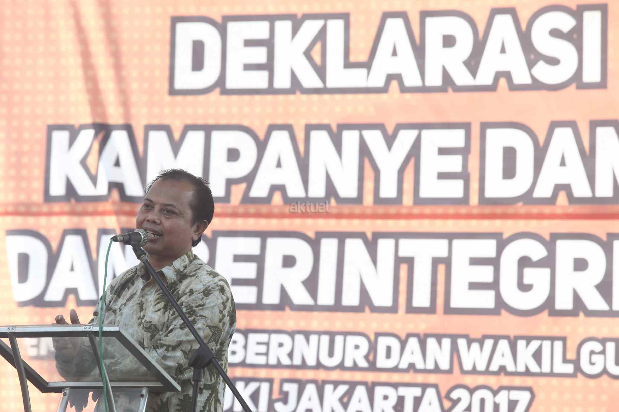 Ketua KPUD DKI Jakarta Sumarno memberikan sambutan saat deklarasi kampanye damai di Silang Barat Daya Monas, Jakarta Pusat, Sabtu (29/10). Tiga pasangan calon gubernur dan calon wakil gubernur DKI Jakarta yang maju di Pemilihan Kepala Daerah (Pilkada) DKI 2017 menandatangani prasasti damai. Selain penandatangan prasasti, kampanye damai juga diramaikan dengan arak-arakan kendaraan hias. AKTUAL/Tino Oktaviano