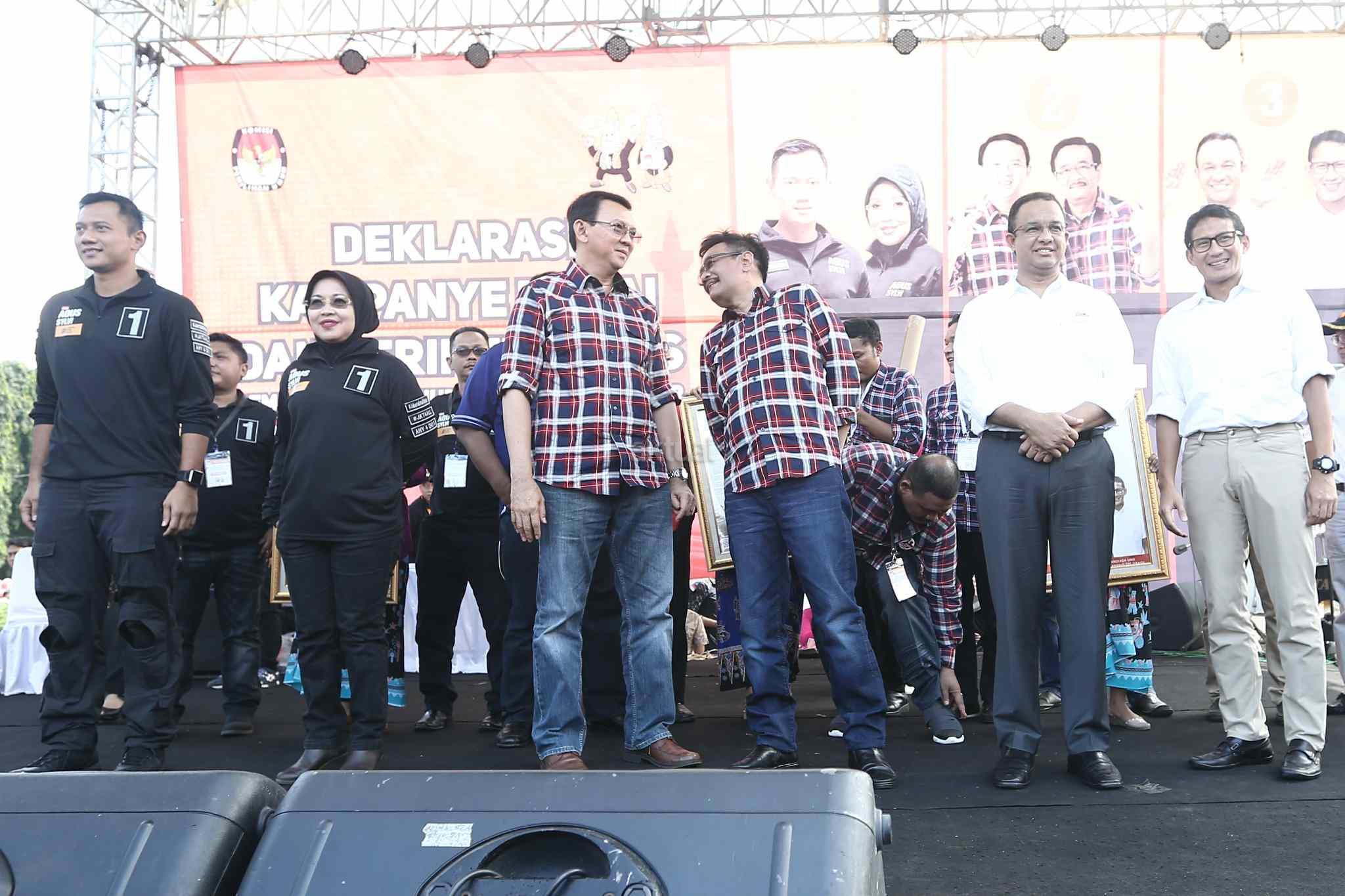 Ketua KPUD DKI Jakarta Sumarno bersama berfoto bersama dengan pasangan cagub-cawagub DKI Jakarta Agus Harimurti Yudhoyono - Sylviana Murni, Basuki Tjahja Purnama (Ahok) - Djarot Saiful Hidayat dan Anies Baswedan - Sandiaga Uno saat deklarasi kampanye damai di Silang Barat Daya Monas, Jakarta Pusat, Sabtu (29/10). Tiga pasangan calon gubernur dan calon wakil gubernur DKI Jakarta yang maju di Pemilihan Kepala Daerah (Pilkada) DKI 2017 menandatangani prasasti damai. Selain penandatangan prasasti, kampanye damai juga diramaikan dengan arak-arakan kendaraan hias. AKTUAL/Tino Oktaviano