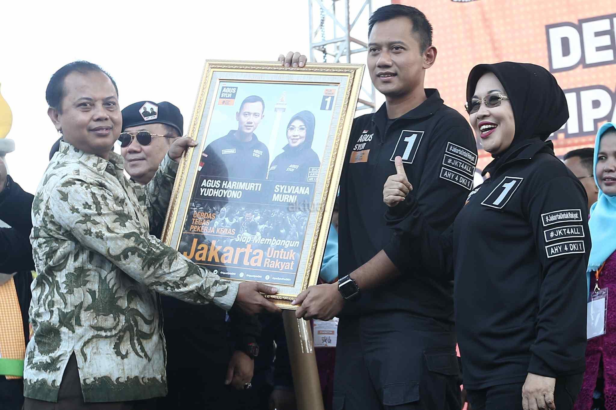 Ketua KPUD DKI Jakarta Sumarno memberikan alat peraga kampanye kepada pasangan cagub-cawagub DKI Jakarta Agus Harimurti Yudhoyono – Sylviana Murni saat deklarasi kampanye damai di Silang Barat Daya Monas, Jakarta Pusat, Sabtu (29/10). Tiga pasangan calon gubernur dan calon wakil gubernur DKI Jakarta yang maju di Pemilihan Kepala Daerah (Pilkada) DKI 2017 menandatangani prasasti damai. Selain penandatangan prasasti, kampanye damai juga diramaikan dengan arak-arakan kendaraan hias. AKTUAL/Tino Oktaviano
