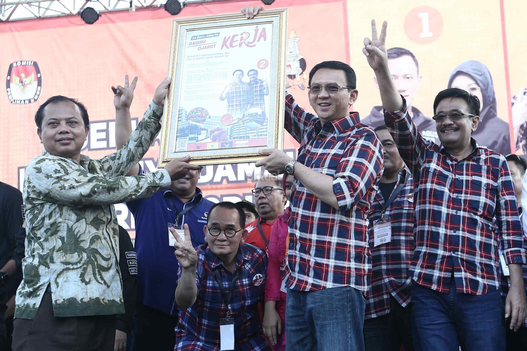 Ketua KPUD DKI Jakarta Sumarno memberikan alat peraga kampanye kepada pasangan cagub-cawagub DKI Jakarta Basuki Tjahja Purnama (Ahok) – Djarot Saiful Hidayat saat deklarasi kampanye damai di Silang Barat Daya Monas, Jakarta Pusat, Sabtu (29/10). Tiga pasangan calon gubernur dan calon wakil gubernur DKI Jakarta yang maju di Pemilihan Kepala Daerah (Pilkada) DKI 2017 menandatangani prasasti damai. Selain penandatangan prasasti, kampanye damai juga diramaikan dengan arak-arakan kendaraan hias. AKTUAL/Tino Oktaviano