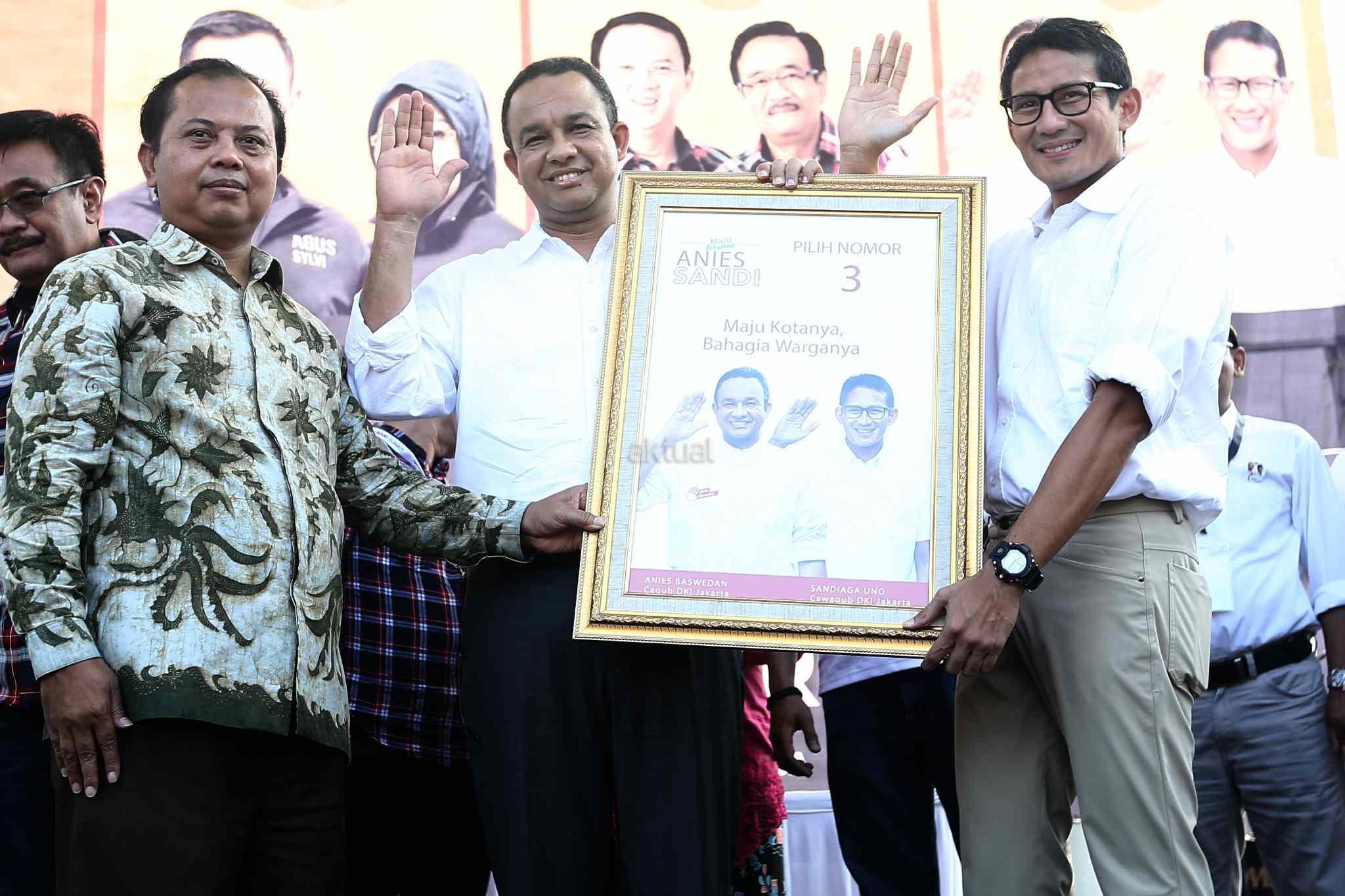 Ketua KPUD DKI Jakarta Sumarno memberikan alat peraga kampanye kepada pasangan cagub-cawagub DKI Jakarta Anies Baswedan – Sandiaga Uno saat deklarasi kampanye damai di Silang Barat Daya Monas, Jakarta Pusat, Sabtu (29/10). Tiga pasangan calon gubernur dan calon wakil gubernur DKI Jakarta yang maju di Pemilihan Kepala Daerah (Pilkada) DKI 2017 menandatangani prasasti damai. Selain penandatangan prasasti, kampanye damai juga diramaikan dengan arak-arakan kendaraan hias. AKTUAL/Tino Oktaviano