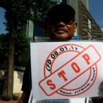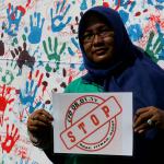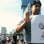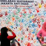 Warga berfoto saat deklarasi Masyarakat Anti Hoax di Kawasan Surdirman, Jakarta, Minggu (8/1/2017). Kegiatan ini merupakan aksi simpatik untuk mengajak masyarakat agar peduli dan memerangi persebaran informasi hoax yang marak di media sosial. AKTUAL/Munzir