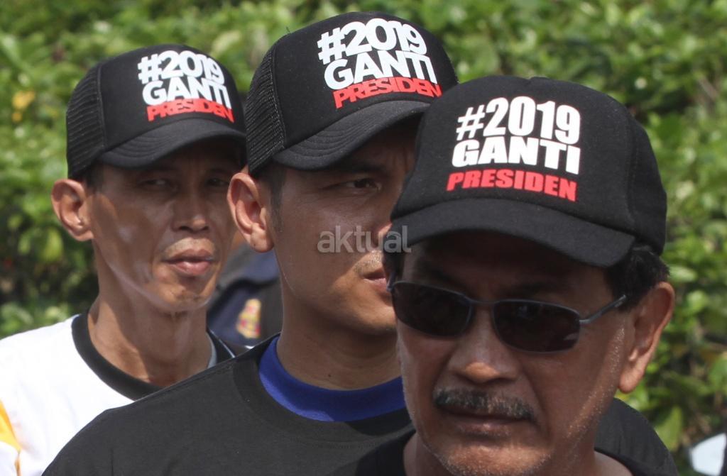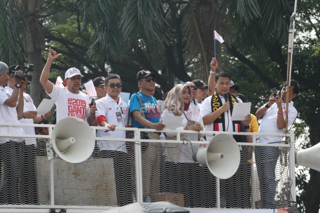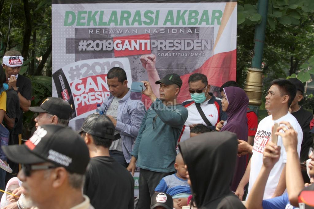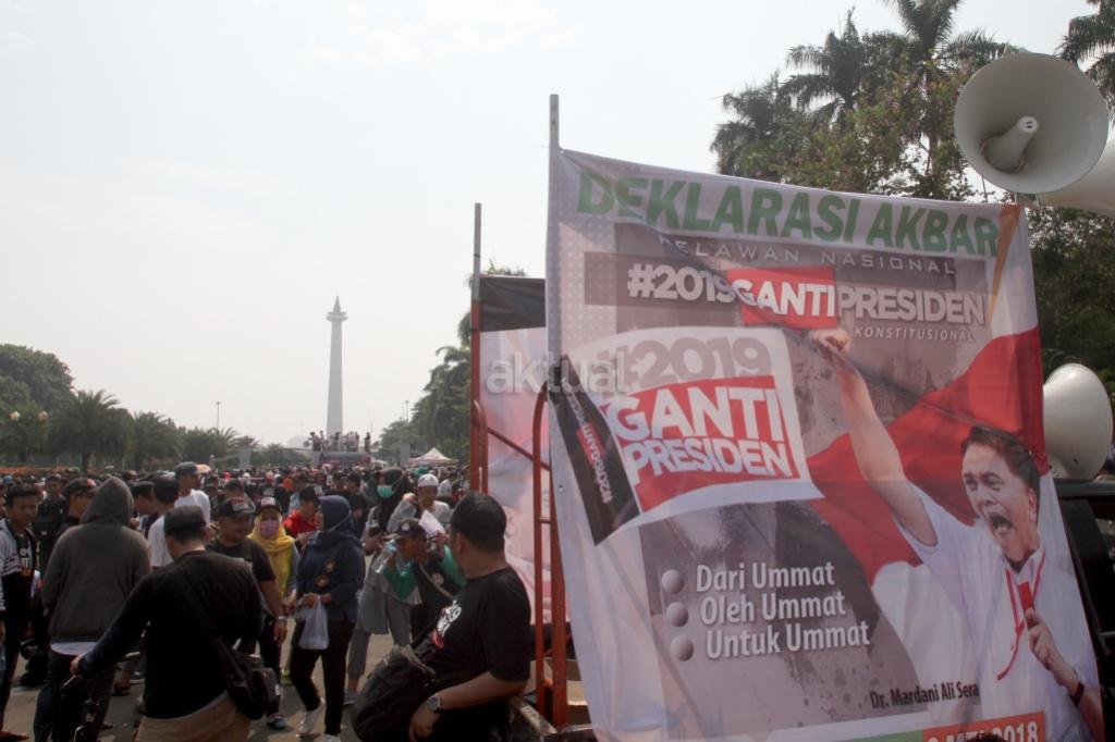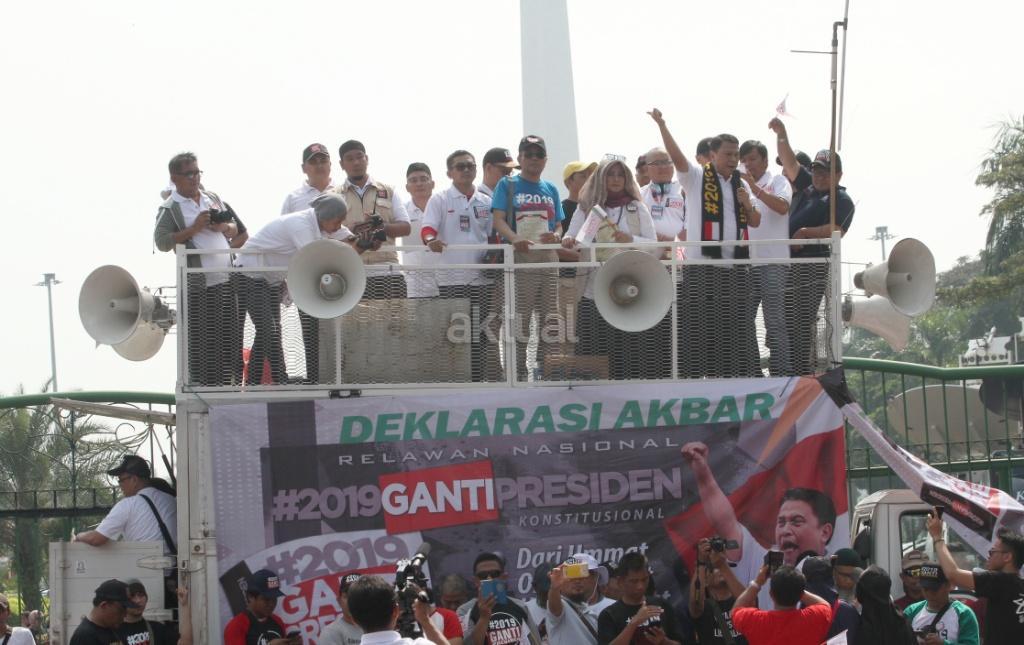 Ratusan relawan mendeklarasikan gerakan #2019GantiPresiden di pintu masuk Monas dekat Patung Arjuna Wiwaha, Jakarta Pusat, Minggu (6/5/18). Pembacaan deklarasi dipimpin politikus Partai Keadilan Sejahtera (PKS) Mardani Ali Sera. Gerakan ini lahir bukan dari tokoh partai politik, tapi merupakan aspirasi masyarakat. Gerakan ganti presiden adalah konstitusional dan diatur undang-undang. AKTUAL/Tino Oktaviano