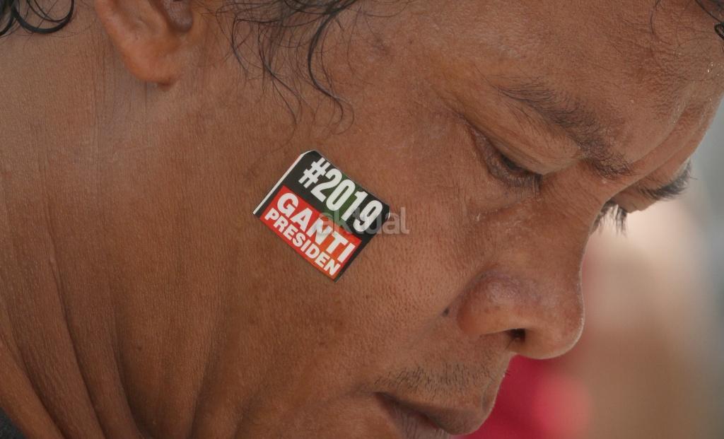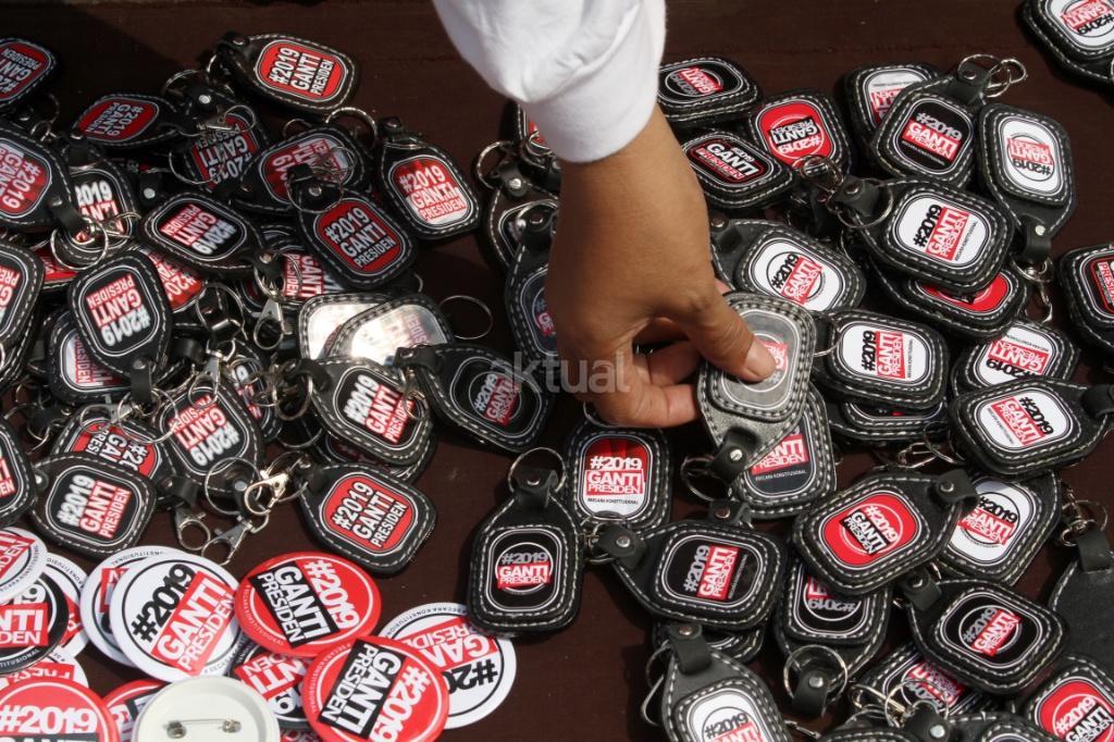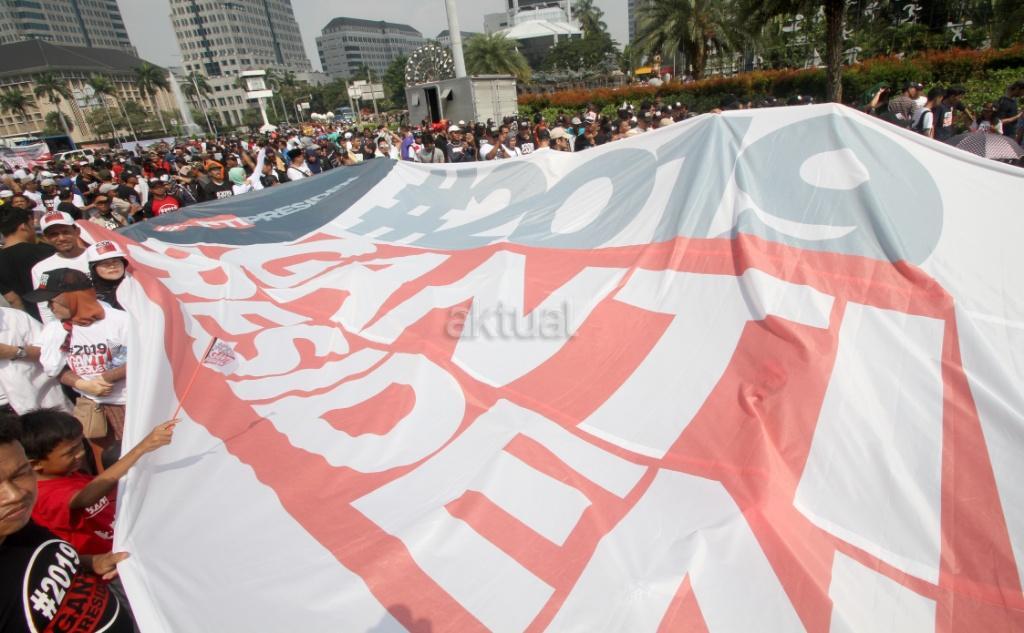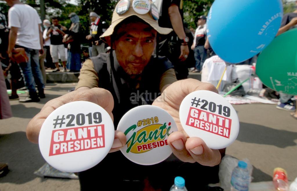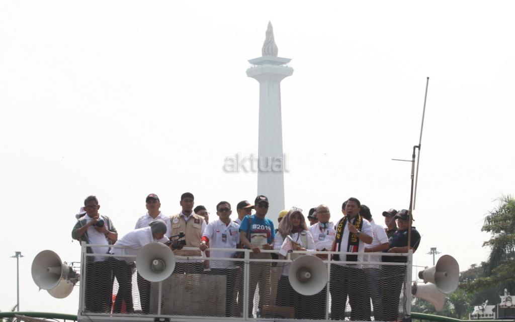 Ratusan relawan mendeklarasikan gerakan #2019GantiPresiden di pintu masuk Monas dekat Patung Arjuna Wiwaha, Jakarta Pusat, Minggu (6/5/18). Pembacaan deklarasi dipimpin politikus Partai Keadilan Sejahtera (PKS) Mardani Ali Sera. Gerakan ini lahir bukan dari tokoh partai politik, tapi merupakan aspirasi masyarakat. Gerakan ganti presiden adalah konstitusional dan diatur undang-undang. AKTUAL/Tino Oktaviano