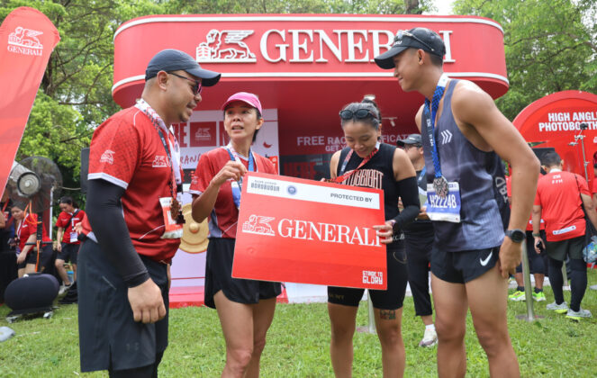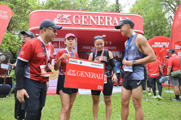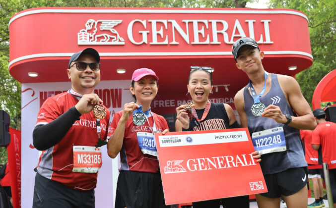 President Director and CEO Genali Indonesia Rebecca Tan (kedua dari kiri) didampingi Head of Corporate Communications, Windra Krismansyah (kiri) menyerahkan proteksi kepada perwakilan pelari Borobudur Marathon 2025, di Borobudur, Jawa Tengah, Minggu (16/11/2025).