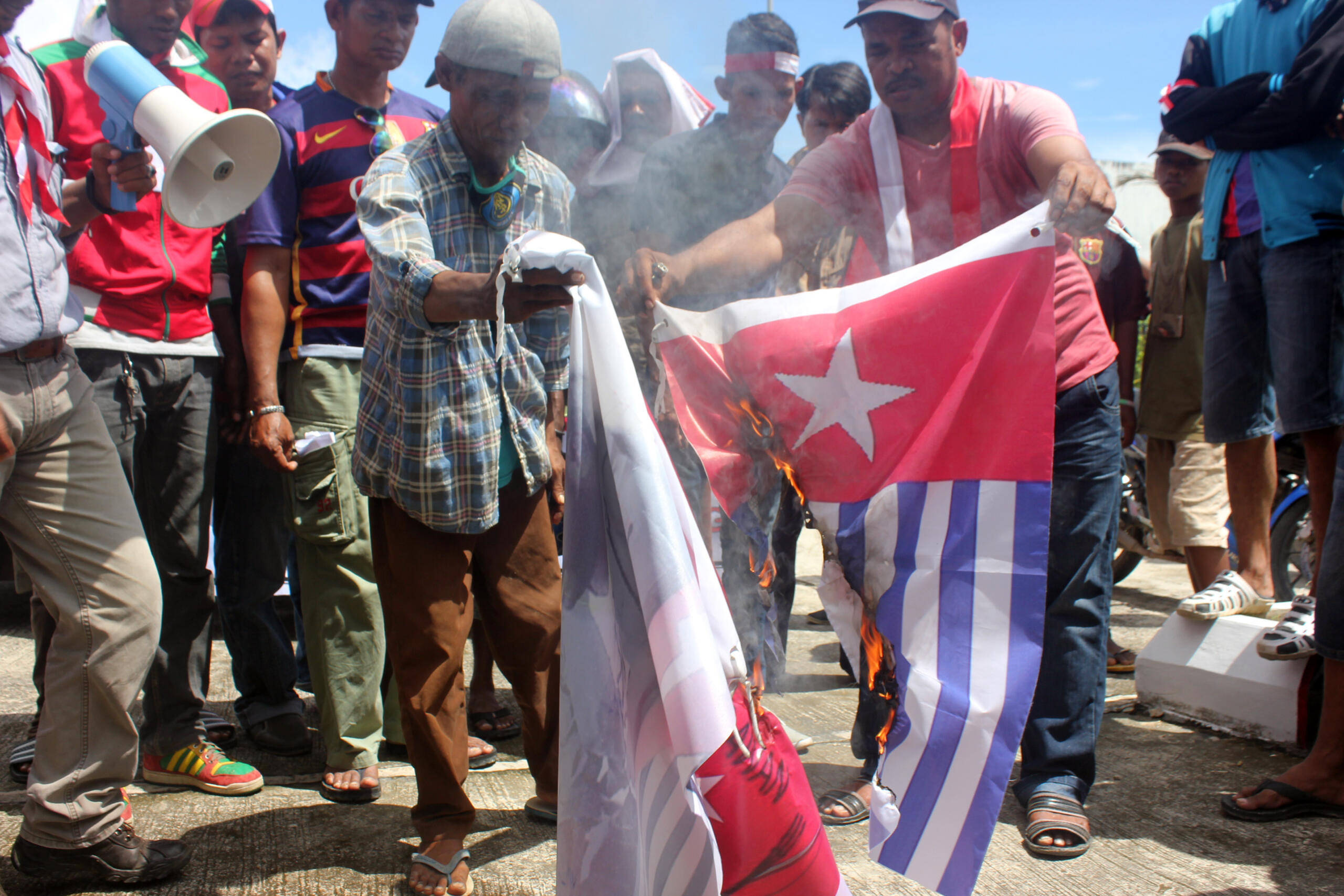 Kelompok Masyarakat Peduli NKRI membakar atribut KNPB saat berunjukrasa menolak keberadaan Organisasi Masyarakat (Ormas) Komite Nasional Papua Barat (KNPB) di halaman Kantor Walikota Sorong, Papua Barat, Selasa (31/5). Mereka menolak dan meminta pemerintah segera membubarkan Ormas KNPB karena bertentangan dengan Pancasila dan UUD 1945. ANTARA FOTO/Olha Mulalinda/pd/16