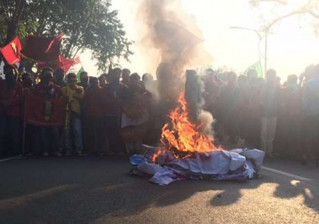 Jakarta, Aktual.co — Aksi demonstrasi di depan Istana Negara, Jakarta, Rabu (20/5), diwarnai dengan ketegangan, karena ratusan mahasiswa sempat membakar ban bekas dan boneka pocong yang disimbolkan sebagai Presiden Joko Widodo.