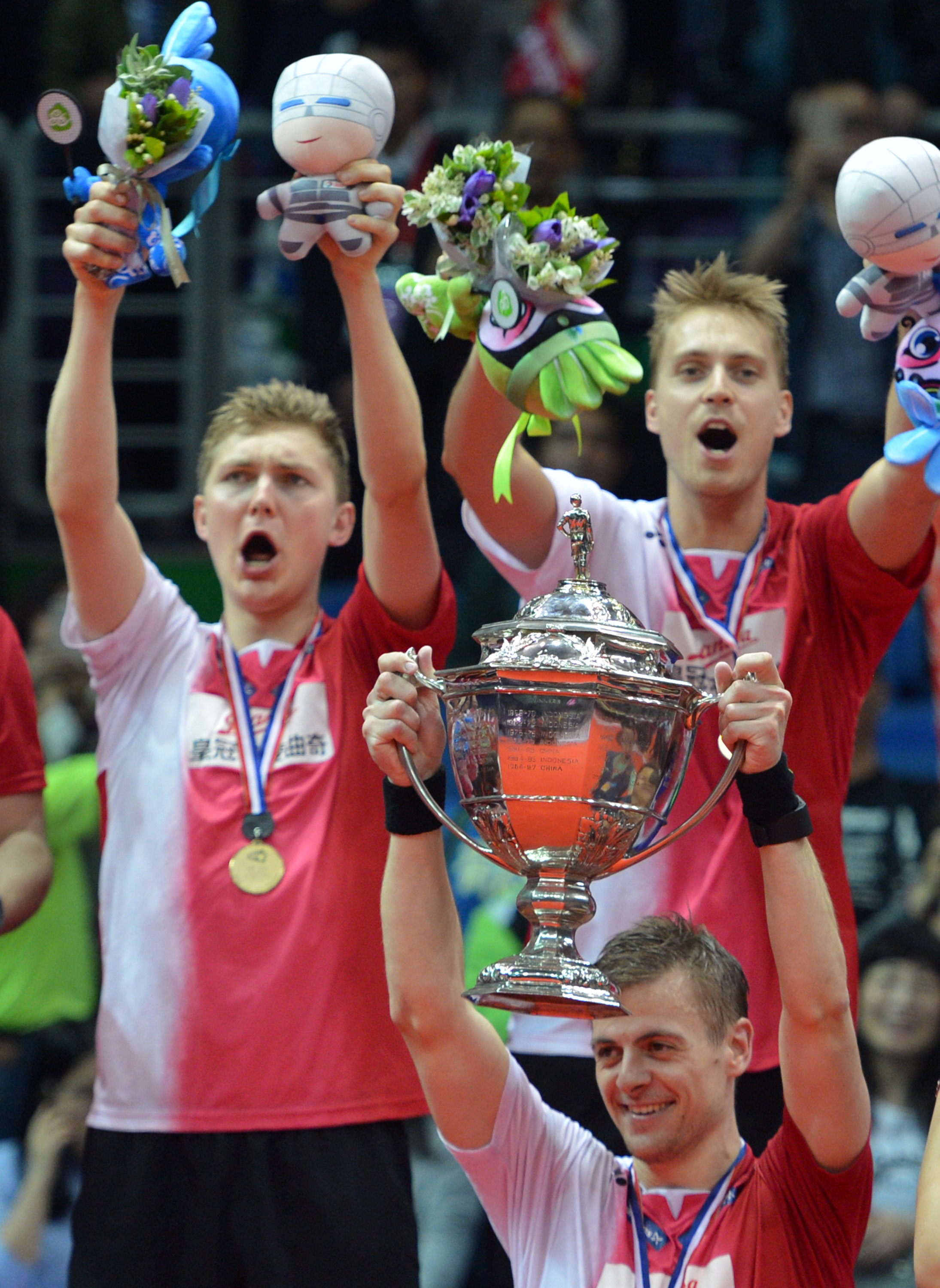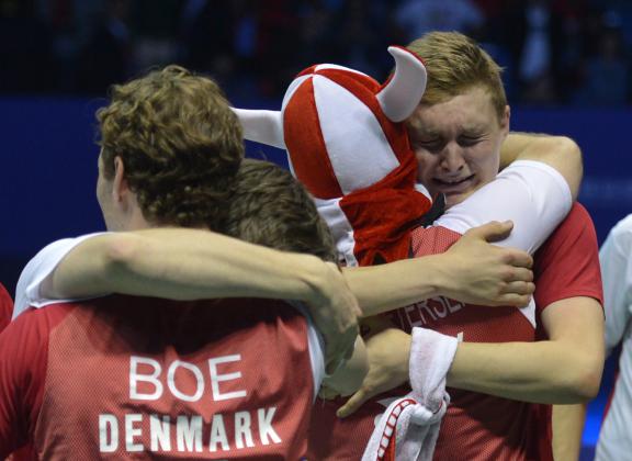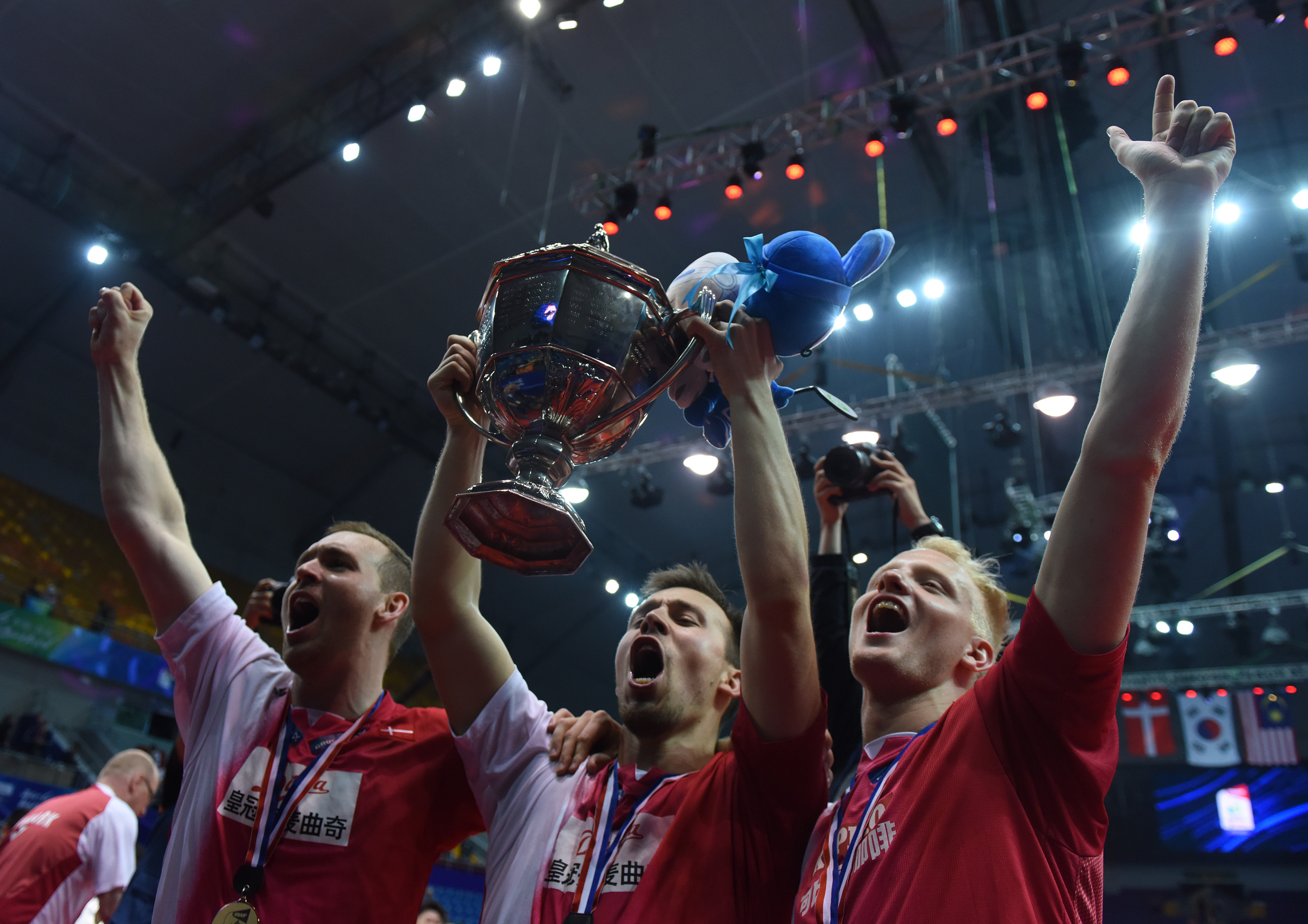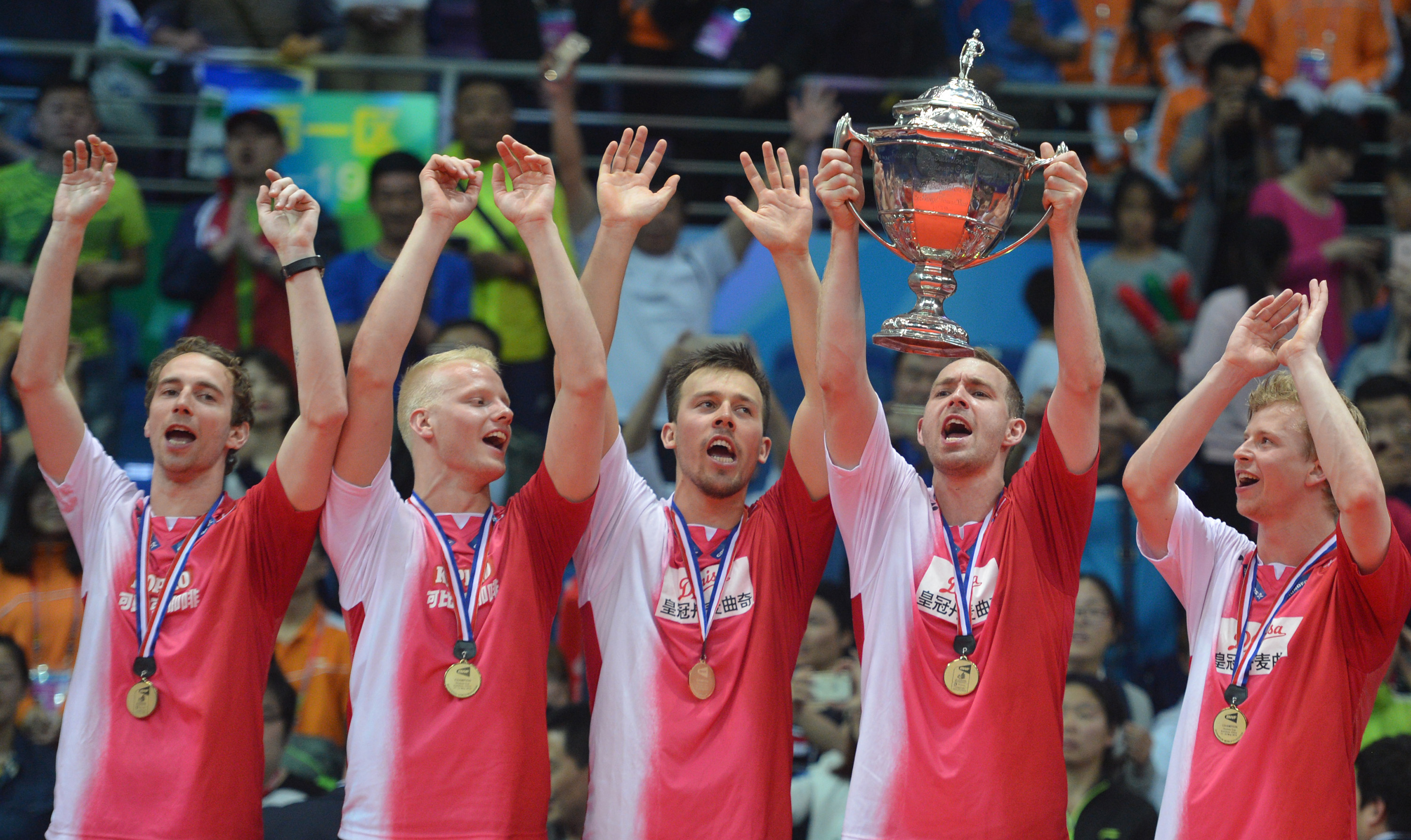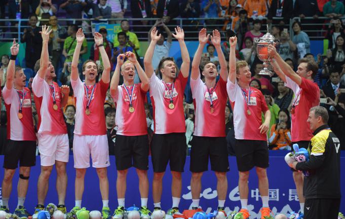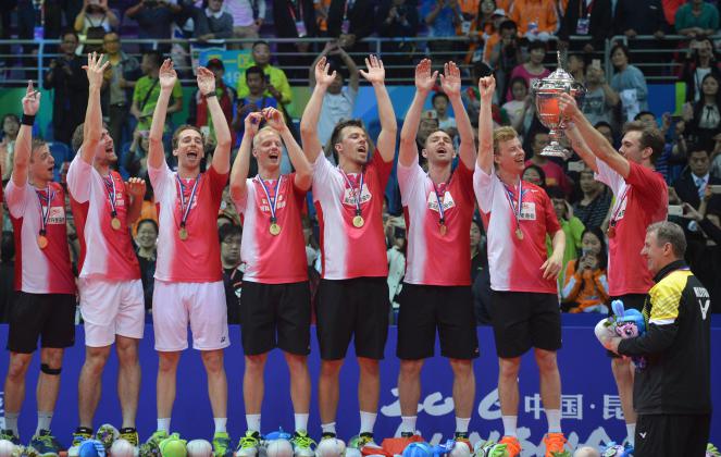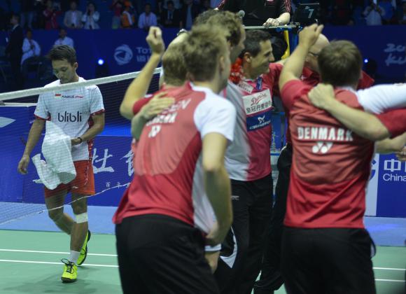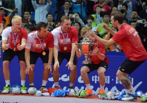 Para pebulu tangkis putra Denmark merayakan juara Piala Thomas 2016 di Kunshan Sport Center Gymnasium, Tiongkok, Minggu (22/5). Denmark menjadi juara Piala Thomas 2016 setelah di final mengalahkan Indonesia 2-3. ANTARA FOTO/Prasetyo Utomo/pd/16
