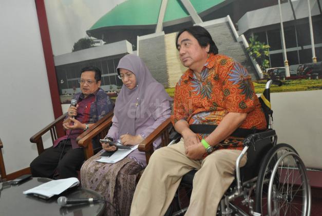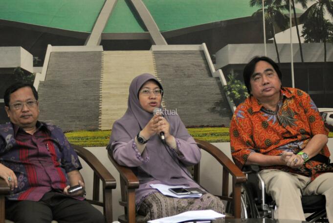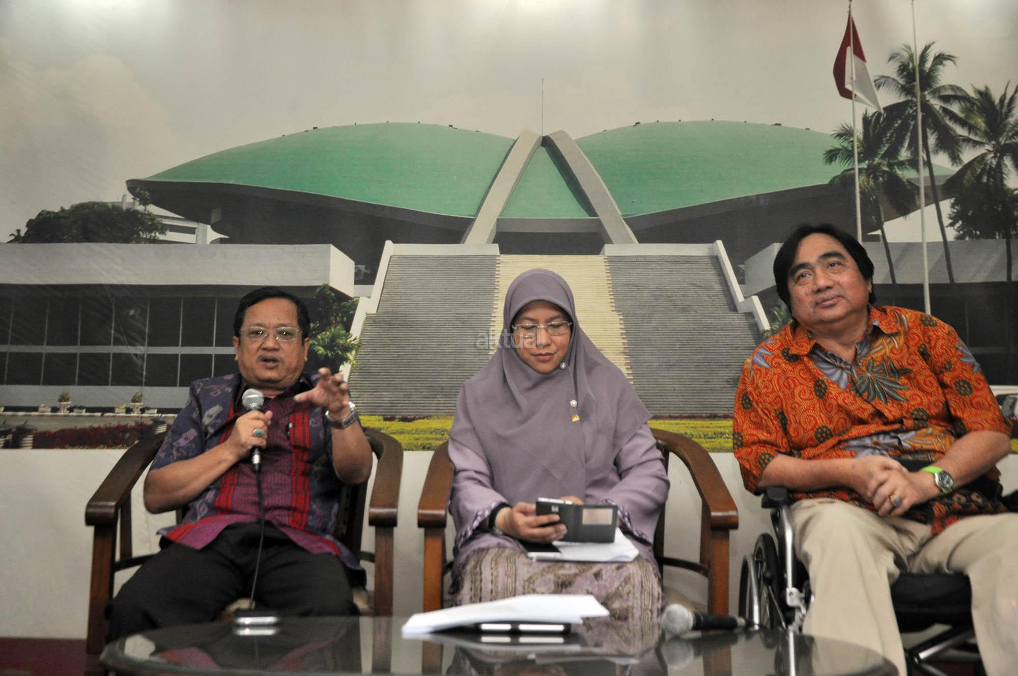Wakil Ketua Komisi VII DPR Ledia Hanifa Amaliyah (tengah) bersama Guru Besar UI Irwandi (kanan) dan Dirjen Kemensos Sumadi (kiri) menjadi pembicara dalam acara diskusi legislasi dengan tema "RUU Disabilitas", di gedung DPR, Jakarta, Selasa (30/6/2015).