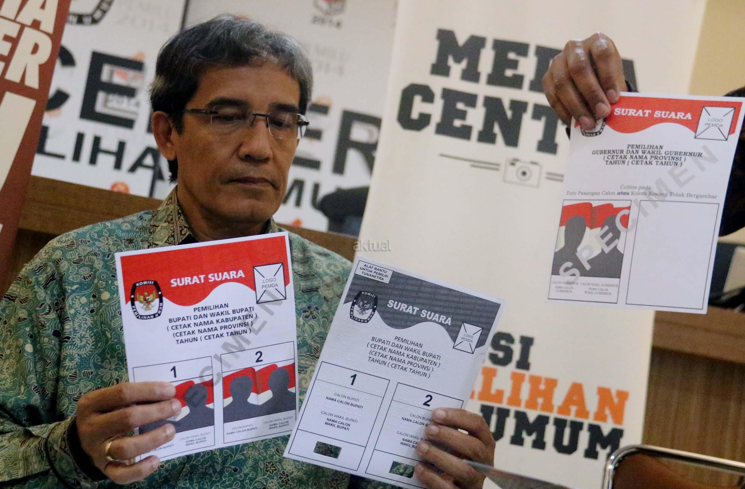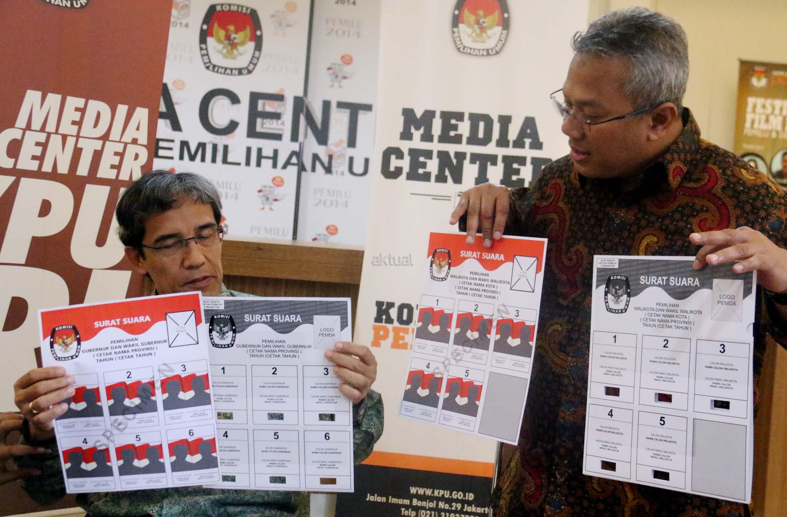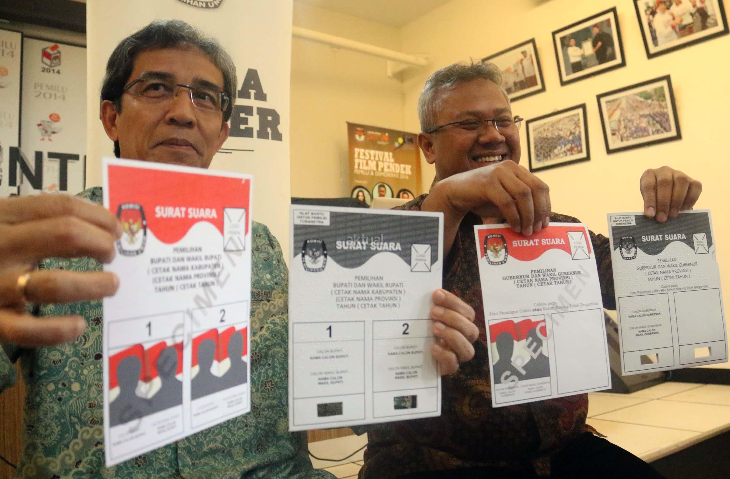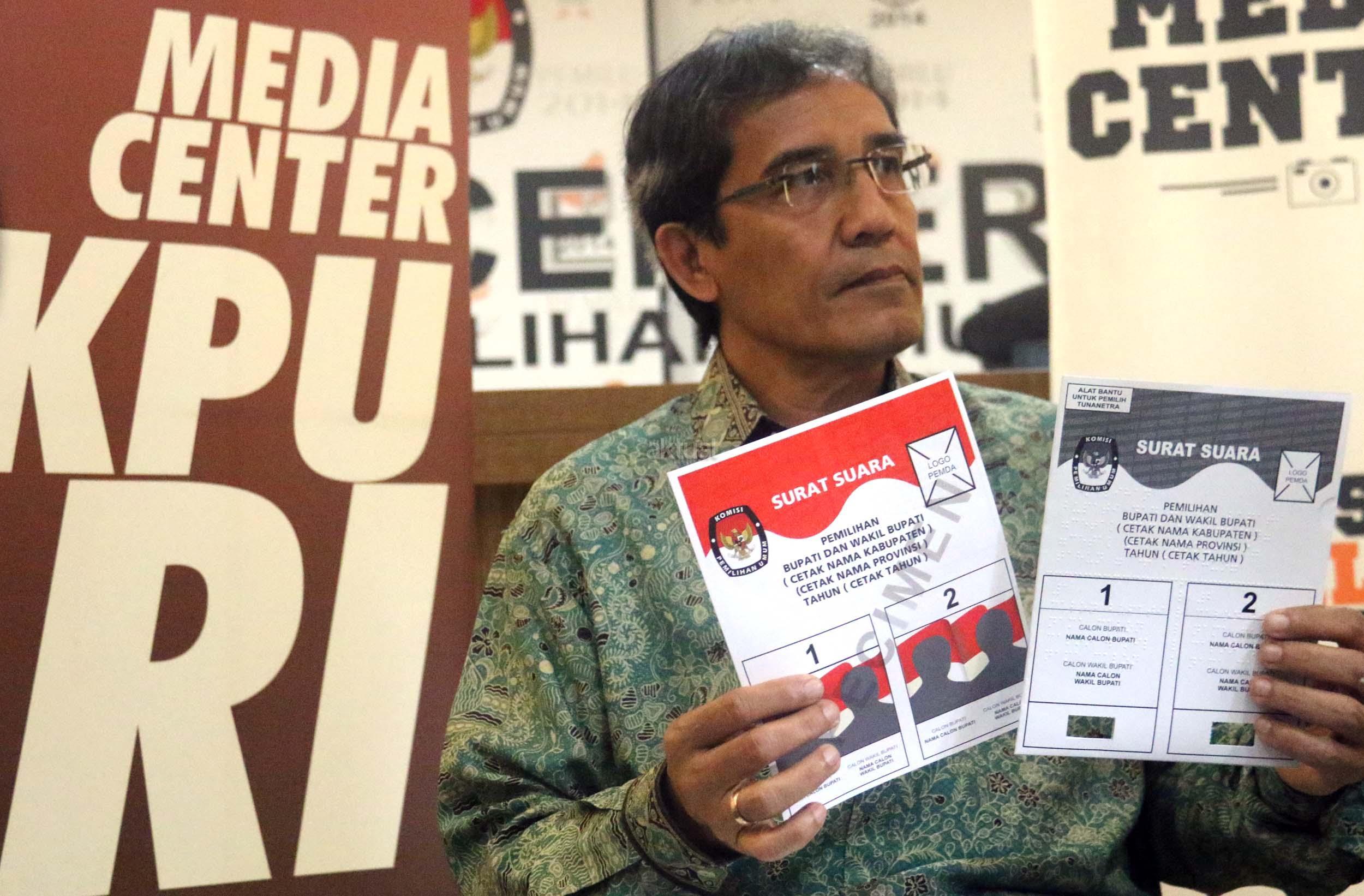 Komisioner KPU RI Hadar Nafis Gumay (kiri) bersama Komisioner KPU RI Arief Budiman (kanan) menunjukkan surat suara dan template surat suara Braille untuk para penyandang disabilitas dalam Pilkada di Kantor KPU Pusat, Jakarta, Rabu (4/1/2016). Komisi Pemilihan Umum menyediakan template surat suara Braille bagi pemilih penyandang tunanetra dimasing-masing TPS. Nantinya, surat suara akan diselipkan ke dalam template untuk kemudian dicoblos oleh pemilih. AKTUAL/Munzir