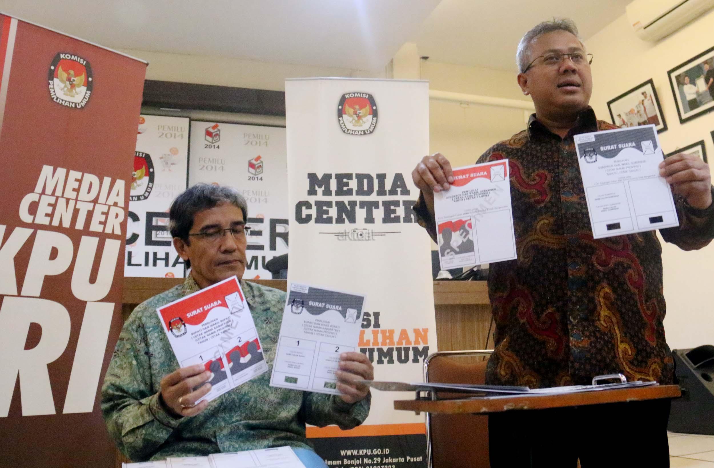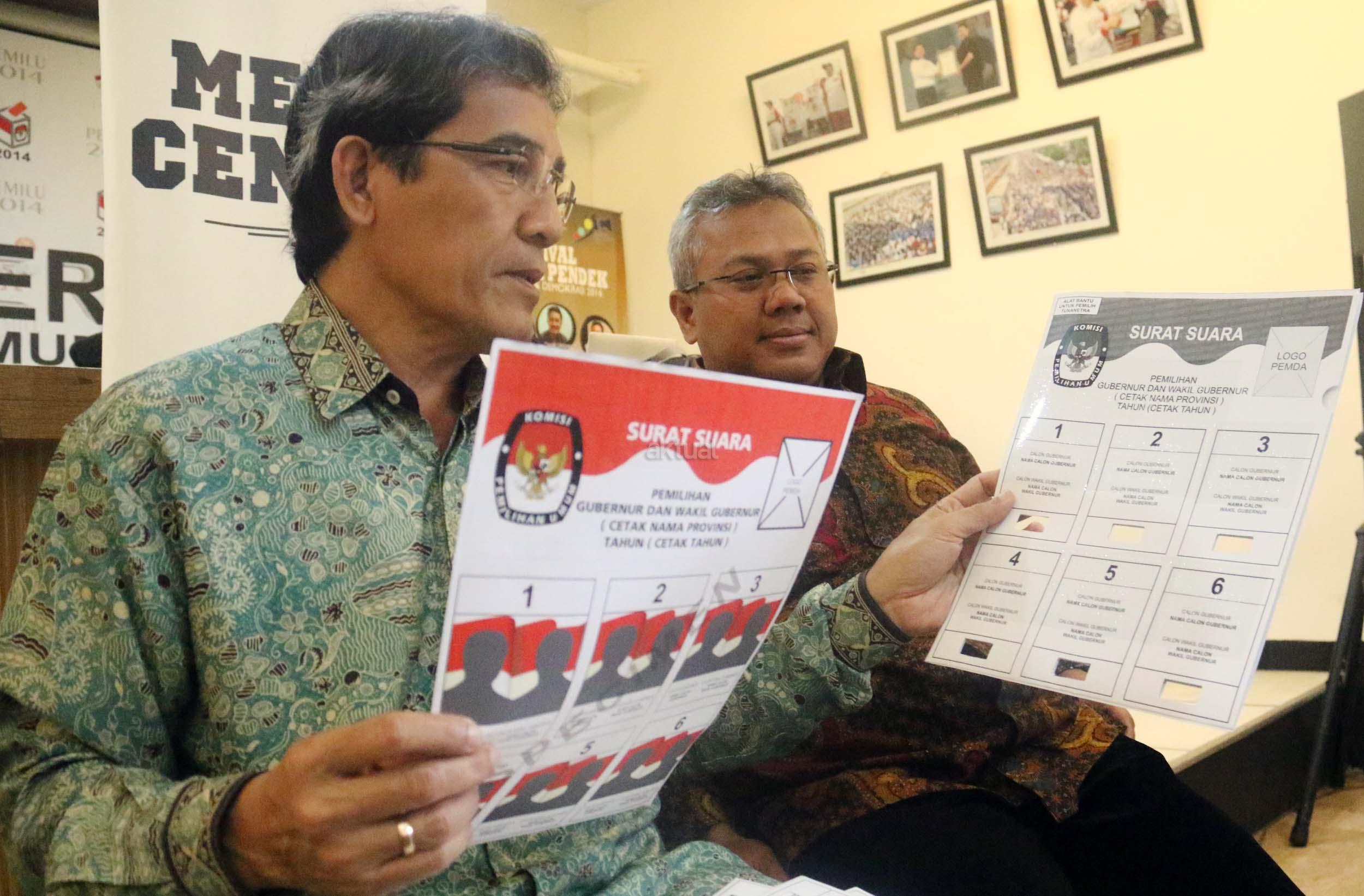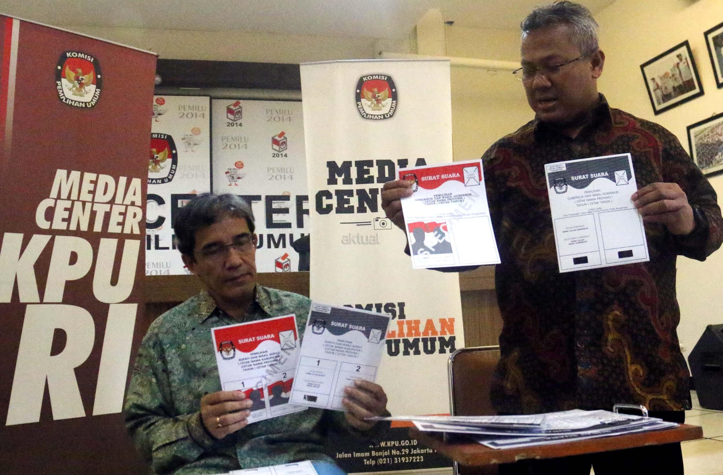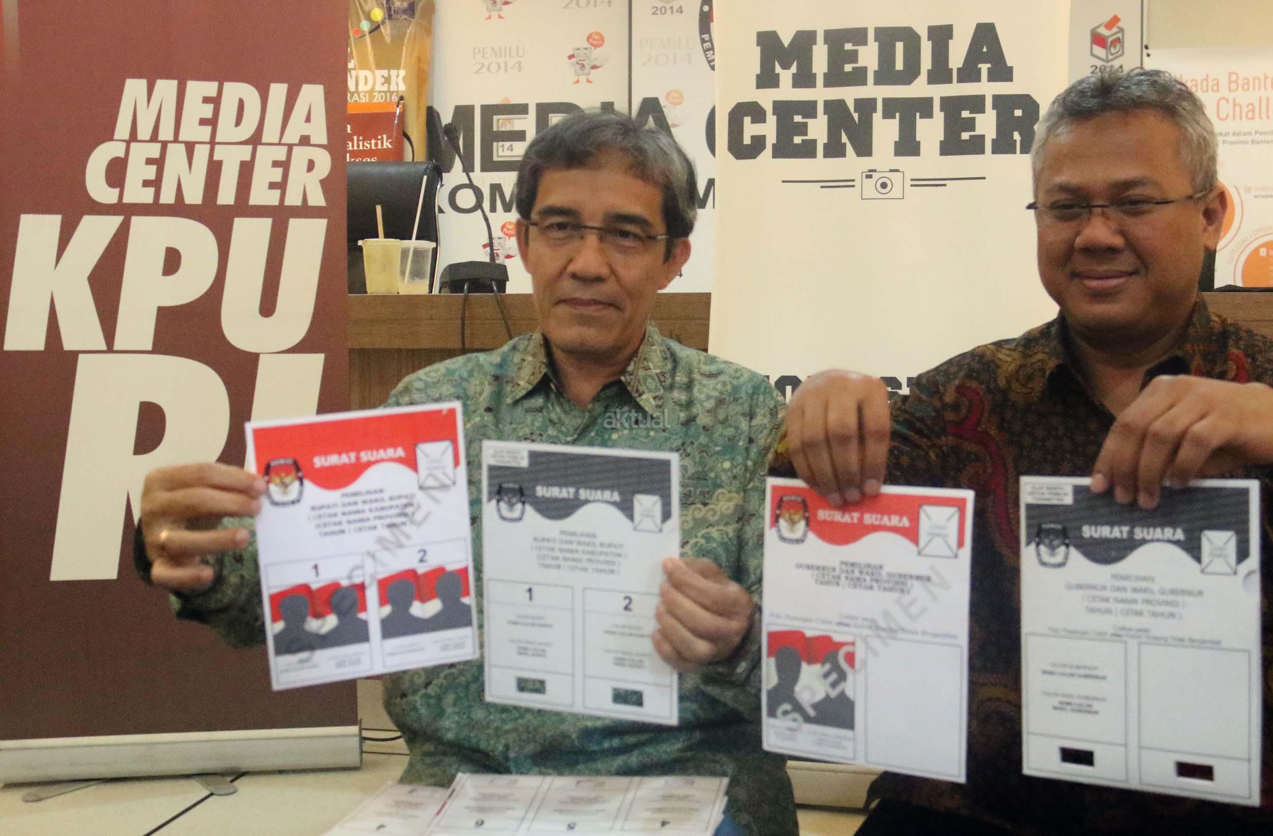 Komisioner KPU RI Hadar Nafis Gumay (kiri) bersama Komisioner KPU RI Arief Budiman (kanan) menunjukkan surat suara dan template surat suara Braille untuk para penyandang disabilitas dalam Pilkada di Kantor KPU Pusat, Jakarta, Rabu (4/1/2016). Komisi Pemilihan Umum menyediakan template surat suara Braille bagi pemilih penyandang tunanetra dimasing-masing TPS. Nantinya, surat suara akan diselipkan ke dalam template untuk kemudian dicoblos oleh pemilih. AKTUAL/Munzir