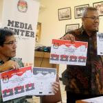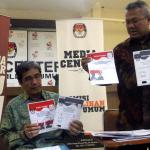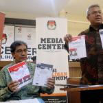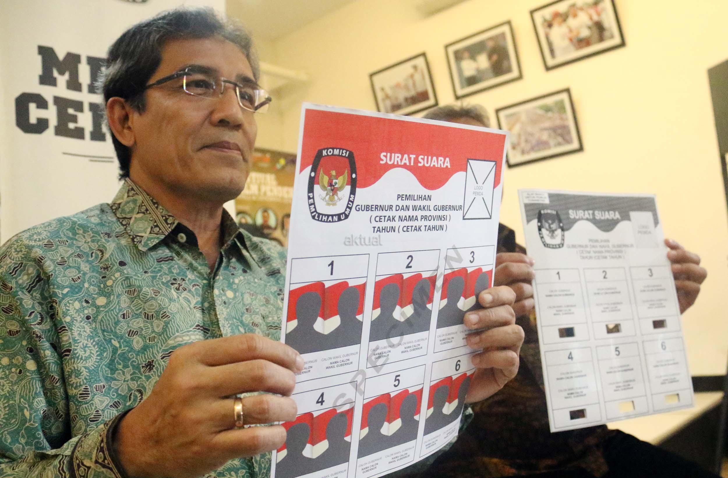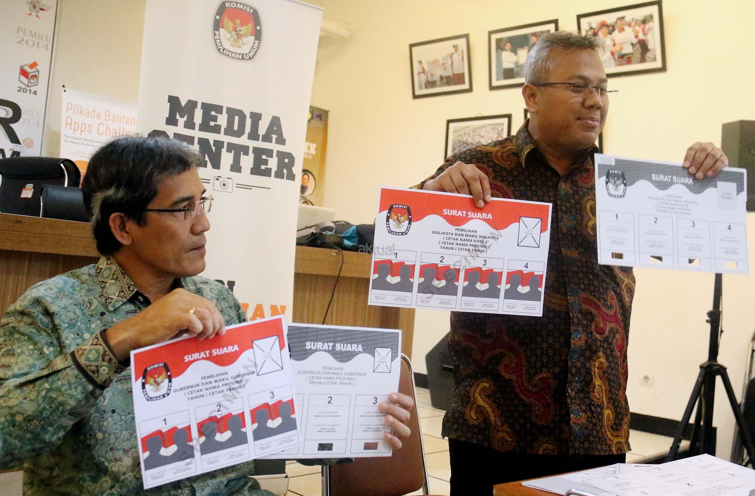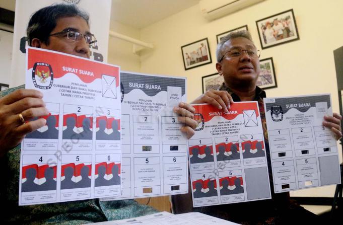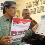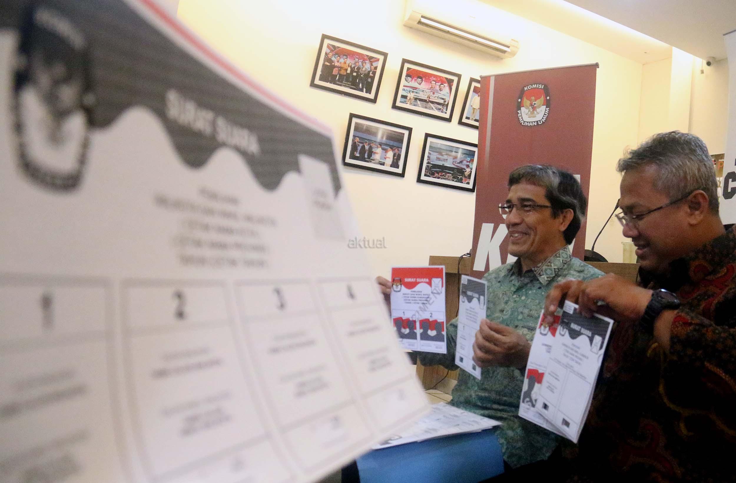 Komisioner KPU RI Hadar Nafis Gumay (kiri) bersama Komisioner KPU RI Arief Budiman (kanan) menunjukkan surat suara dan template surat suara Braille untuk para penyandang disabilitas dalam Pilkada di Kantor KPU Pusat, Jakarta, Rabu (4/1/2016). Komisi Pemilihan Umum menyediakan template surat suara Braille bagi pemilih penyandang tunanetra dimasing-masing TPS. Nantinya, surat suara akan diselipkan ke dalam template untuk kemudian dicoblos oleh pemilih. AKTUAL/Munzir
