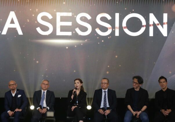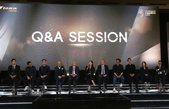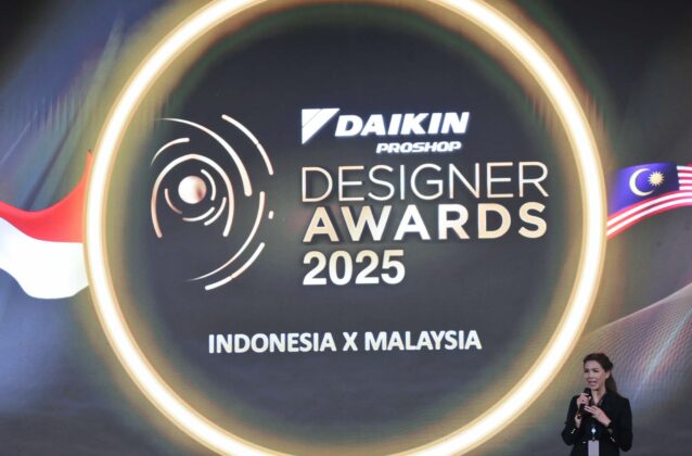 Presiden Direktur PT Daikin Airconditioning Indonesia Shinji Miyata, Managing Director Daikin Malaysia Sales and Service Lawrence Song dan Sales Manager Daikin Proshop PT Daikin Airconditioning Indonesia Selvi Ani Yongnata bersama dewan juri DAIKIN Proshop Designer Award 2025 foto bersama usai konferensi pers Daikin Proshop Designer Award 2025 dengan tema “Originality” di Jakarta, Jumat (25/4/2025).
