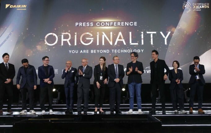 Presiden Direktur PT Daikin Airconditioning Indonesia Shinji Miyata (kelima dari kanan), Managing Director Daikin Malaysia Sales and Service Lawrence Song (kelima dari kiri) dan Sales Manager Daikin Proshop PT Daikin Airconditioning Indonesia Selvi Ani Yongnata (tengah) bersama dewan juri DAIKIN Proshop Designer Award 2025 saat konferensi pers Daikin Proshop Designer Award 2025 dengan tema “Originality” di Jakarta, Jumat (25/4/2025).