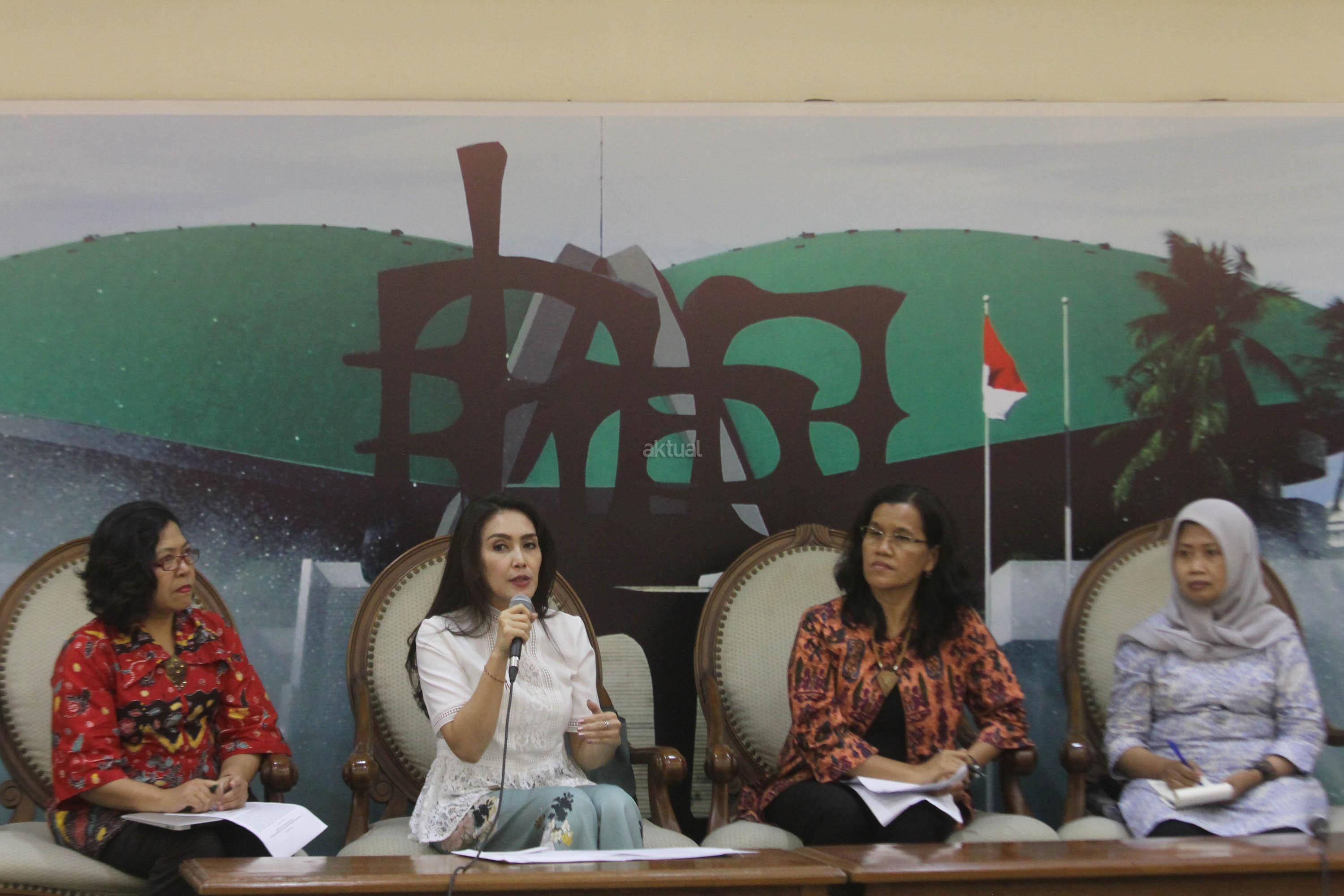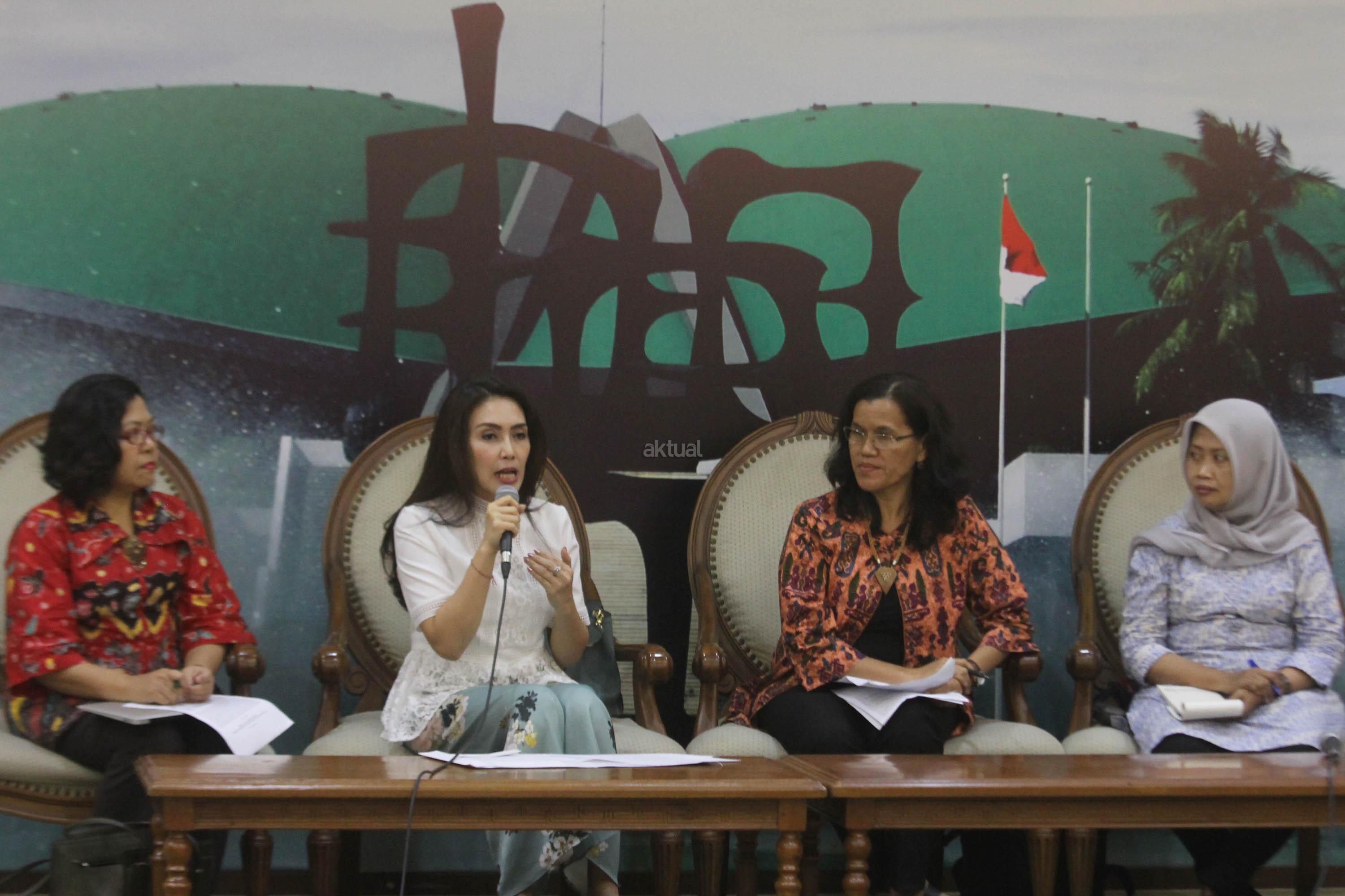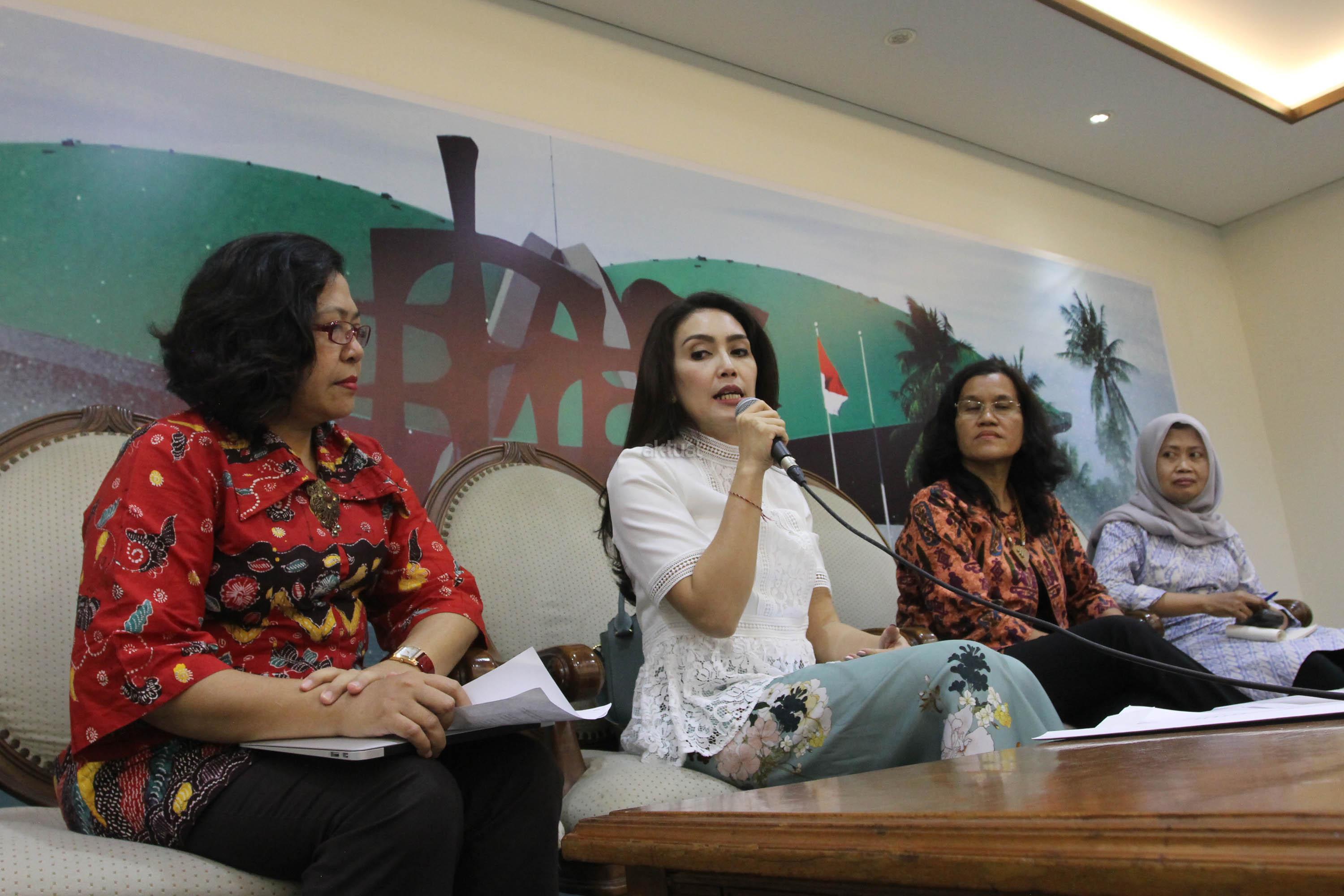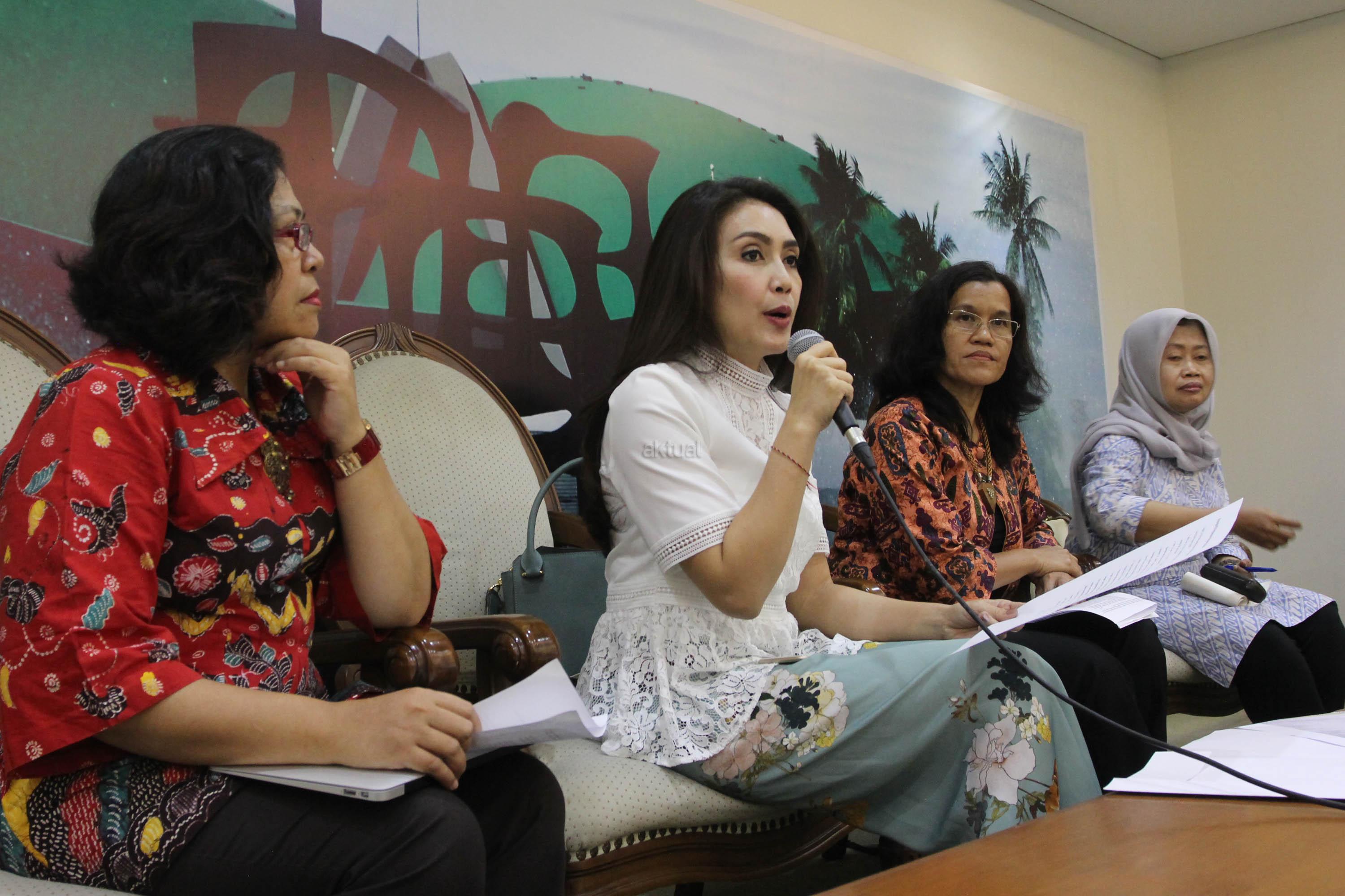 (dari kiri) Wakil Ketua Komnas HAM Siti Nurlaila, Anggota Komisi VI Fraksi PDIP Rieke Diah Pitaloka, Ketua Komnas Perempuan Azriana dan Komisioner Komnas Perempuan Masruhah, memberikan keterangan pers soal Rancangan Undang Undang (RUU) Penghapusan Kekerasan Seksual, di Gedung Nusantara III, Kompleks Parlemen, Jakarta, Jumat (2/6). Dalam keterangannya mereka yang merupakan Lembaga Nasioanl Hak Azasi Manusia, yaitu Komisi Nasional Anti Kekerasn Terhadap Perempuan dan Komisi Nasional Hak Azasi Manusia dengan DPR, mendesak Presiden segera menerbitkan Surat Presiden (Surpres) terhadap RUU Penghapusan Kekerasan Seksual, mendesak Kementerian terkait membuka partisipasi publik dalam pembahasan Daftar Inventaris Masalah (DIM) dan mendorong masyarakat sipil mengawal proses pembahasan RUU ini. AKTUAL/Tino Oktaviano