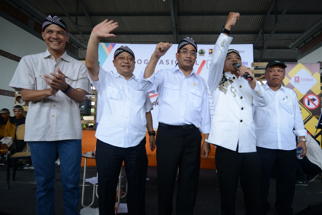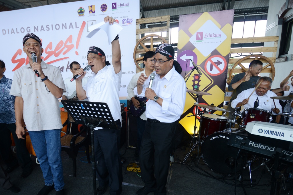 Direktur Utama PT Bank Tabungan Negara (Persero) Tbk. Maryono, Menteri Perhubungan Budi Karya, Menteri PU PR Basuki Hadimuljono, Gubernur Jawa Tengah Ganjar Pranowo bernyayi bersama warga setempat usai Dialog yang bertajuk Sukses Indonesia yang digelar di Museum Kereta Api Ambarawa, Jawa Tengah, Minggu (15/10). Sebagai Bank yang fokus pada KPR, Bank BTN berperan selaku integrator dalam program sejuta rumah tersebut. Sampai dengan pertengahan tahun 2017 Bank BTN telah mengucurkan kredit lebih dari Rp.155 Triliun untuk mendukung pengadaan rumah rakyat lebih dari 1,44 juta unit rumah. AKTUAL/Eko S Hilman