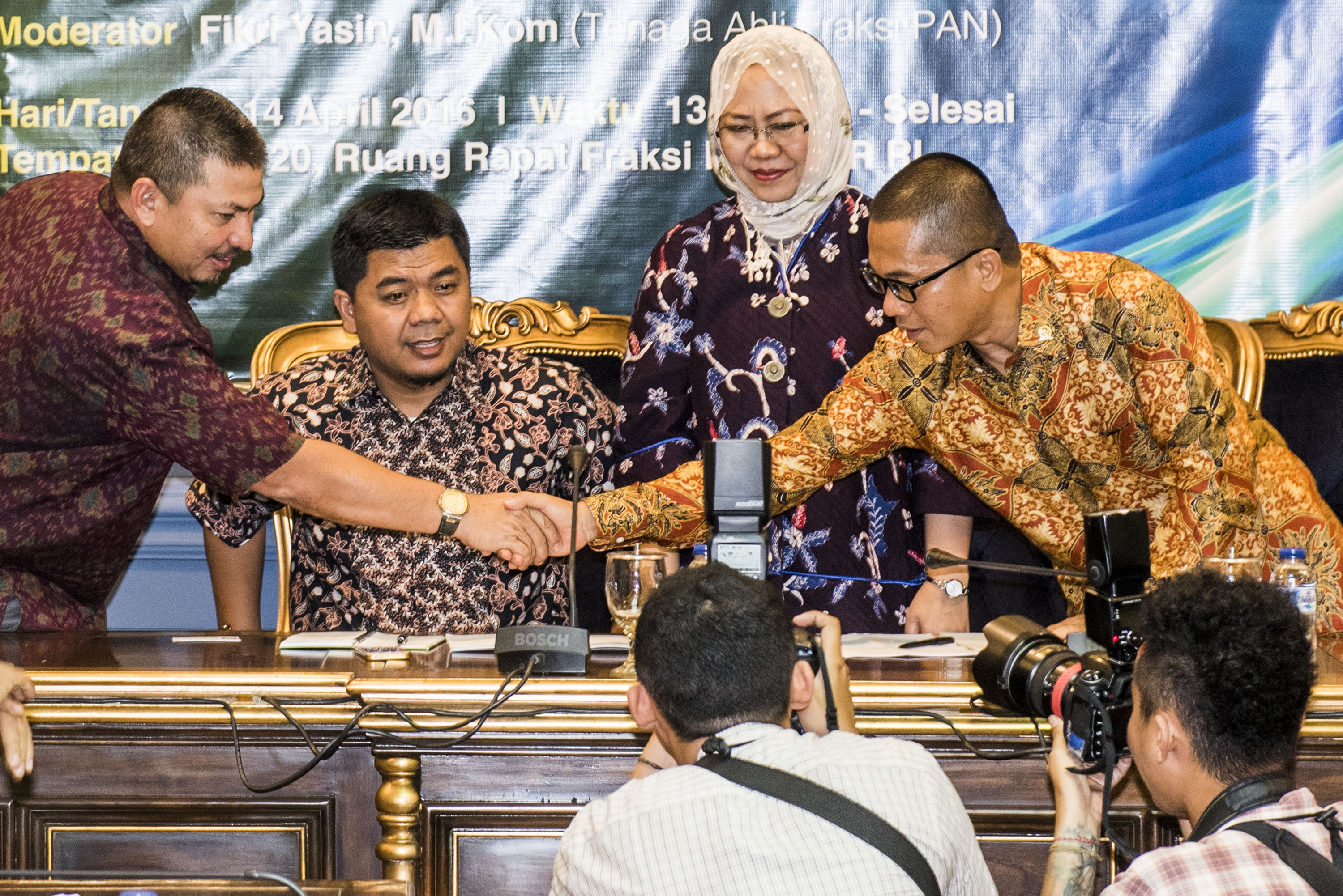 Ketua Fraksi PAN DPR RI Mulfachri Harahap (kiri) berjabat tangan dengan Anggota Komisi II DPR Fraksi PAN Yandri Susanto (kanan) yang disaksikan oleh pengamat politik LIPI Prof Siti Zuhro (kedua kanan) dan Komisioner KPU Juri Ardianto (kedua kiri) sebelum Dialog Revisi UU Pilkada di Fraksi PAN, Komplek Parlemen Senayan, Jakarta, Kamis (14/4). Dalam diskusi tersebut Fraksi PAN berharap revisi UU Pilkada ini akan menjadi revisi yang terakhir. ANTARA FOTO/M Agung Rajasa/foc/16.